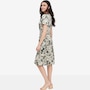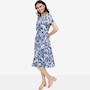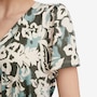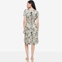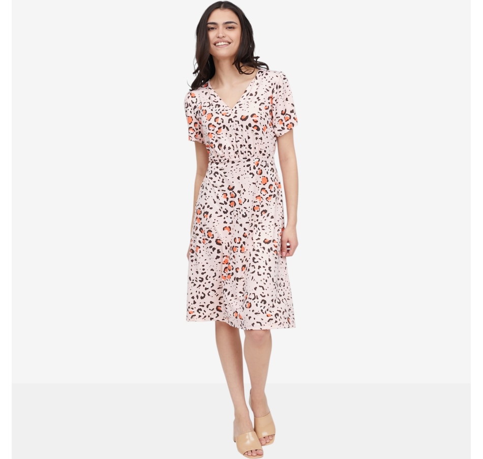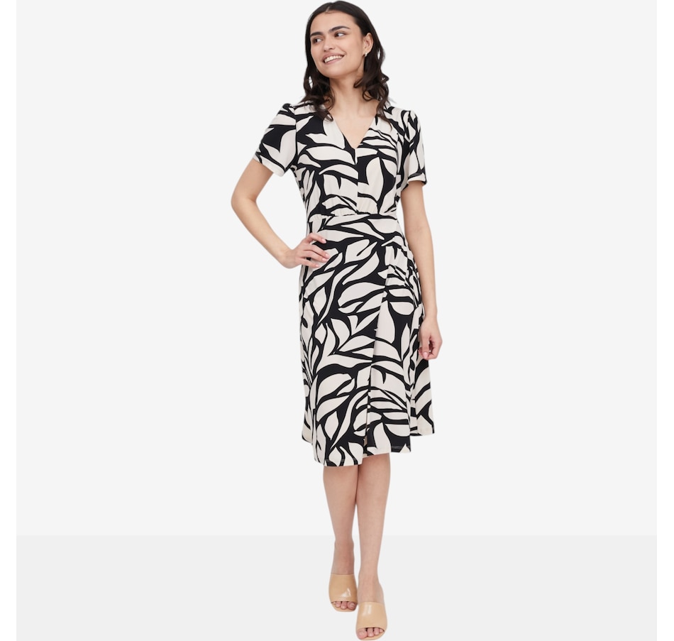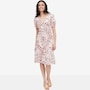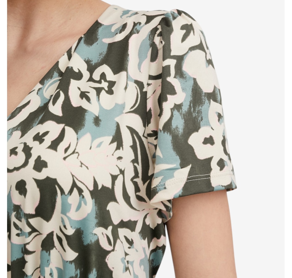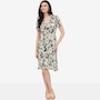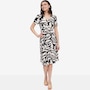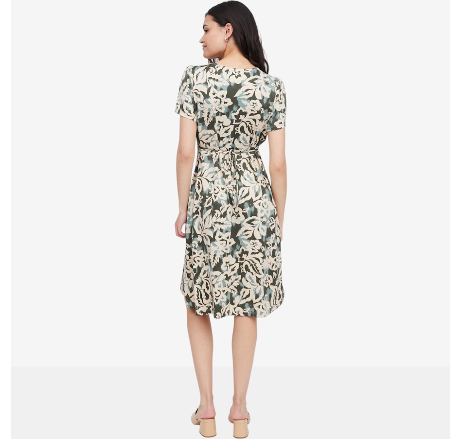 Step into effortless femininity with this printed Brazil knit short sleeve dress from Kim & Co., a beautifully crafted piece designed to flatter in all the right places. Made from the brand’s signature silky‑soft Brazil knit, this below‑the‑knee piece features a graceful v‑neckline and delicate shirring at the sleeve head, adding subtle texture and charm. A gently flared skirt enhances movement and flow, while the spaghetti ties sewn into the waist and side seams allow you to customize your shape for a beautifully defined silhouette. Additional shirring along the front waist seam brings even more softness and dimension, creating a romantic, ultra‑wearable look. It pairs beautifully with sandals, wedges, or even a light jacket.