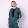 Add something vibrant and stylish to finish your fall look with this printed textured scuba long sleeve jacket from Kim & Co.