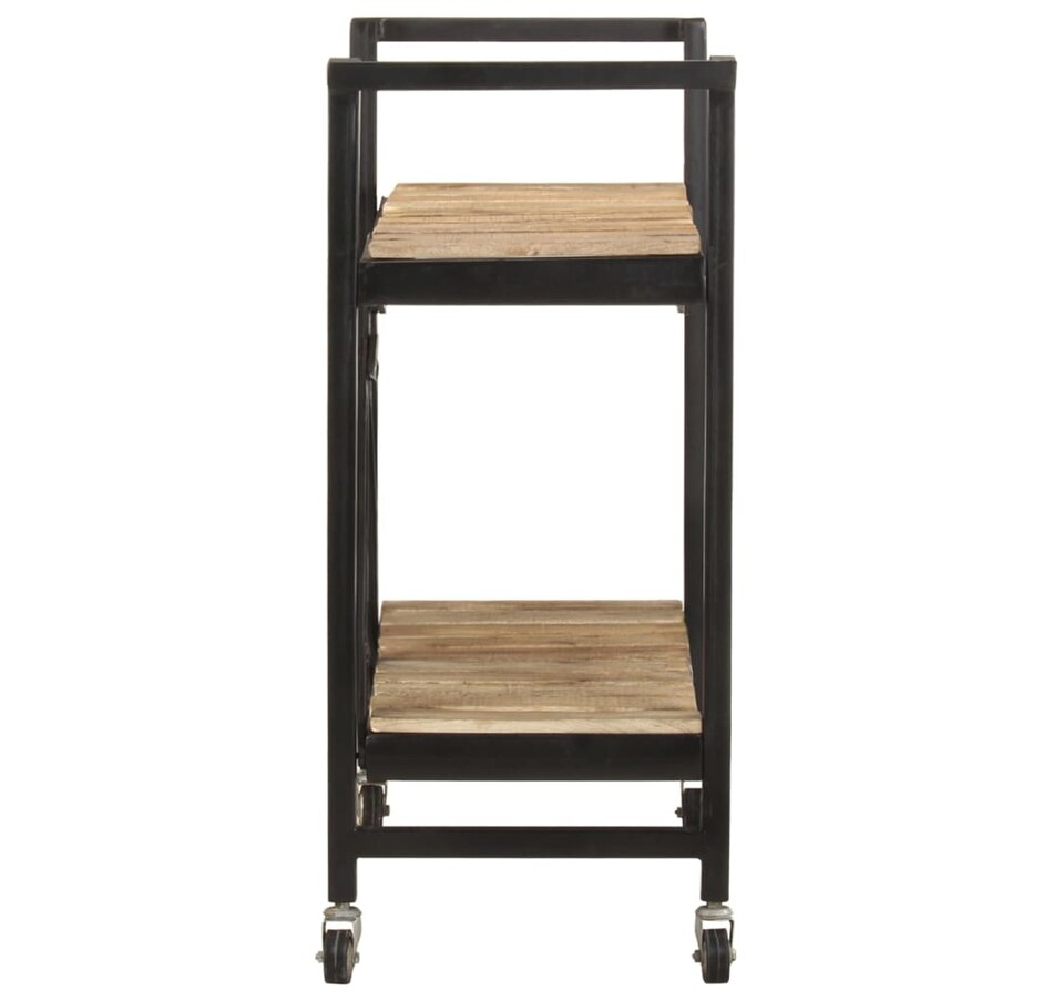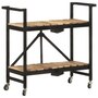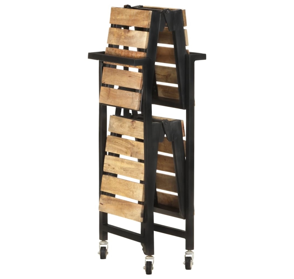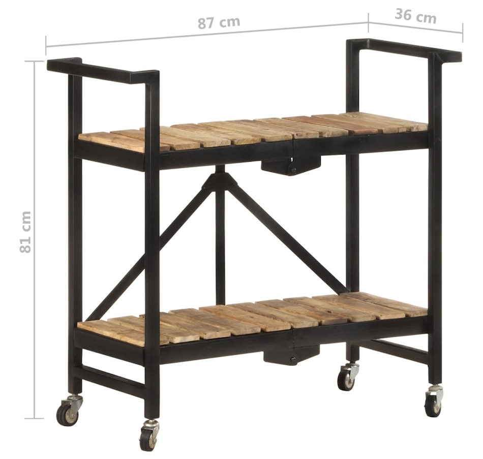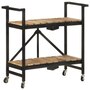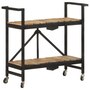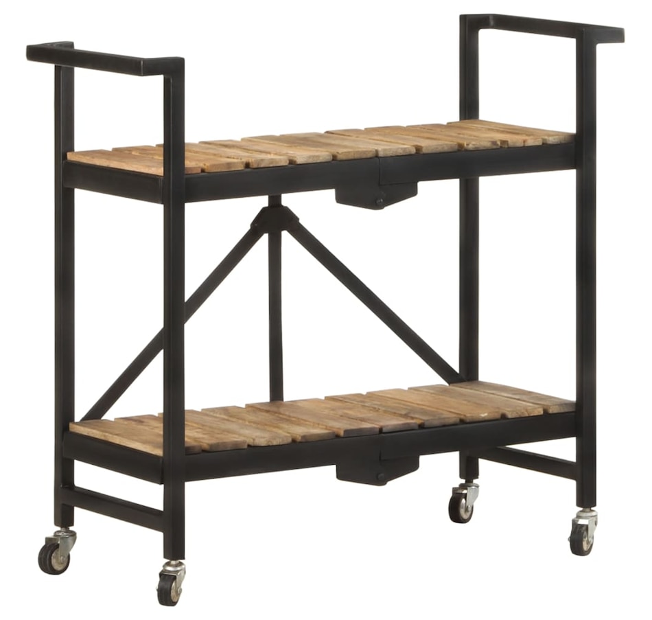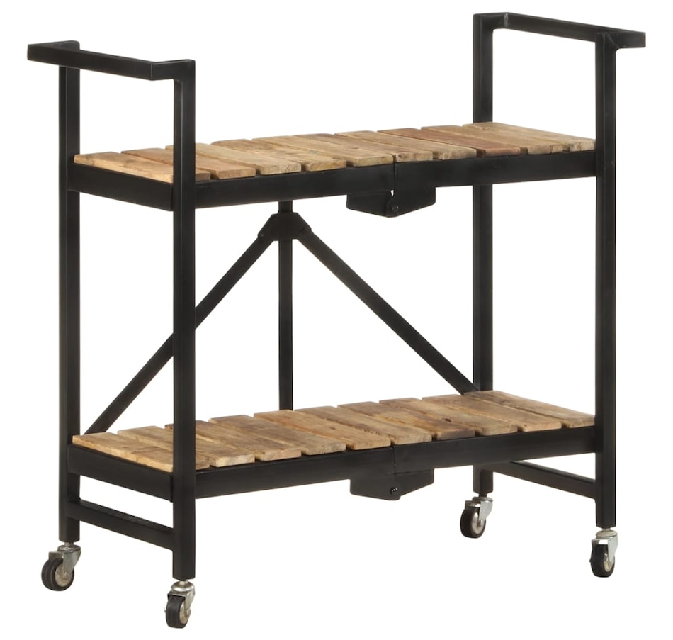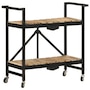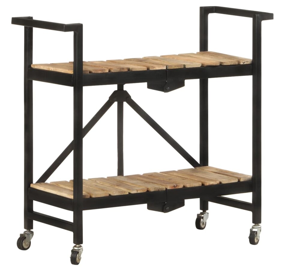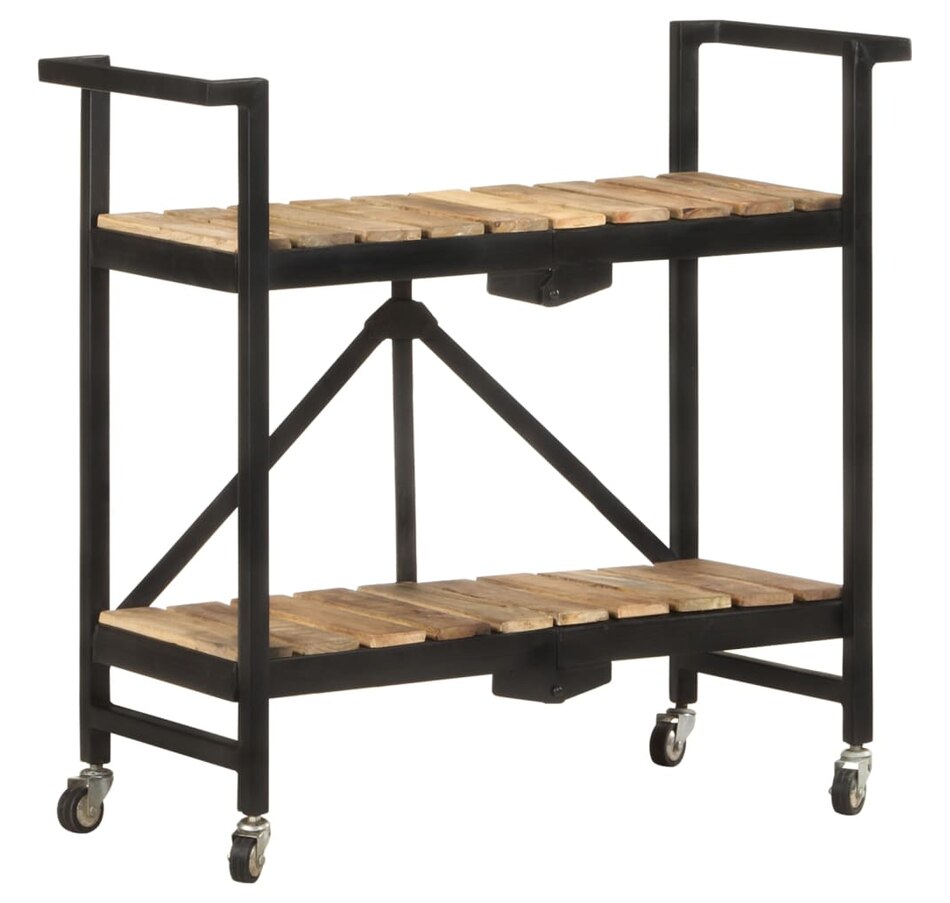 This kitchen cart adds a distinctive, rustic ambiance and provides additional storage space to your home. This kitchen cart is made of solid mango wood, a tropical hardwood with the strength to support weight. It resists the wear and tear of time, making it stable and durable. Additionally, the exquisite craftsmanship and beautiful wood grains make each piece slightly different from the next. The powder-coated steel frame also adds to its sturdiness. This storage cart features 2 compartments to place food, bottles, and other essential items within easy reach. With its foldable design, the shelf cart can be easily stored away when not in use. Additionally, the kitchen rack is equipped with flexible wheels for easy movement. Important note: Colors vary from piece to piece, making each wooden kitchen cart unique.