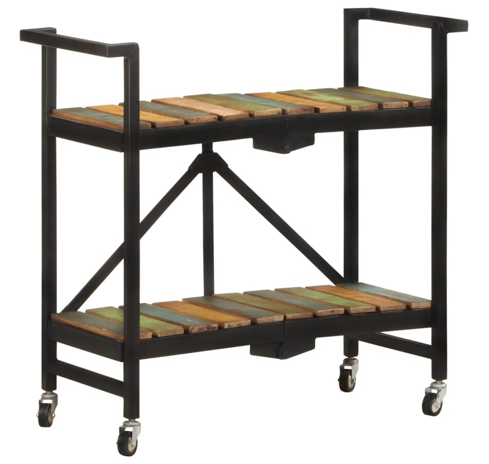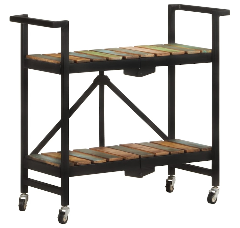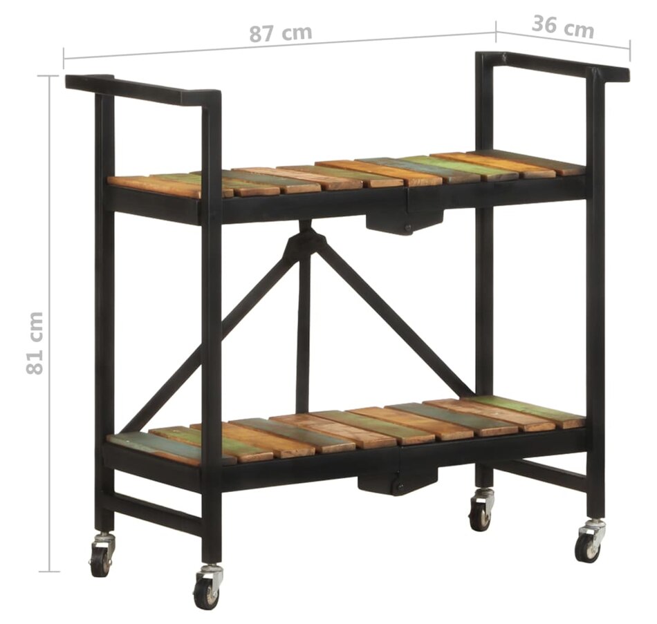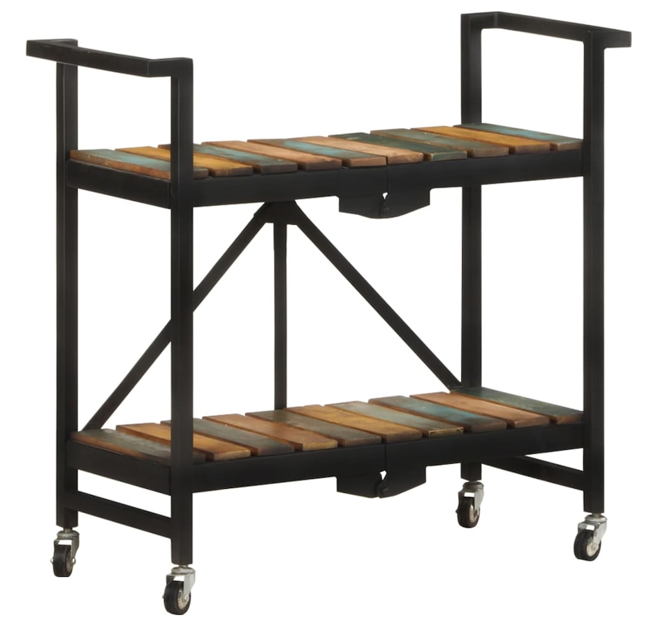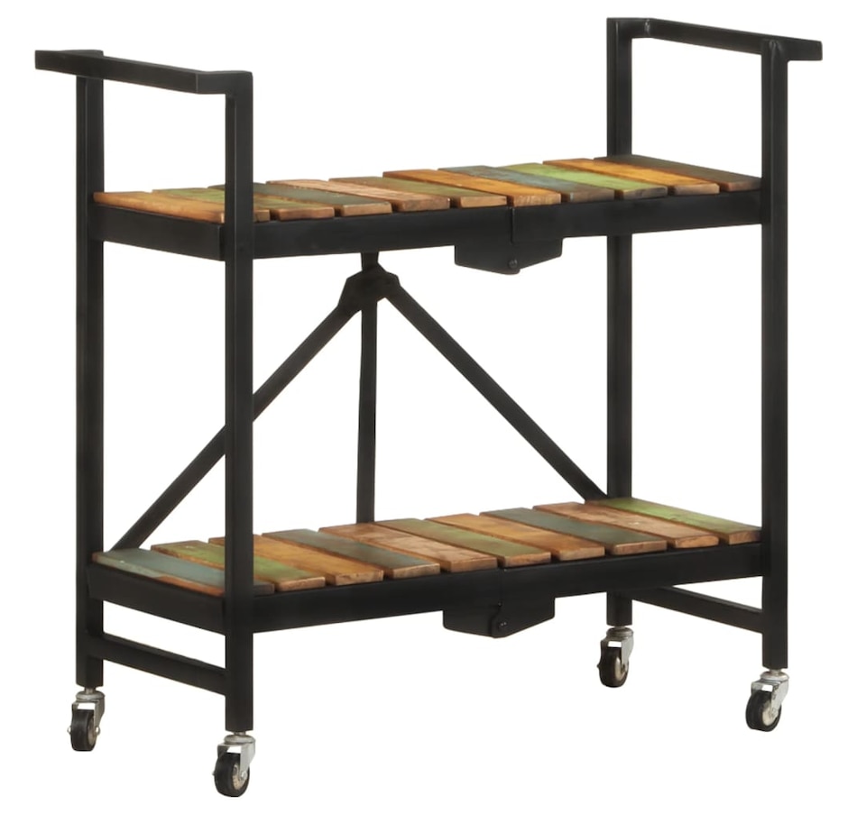This kitchen cart adds a distinctive, rustic ambiance and provides additional storage space to your home. This kitchen cart is made from solid reclaimed wood, sourced from the joists, floors and support beams of old demolished buildings . Additionally, it can consist of different types of wood such as teak, hardwood, tropical wood, mango wood, etc. This means that reclaimed wood retains the characteristics of these different types of wood. Reclaimed wood is already aged, weathered and dried. Therefore, it does not shrink or bend. The powder-coated steel frame also adds to its sturdiness. This storage cart features 2 compartments to place food, bottles, and other essential items within easy reach. With its foldable design, the shelf cart can be easily stored when not in use. Additionally, the kitchen rack is equipped with flexible wheels for easy movement. Important note: Colors vary from piece to piece, making each wooden kitchen cart unique.