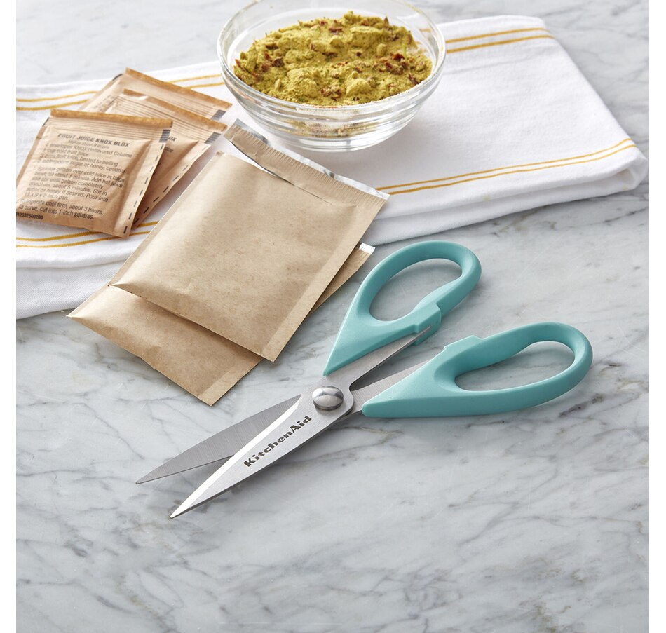 KitchenAid Aqua All-Purpose Shears are great for a variety of household cutting tasks. The sharp stainless steel blades deliver superior performance and feature micro serrations on the edge for enhanced cutting.