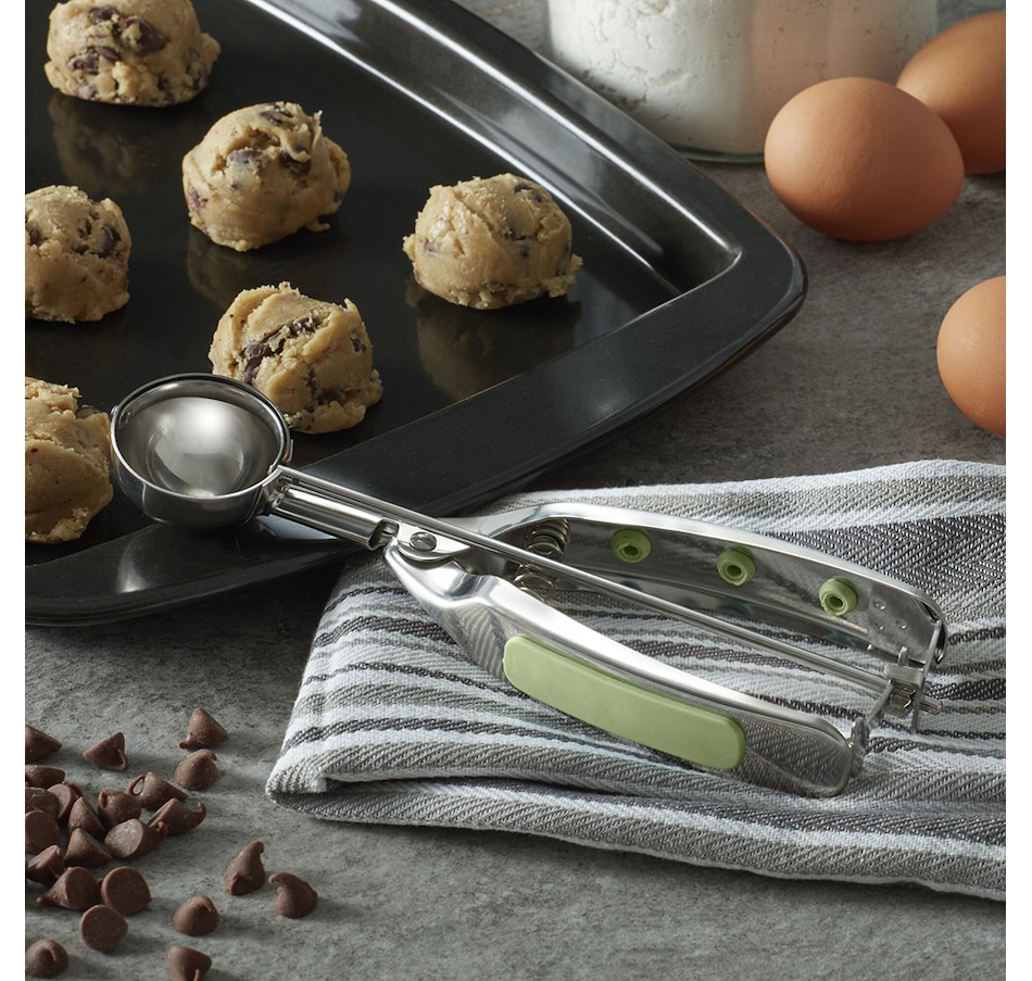 This cookie dough scoop from KitchenAid is crafted from durable stainless steel and has a soft-grip handle for comfort and durability. The spring-loaded mechanism releases a measured "dough" scoop with a squeeze of the handle.