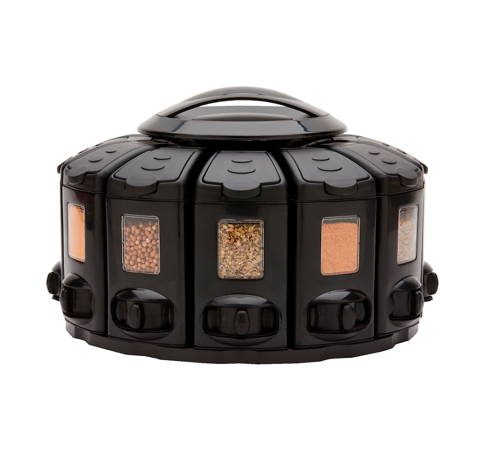 • Includes 12 removable spice compartments on a rotating base and 55 spice labels