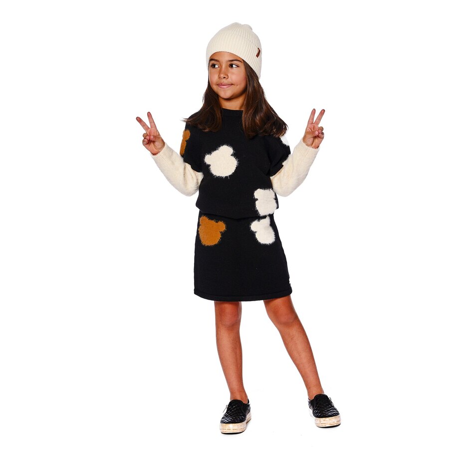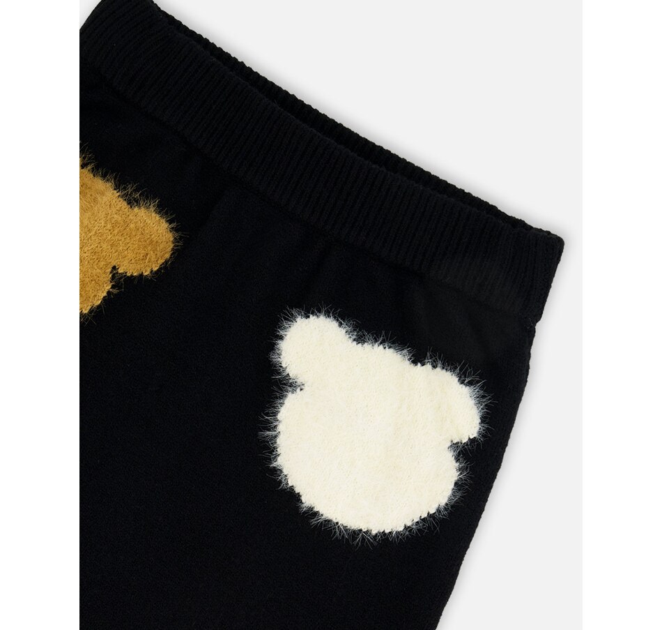 Our Knitted Skirt Black With Bear Intarsia is cozy, playful, and packed with personality. This flared knit skirt features two fuzzy-textured jacquard bear heads in contrasting tones on the front, adding a whimsical twist to a comfy silhouette. Pair it with any top from our "Teddy Bears Are Ours" collection for a charming and cuddly look.
