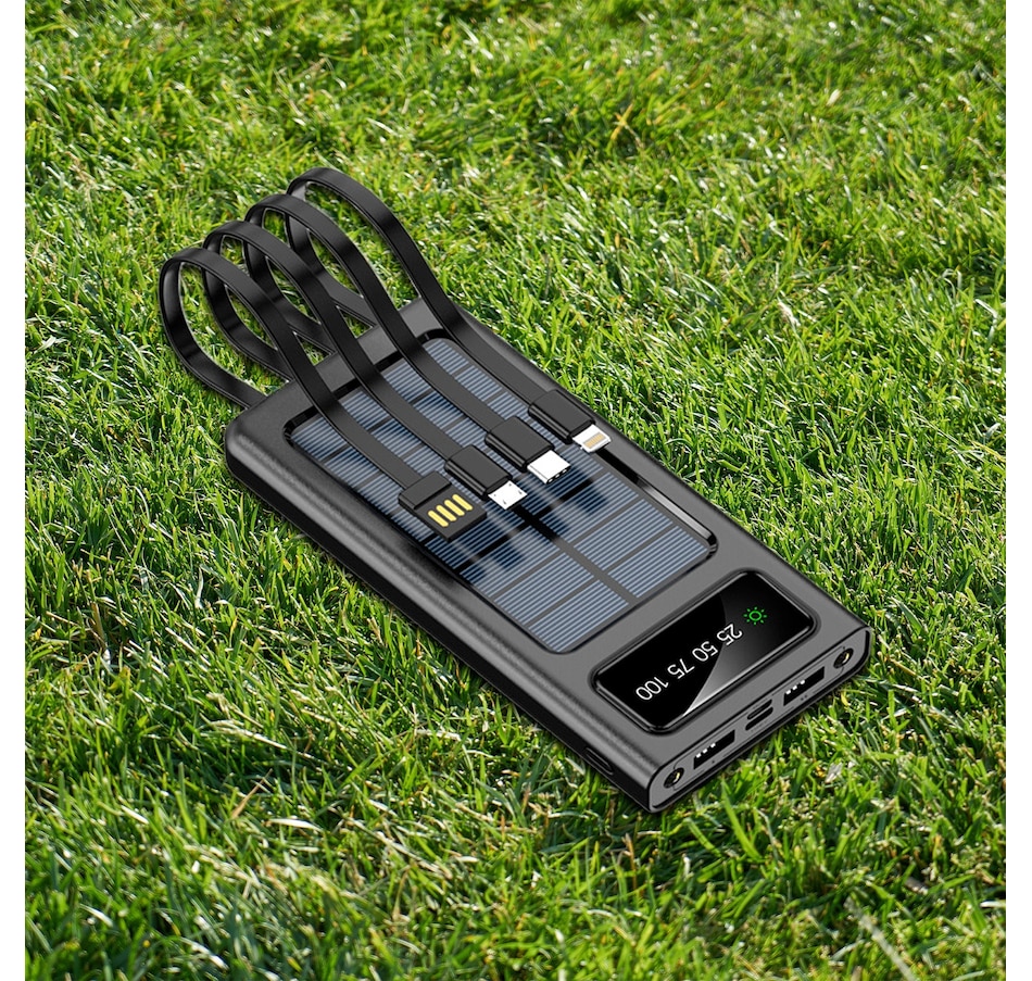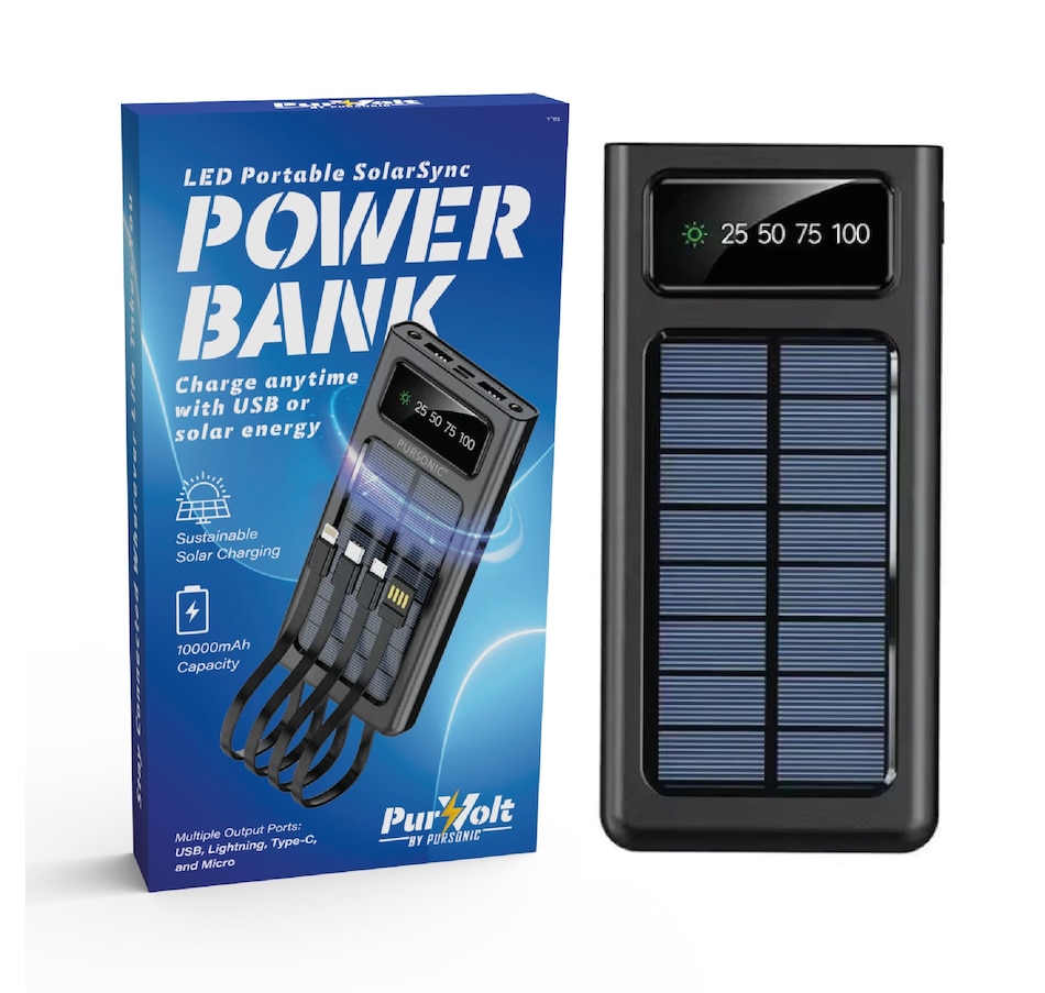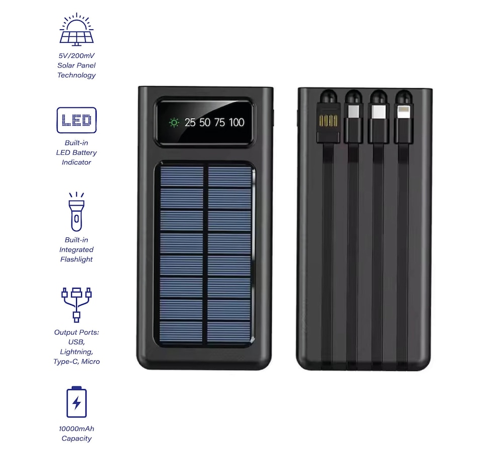 Stay powered wherever you go with the LED Portable Solarsync Power Bank. Designed for life on the move, it combines solar technology, multi-port charging, and rugged durability to keep your devices ready.Key FeaturesSolar Charging Technology: 5V/200mV solar panel lets you harness sunlight to recharge on the go.1000 mAh Battery Capacity: Ideal for short-term charging or emergency situations.LED Battery Indicator: Quickly check your remaining power levels at a glance.Multi-Port Charging: Includes USB, Lightning, Type-C, and Micro ports for wide compatibility.Built-In Flashlight: A reliable light source for emergencies or outdoor adventures.Dustproof and Durable: Built to withstand tough environments and everyday use.Lightweight and Adventure-ReadyThis compact and portable power bank is lightweight, making it perfect for travel, camping, or your emergency kit. It fits easily into backpacks or pockets without adding extra weight.Why Choose Solarsync?Eco-Friendly Power: Harness the sun's energy for sustainable charging.Universal Compatibility: Charge multiple devices, from smartphones to tablets, with ease.Built for Tough Conditions: Dustproof, rugged, and ready for any adventure.Stay connected, prepared, and worry-free with the LED Portable Solarsync Power Bank—your perfect companion for power when and where you need it.