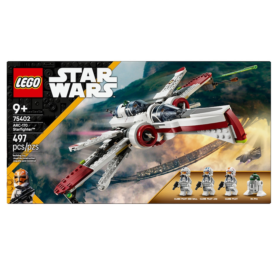 Recreate Star Wars: Revenge of the Sith™ missions with this ARC-170 Starfighter building toy (75402) for kids. A top LEGO® Star Wars™ gift idea for boys, girls and fans aged 9 and up, the brick-built starfighter features three opening cockpits, six wings, including four lever-operated adjustable wings for attack and cruise modes, and two spring-loaded shooters.