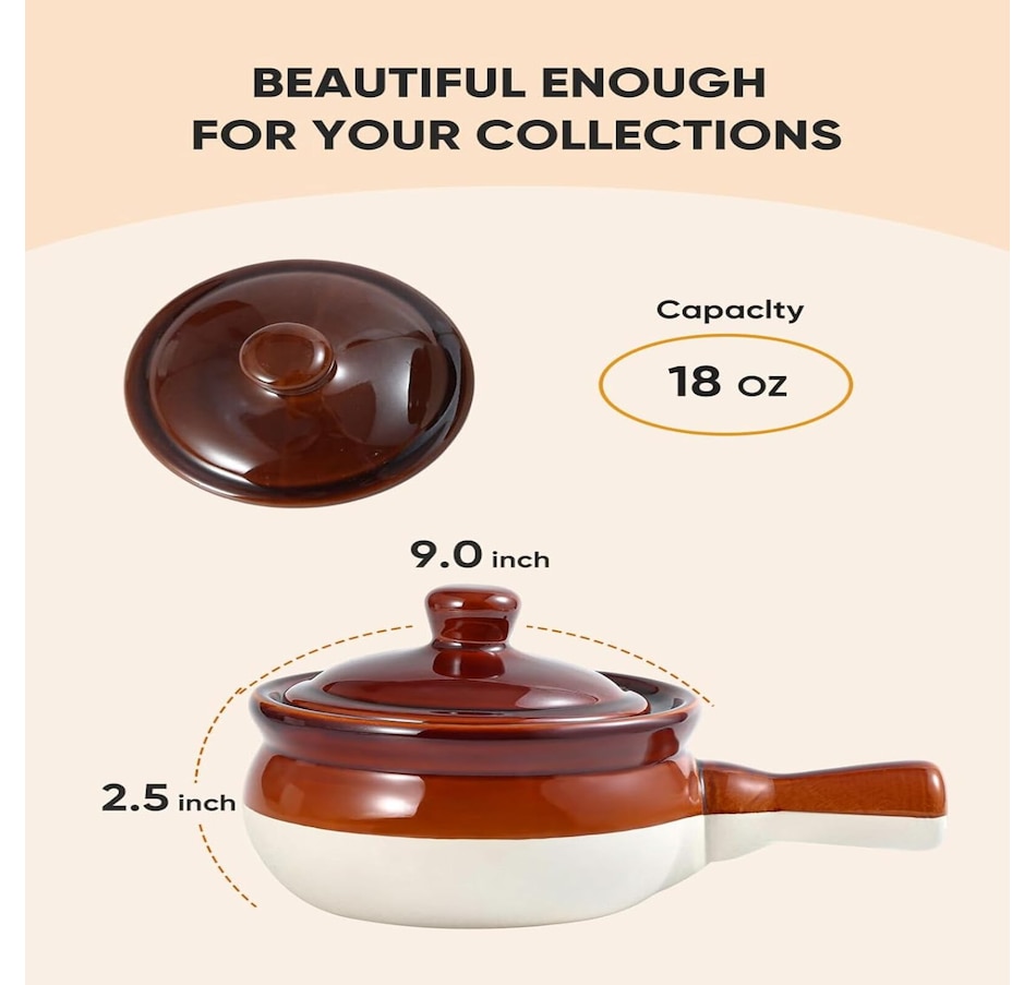 With Lid and Large Handle - French onion soup crocks with handle that you can easily take and will not be hot; The lids prevent spilling, store food and keep warm, and you no longer bother about dust when there is leftover dessert and soup.