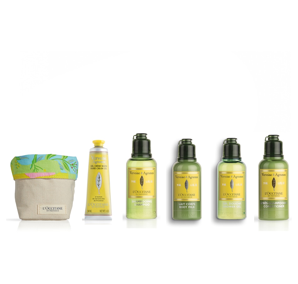 Verbena Essentials: To go! Citrus Verbena Hand Cream, Shower Gel, Body Milk, Shampoo and Conditioner all in a Verbena Patterned Basket.