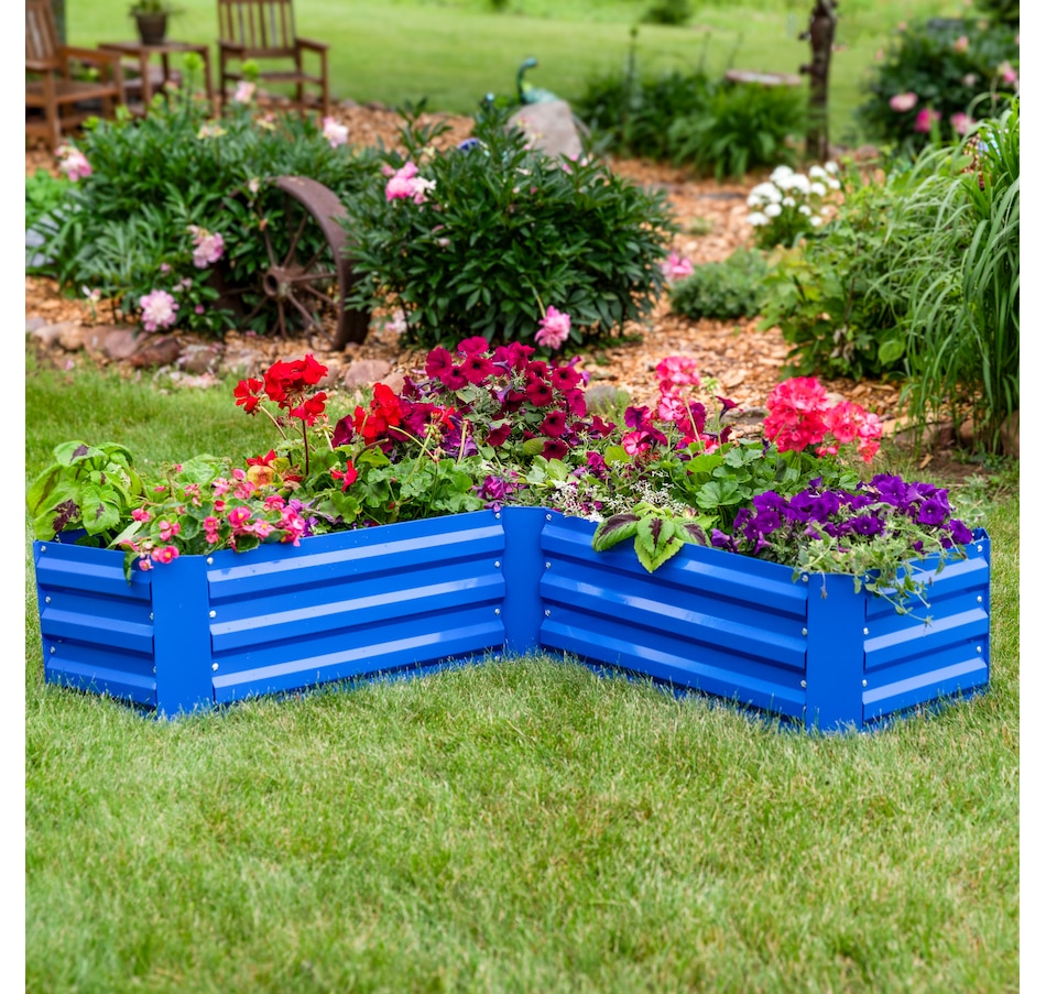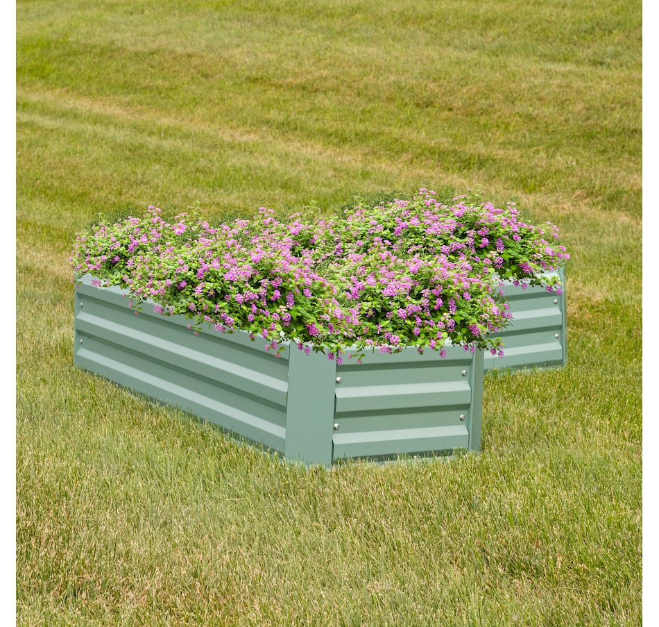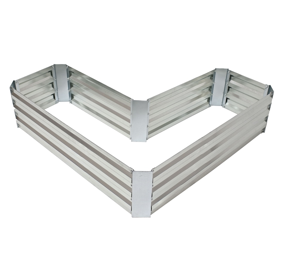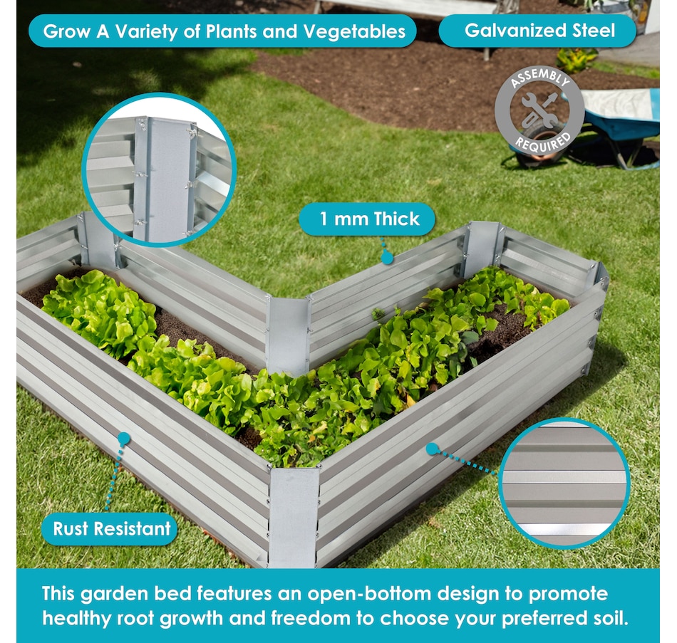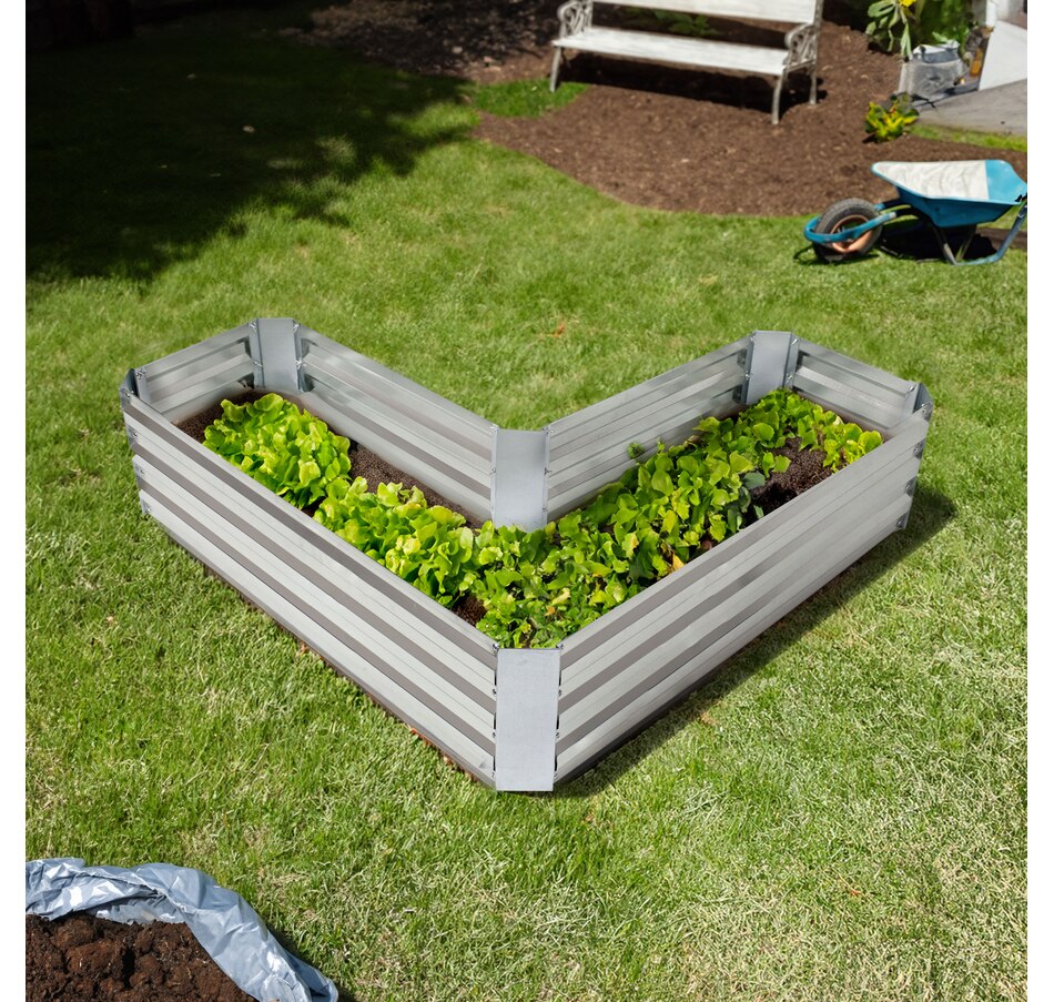This elegant yet durable L-shaped steel garden bed is a wonderful addition to any outdoor space. This raised metal garden bed provides a number of benefits for a variety of plants. The bottomless design allows proper drainage for improved root health, and the bed can be filled with whatever type of soil is best for specific plants to create an optimal growing environment. This stylish garden bed features a unique L-shaped design that makes it great for placing in the corner of a patio or garden. This sturdy raised garden bed is made of durable galvanized steel for lasting strength and beauty season after season. This sophisticated raised garden bed is a beautiful centerpiece for the backyard, garden, or patio.