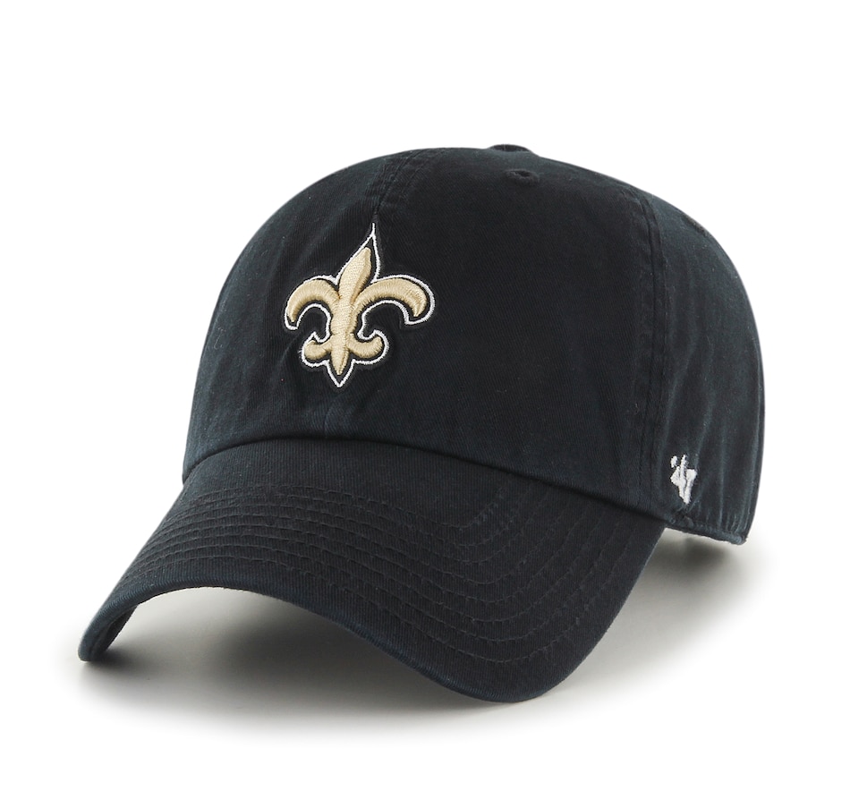 The Clean Up Team cap from '47 features a worn, washed-out look. The front boasts the New Orleans Saints logo in raised embroidery, and the back has a buckle strap with a small Saints logo flag.