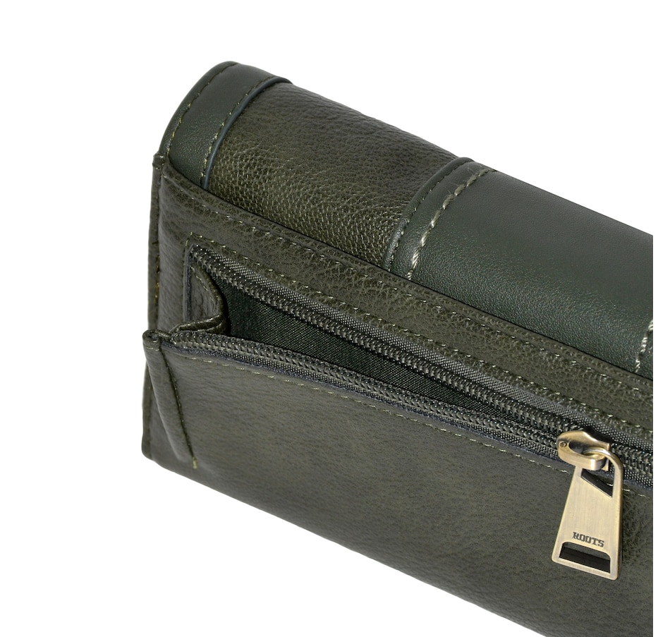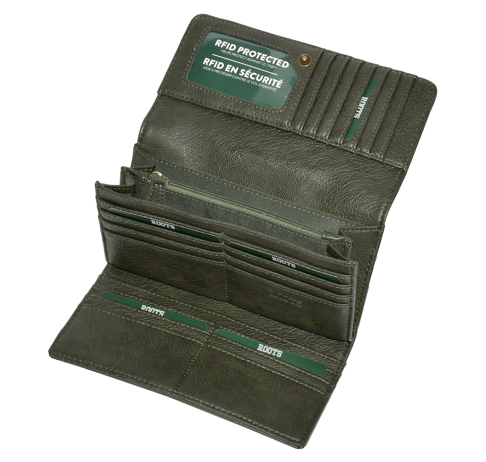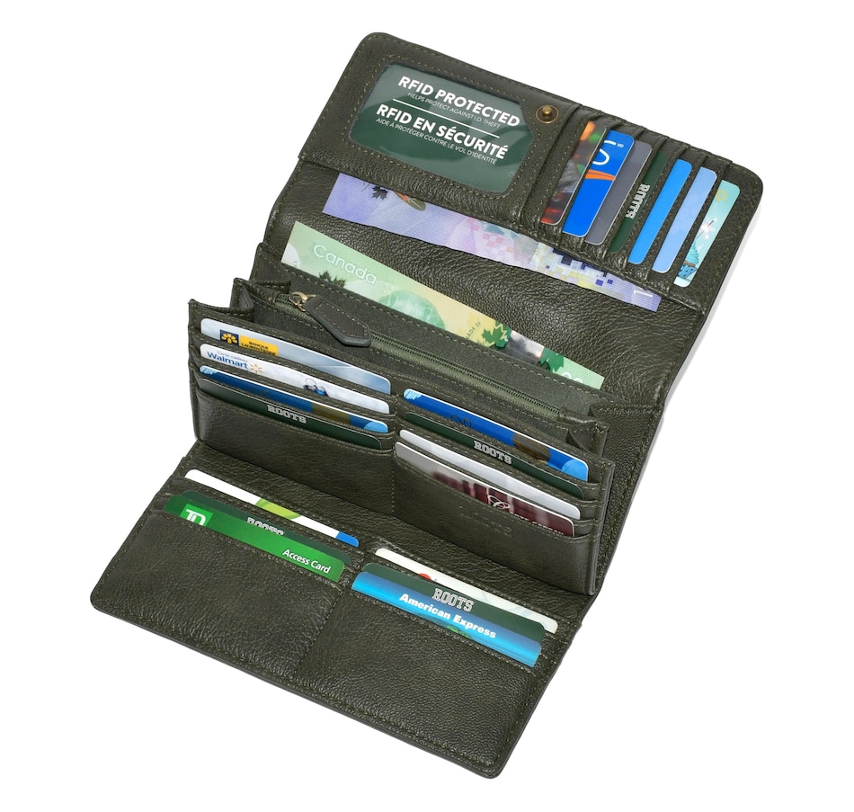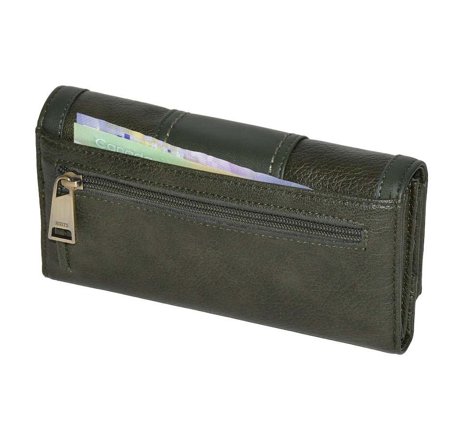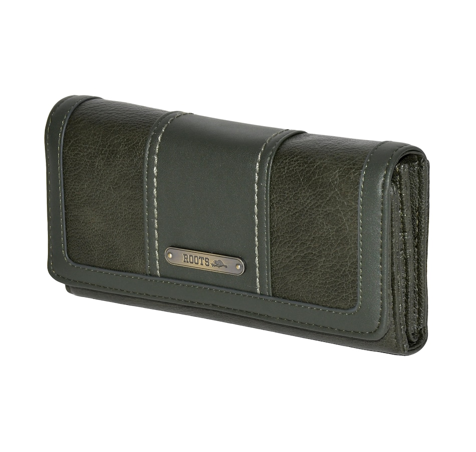 With the ROOTS ultimate pocket clutch wallet, staying organized is easy. It has 21 credit card slots, an ID window, two gusset pockets, and two zippered pockets, one on the inside and one on the outside. The back zip pocket is ideal for easy access to frequently used items. It also has a double metal snap closure to allow you to expand the size of your wallet. Finished in high-quality contrast PU leather, this wallet ensures that you can bring everything you need with you while also looking good.