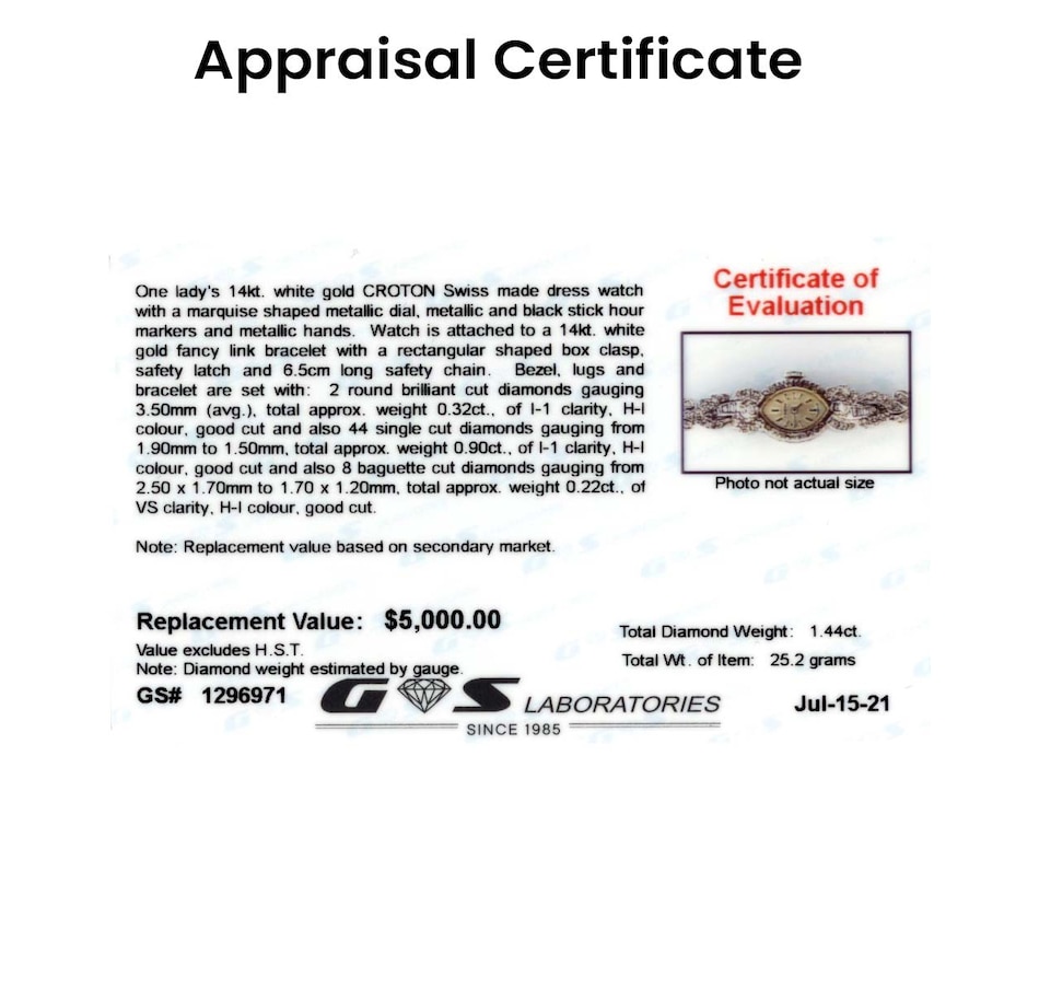 • Appraised Value: $5,000.00 (Appraisal certificate included). Please note: The replacement value is based upon real secondary market values and not comparable new watches.