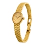 This sleek GENEVE Quartz Wristwatch is crafted in yellow gold and sports an oval-shaped yellow dial, gold stick hour markers at the 12, 3, 6 and 9 o'clock with remaining black stick hour marks and black hands. It has a V8 unadjusted 6 Jewels Swiss-made quartz movement numbered #978.002. The watch is attached to an Italian-made yellow gold textured tapered bracelet.
