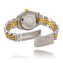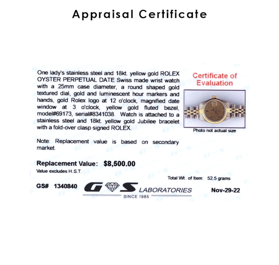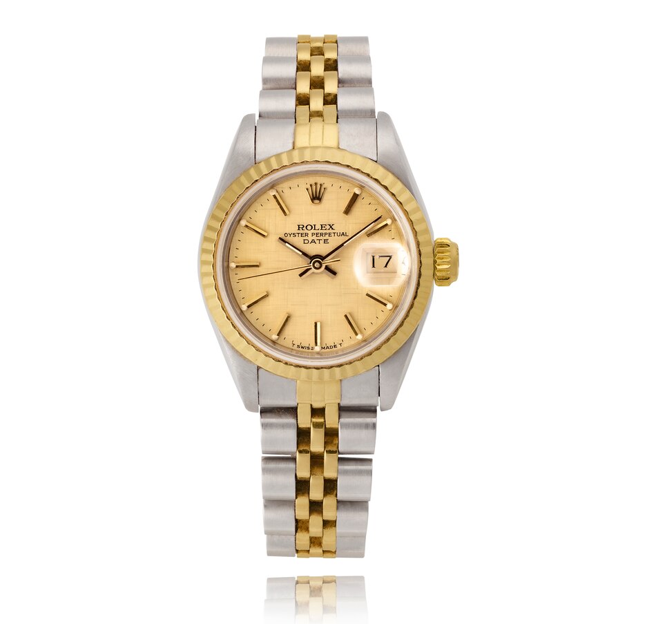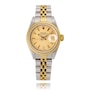 This lady's Swiss made ROLEX OYSTER PERPETUAL DATE wristwatch is crafted in stainless steel and beautiful yellow gold. It displays a round shaped gold textured dial, luminescent hour markers and hands and a fluted bezel. The ROLEX logo is at the 12 o'clock  and there is a magnified date window at the 3 o'clock. The model number is 69173 with serial #8341038 and the case diameter measures 25mm. The watch is attached to a stainless steel and 18K yellow gold Jubilee bracelet with a fold-over clasp, signed 'ROLEX'.