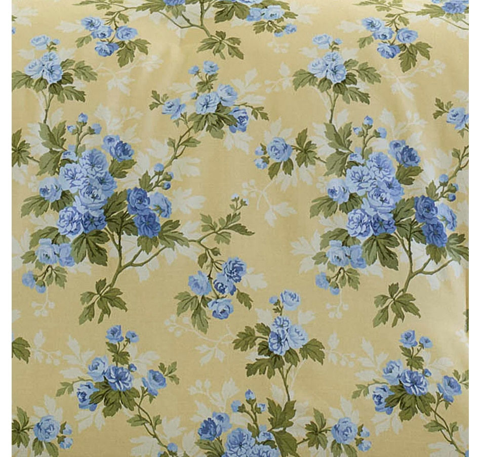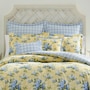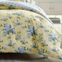 • The Laura Ashley Cassidy Comforter Bonus Set features a blue floral design printed on a yellow ground with a blue plaid reverse