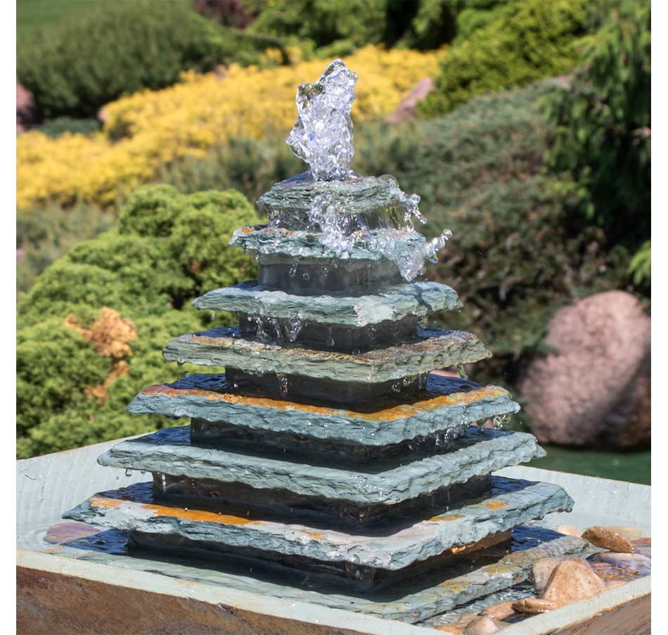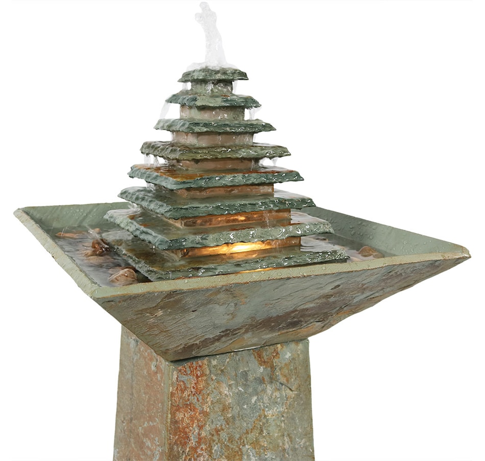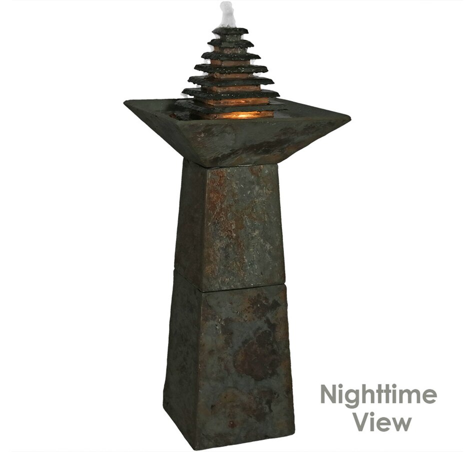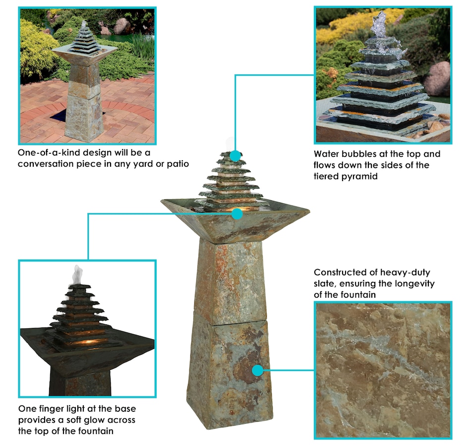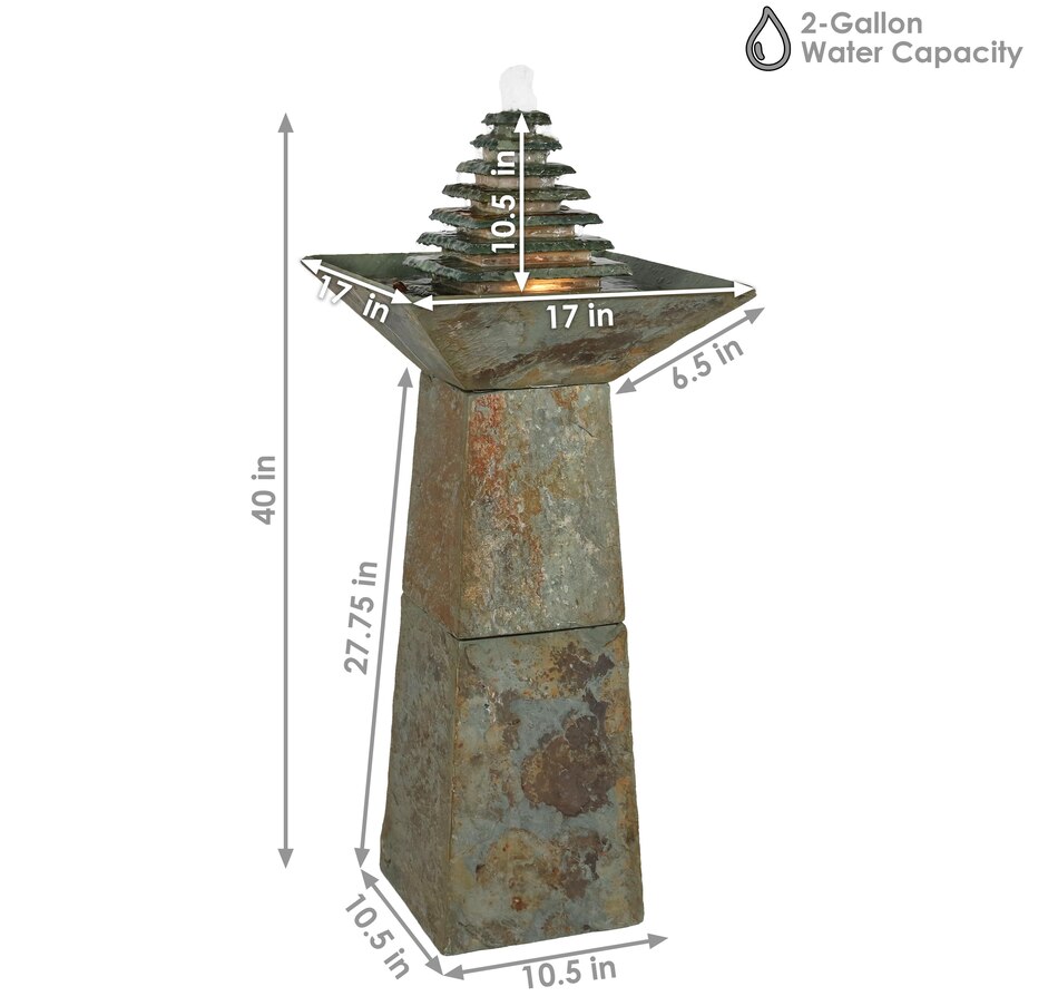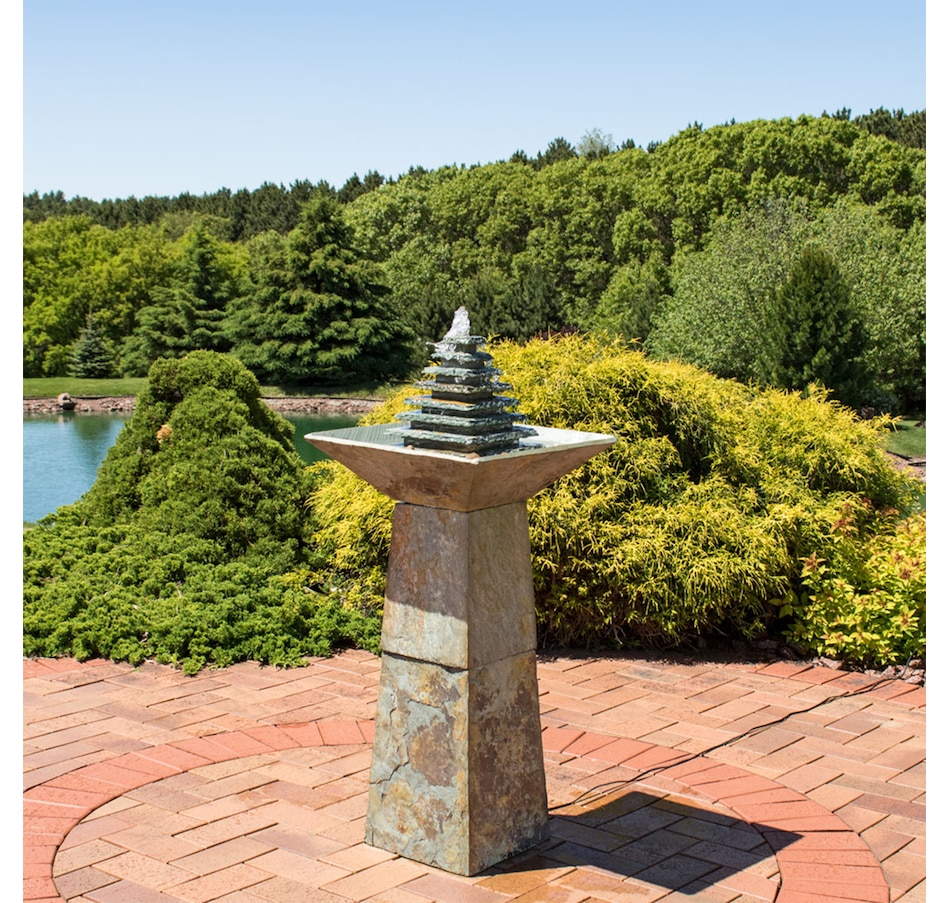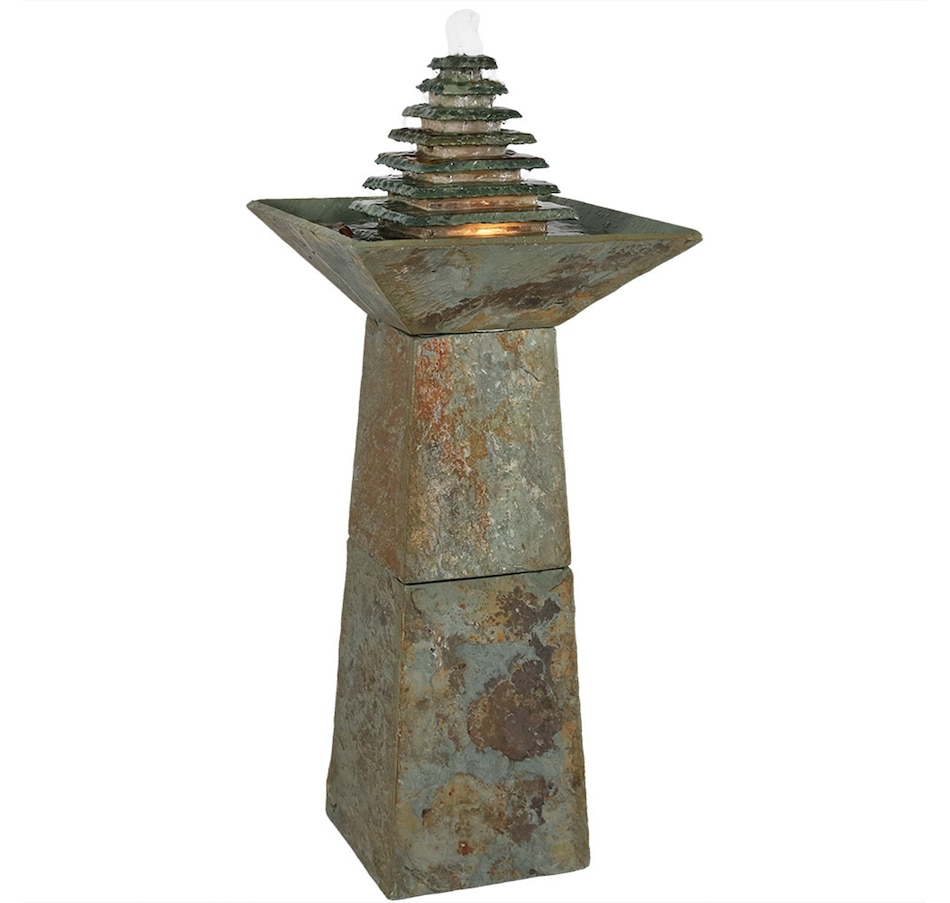 Bring a sense of calm and elegance to any outdoor space with this pyramid outdoor water fountain. Made from natural slate, each piece features distinct color and texture variations, adding unique character and organic beauty to patios, gardens, or landscaped areas. The clean, geometric pyramid shape offers a modern aesthetic while providing a timeless focal point. As water flows gently down the slate surface, it creates a soothing soundscape that promotes relaxation and enhances outdoor ambiance. The built-in electric pump ensures continuous water circulation, with no plumbing required for operation. Designed specifically for outdoor use, this fountain is weather-resistant and built to endure the elements while maintaining its natural charm. Whether placed in a backyard retreat or a landscaped entryway, this slate pyramid fountain blends modern design with the calming presence of water to transform any setting.
