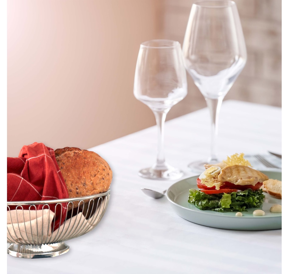 You've seen them in the best restaurants and the finest homes. These wire bread baskets feature a stainless steel non-tarnishing finish and a solid bottom. This basket is an 11.75" by 7.25" oval shape. Wrap that warm bread or those warm rolls in a soft cloth for a delicious presentation. Gift Boxed.