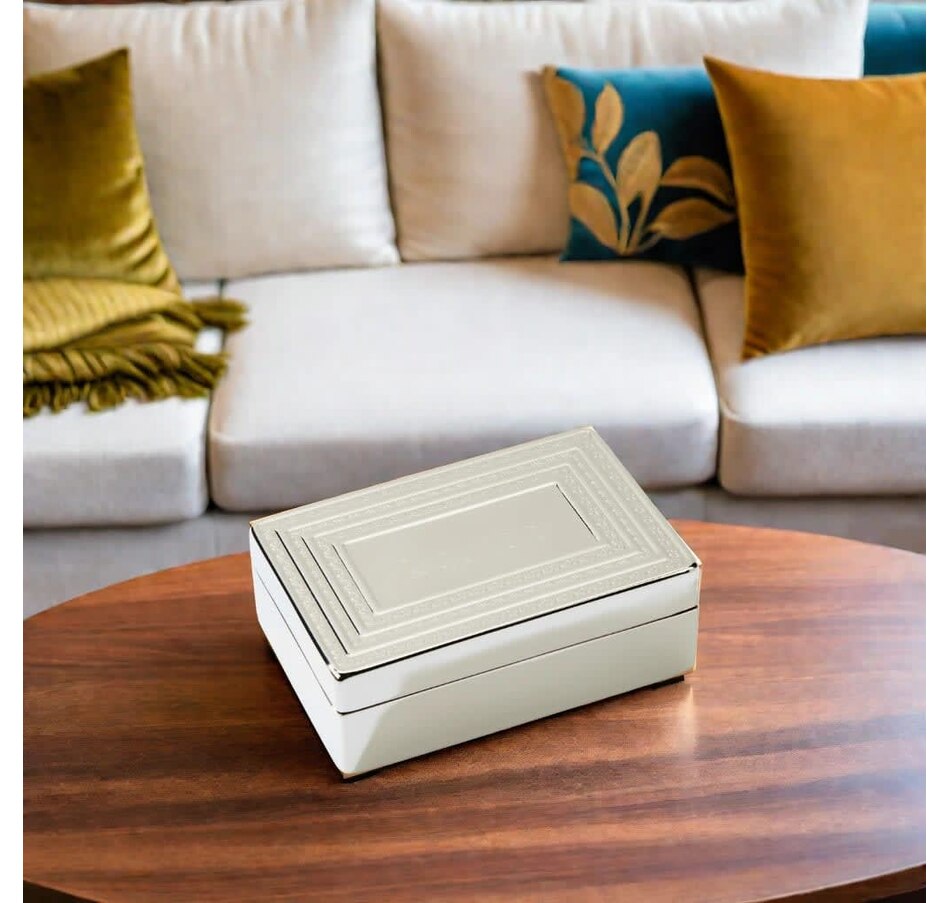 This vintage style rectangular 3" x 4.5" box is plated with a nickel plated finish. The cover is a lift top and the inside cover and bottom of the box are lined with a black flocked cloth. The center of the cover is not decorated, which allows you to have a nice area for an optional monogram to be engraved if desired. The box has a scroll design surrounding the plain center on the cover. Packed in a plain white gift box.