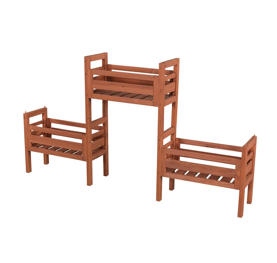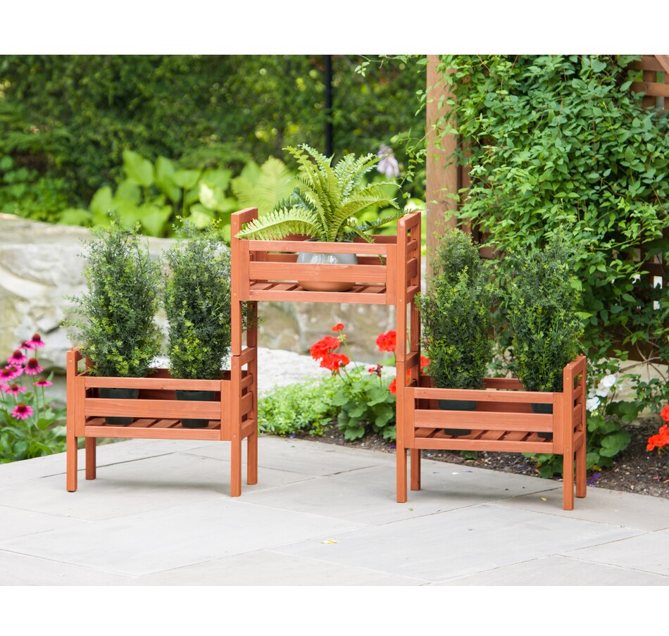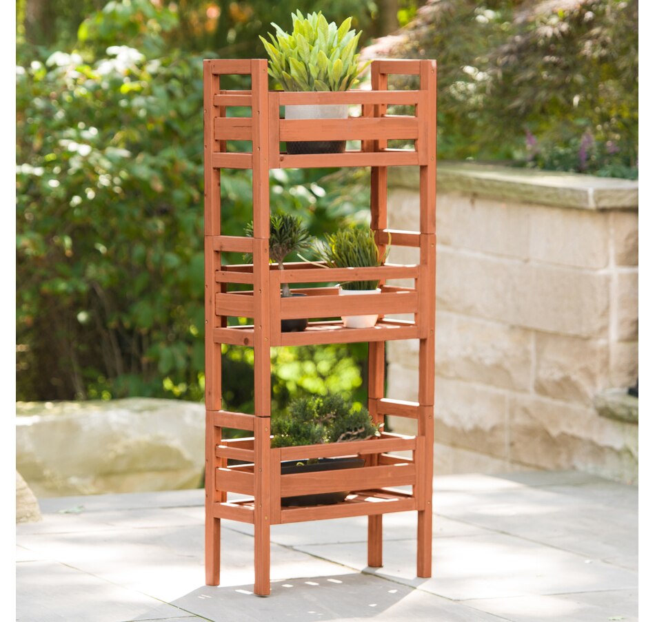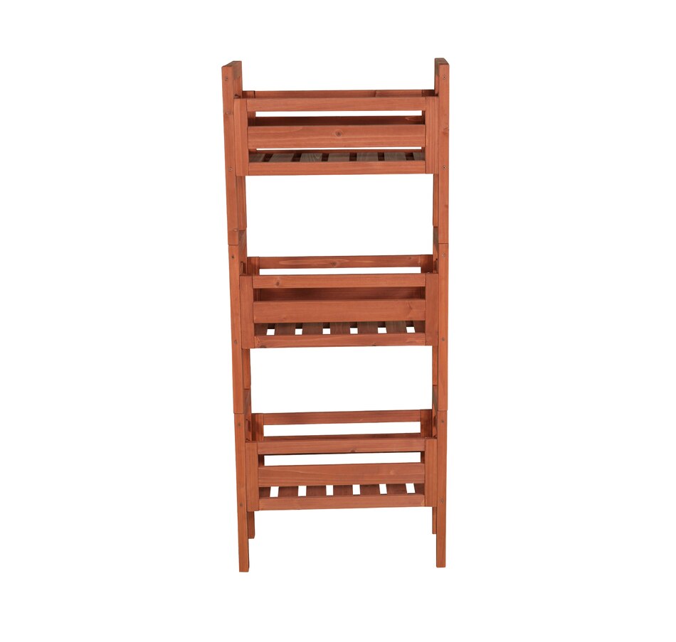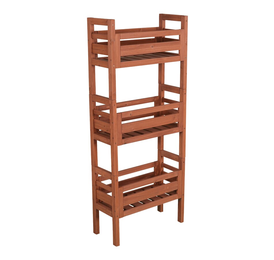 Rectangular stacking plant stand for outdoor or indoor provides a cascading display Plant warriors rejoice. Our stacking plant stands are a clever way to save space without sabotaging your style. Practical and savvy, yet fully versatile, and by that we mean it can be configured in three different ways (can be stacked 3 tiers high, as a pyramid, or freestanding individually). Rectangular shape nearly doubles your planting space so that you can easily mix and match a variety of flowers, herbs, and vegetables. Cascading design makes an attractive space divider on a shared balcony or porch. Crafted of solid wood harvested from the Cypress tree family with decay resistance similar to Western Red Cedar