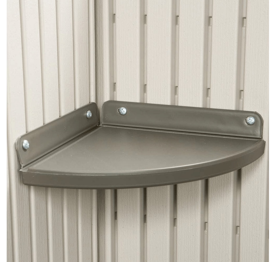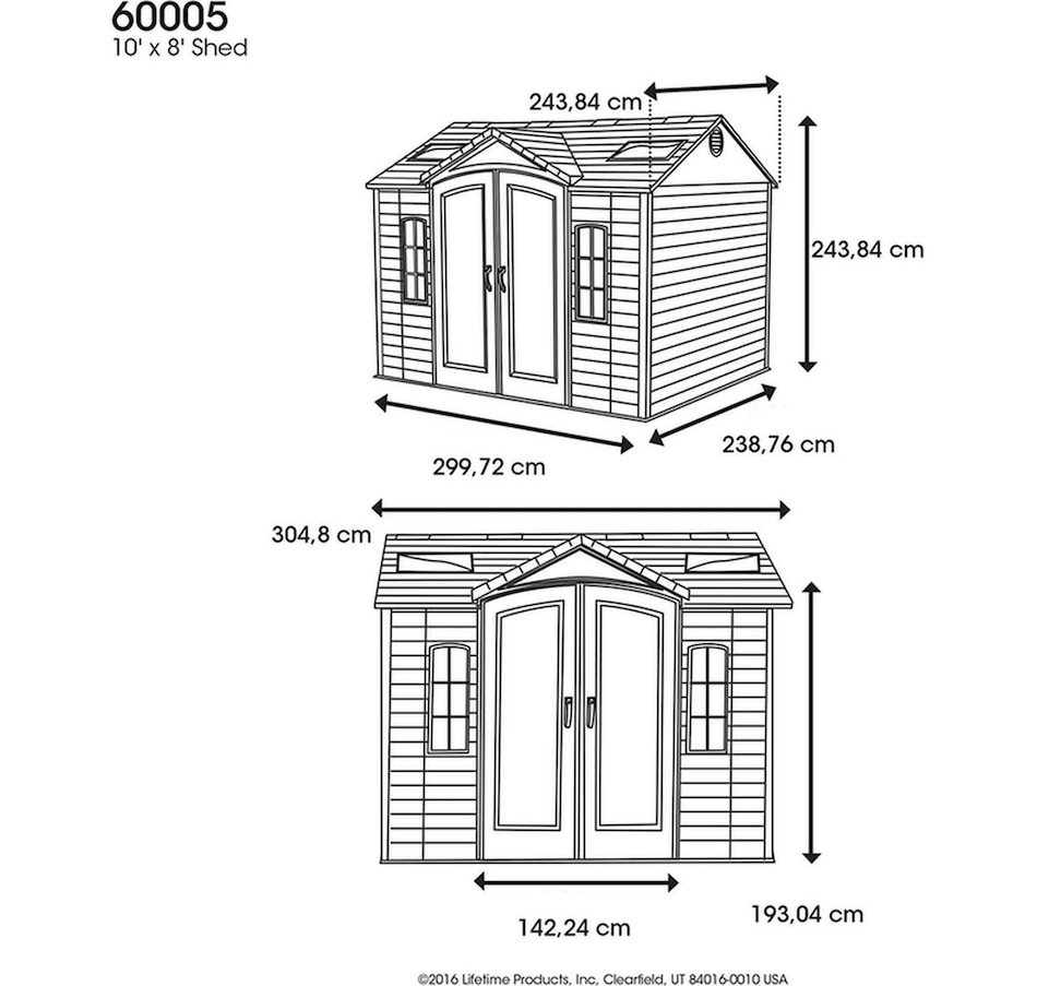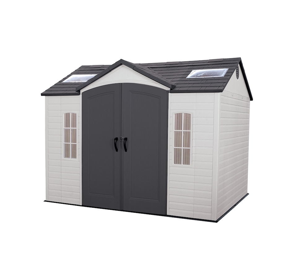 The 10-foot wide shed from Lifetime Products give you that extra space needed while accenting the beauty of your backyard. The centralized location of the doors provides easy storage access and the decorative shutters, molded wood-grain panels, and simulated shingled roof ensure an attractive design that will be the envy of your neighbourhood.