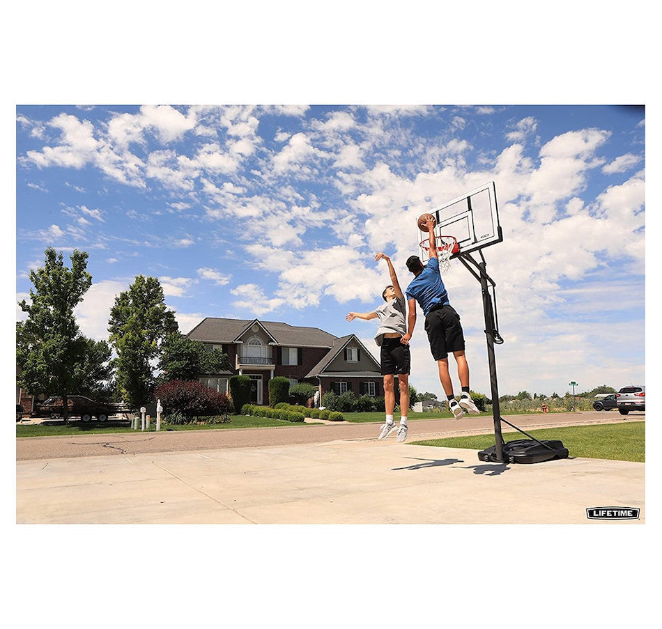 This portable basketball system from Lifetime Products features a 54" steel-framed acrylic backboard with a Pump-Adjust® height adjustment mechanism; this adjusts from 7.5' to 10' high in infinite height increments. This new Clearvie backboard eliminates backboard braces to increase stability and target visibility. It also includes a Slam-It Pro® rim with an all-weather nylon net and a 3.5" diameter square steel pole. With a 35-gallon portable base, this system can easily be moved to a desired location. So bring the arena to your home with a residential basketball system from Lifetime Products!