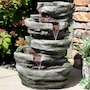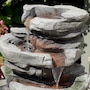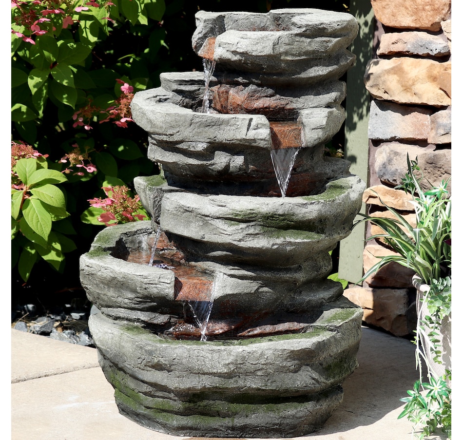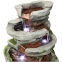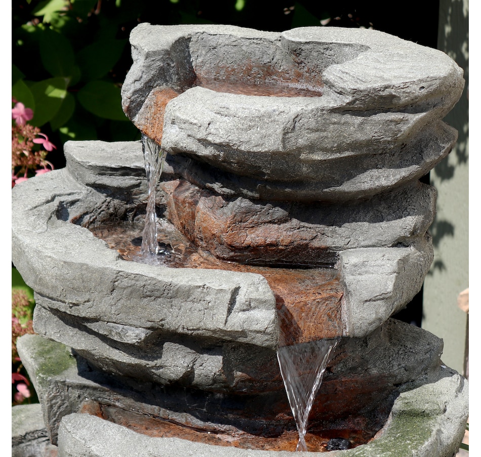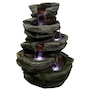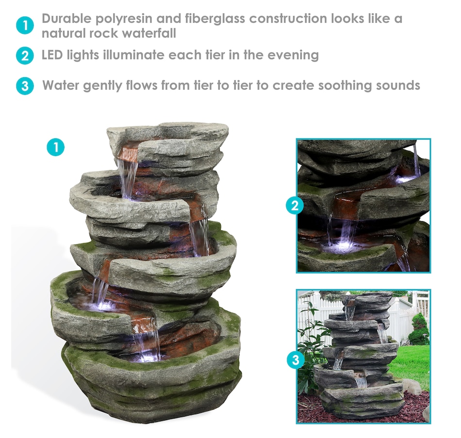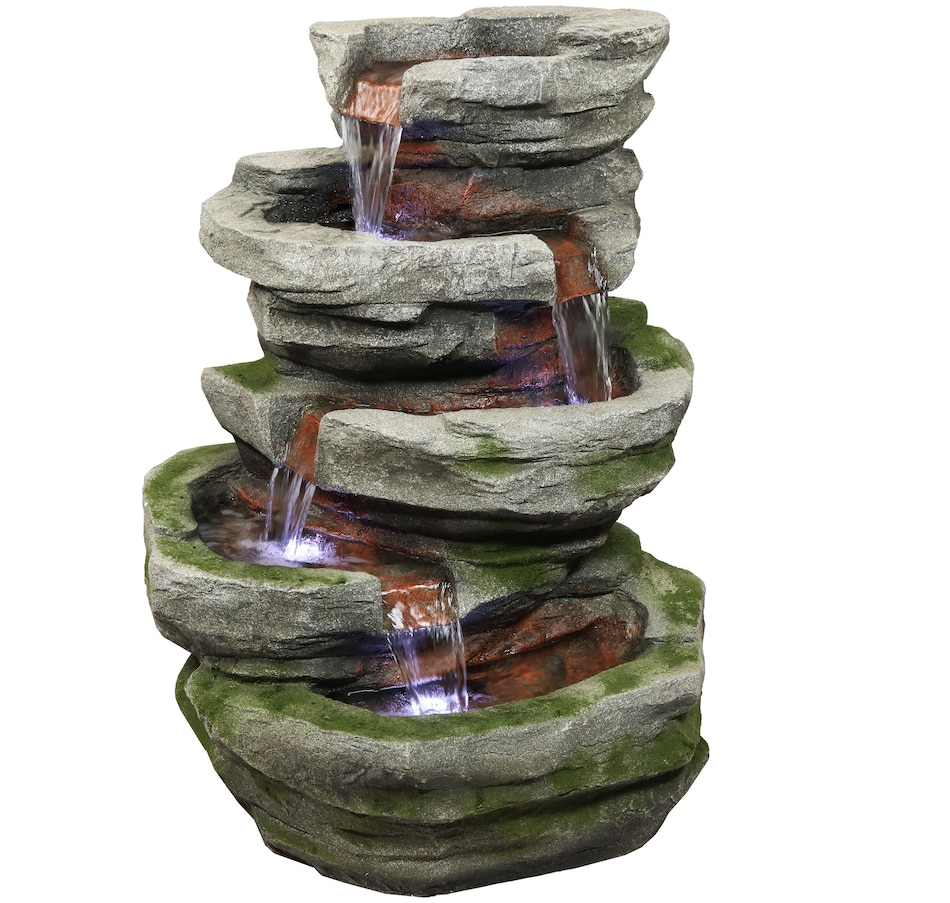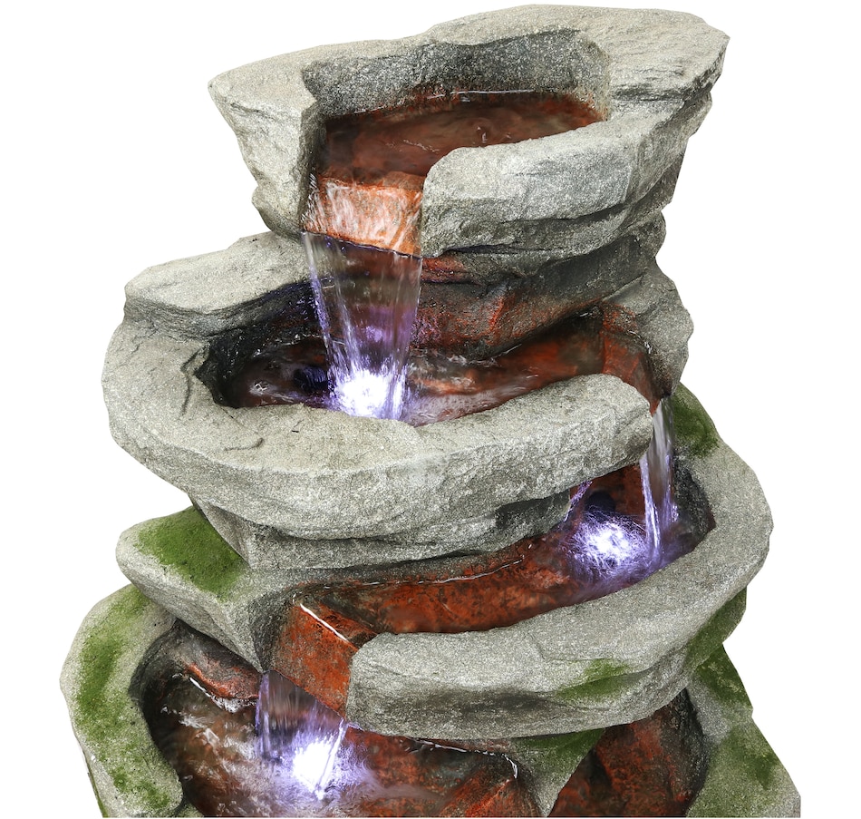 Whether this fountain is placed in the garden or patio, this feature is sure to leave a beautiful and lasting impression. The fountain is made from a durable polyresin and fiberglass material that is created to look like a stone waterfall. It is painted in shades of gray, green, brown, ivory, and features 4 LED lights. The electric pump enables the gently flowing water to stream from the top tier all the way down to the bottom pool where it circulates back through the fountain. The submersible pump allows water to flow continuously while remaining quiet so the relaxing, waterfall soundscapes never get interrupted. This fountain is a beautiful feature to drown out noises of busy streets or cars going by. Designed to look like natural rock, the multiple, large waterfalls with green splashes of color add a natural, unique look to the patio, garden, or other landscaped area.