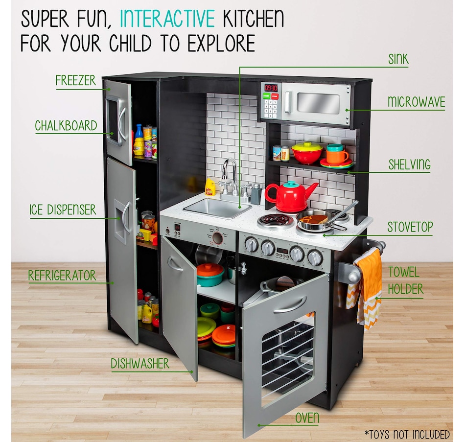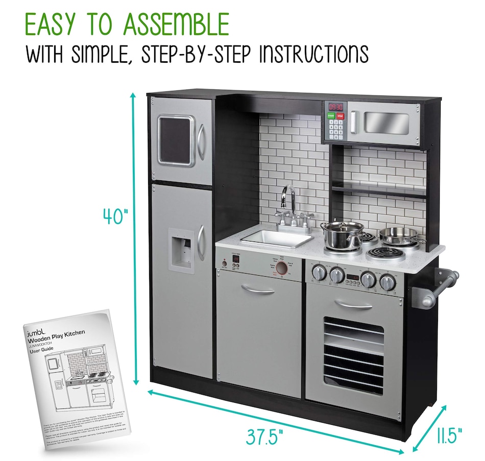 A classic toddler kitchen playset gets a realistic upgrade in the Wooden kids kitchen playset from Jumbl. This educational kitchen set for kids features every essential appliance found in a real modern kitchen, so kids can pretend to cook, clean, and maintain a household. This wooden kitchen play set is easy to assemble, your kid's kitchen will be open in no time. Watch your kids play kitchen with plenty of interactive elements & accessories. Little ones will love this compact play kitchen and learn as they play with plenty of interactive elements, exciting sights and sounds. With step-by-step instructions and high-quality hardware included, assembly of the wooden kids kitchen set is refreshingly easy. This kids wooden kitchen is sure to keep your child engaged with the interactive faucet, ice dispenser, and stovetop accessories. Add a Jumbl Kids wooden play kitchen set to your cart today!