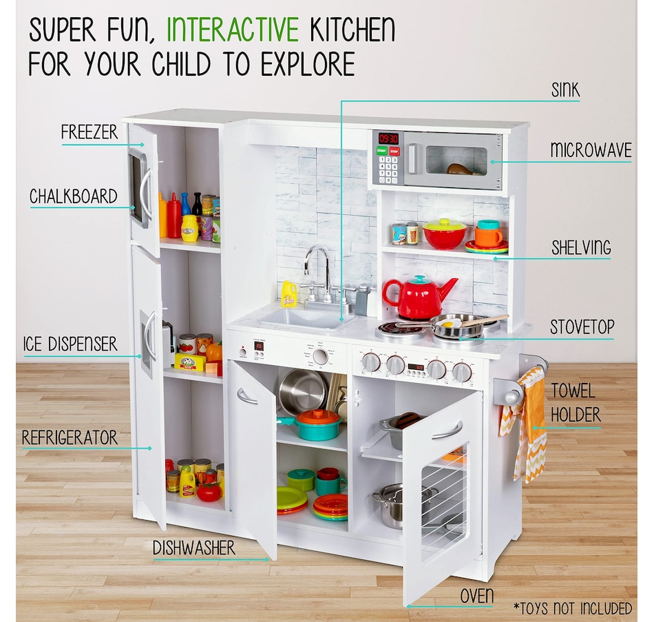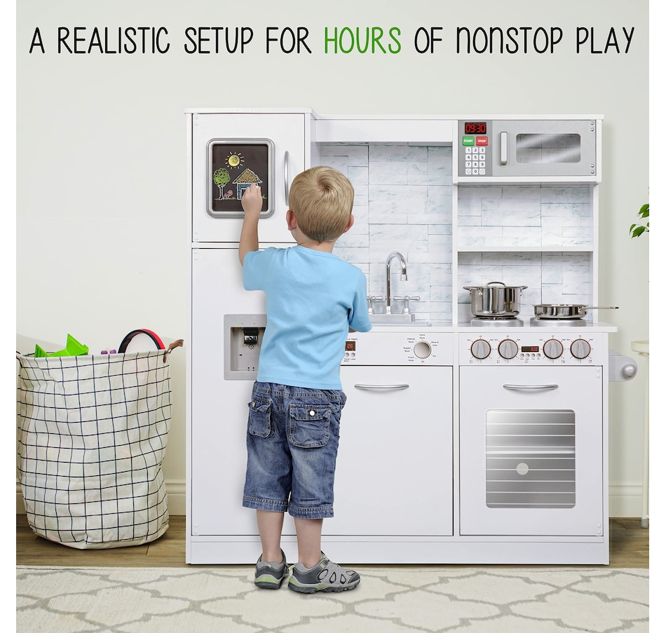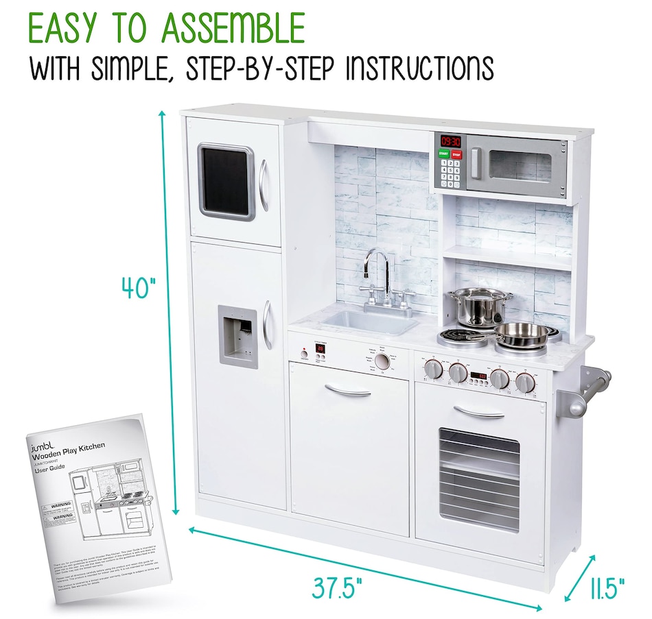 A classic toddler kitchen playset gets a realistic upgrade in the Wooden kids kitchen playset from Jumbl. This educational kitchen set for kids features every essential appliance found in a real modern kitchen, so kids can pretend to cook, clean, and maintain a household. This wooden kitchen play set is easy to assemble, your kid's kitchen will be open in no time. Watch your kids play kitchen with plenty of interactive elements & accessories. Little ones will love this compact play kitchen and learn as they play with plenty of interactive elements, exciting sights and sounds, and a built-in chalkboard for jotting down the day’s menu. With step-by-step instructions and high-quality hardware included, assembly of the wooden kids kitchen set is refreshingly easy. This kids wooden kitchen is sure to keep your child engaged with the interactive faucet, ice dispenser, and stovetop accessories. Add a Jumbl Kids wooden play kitchen set to your cart today!