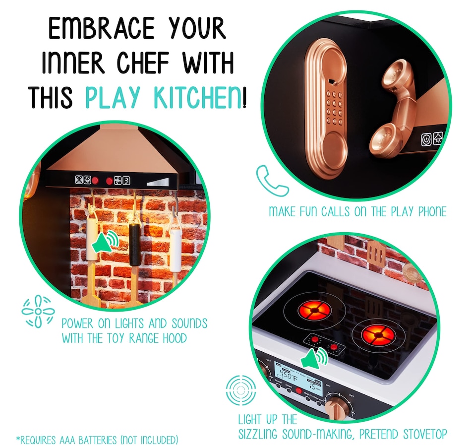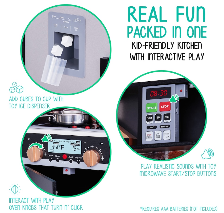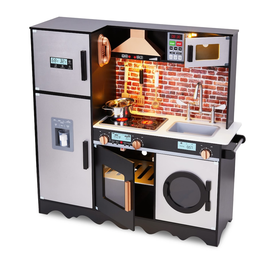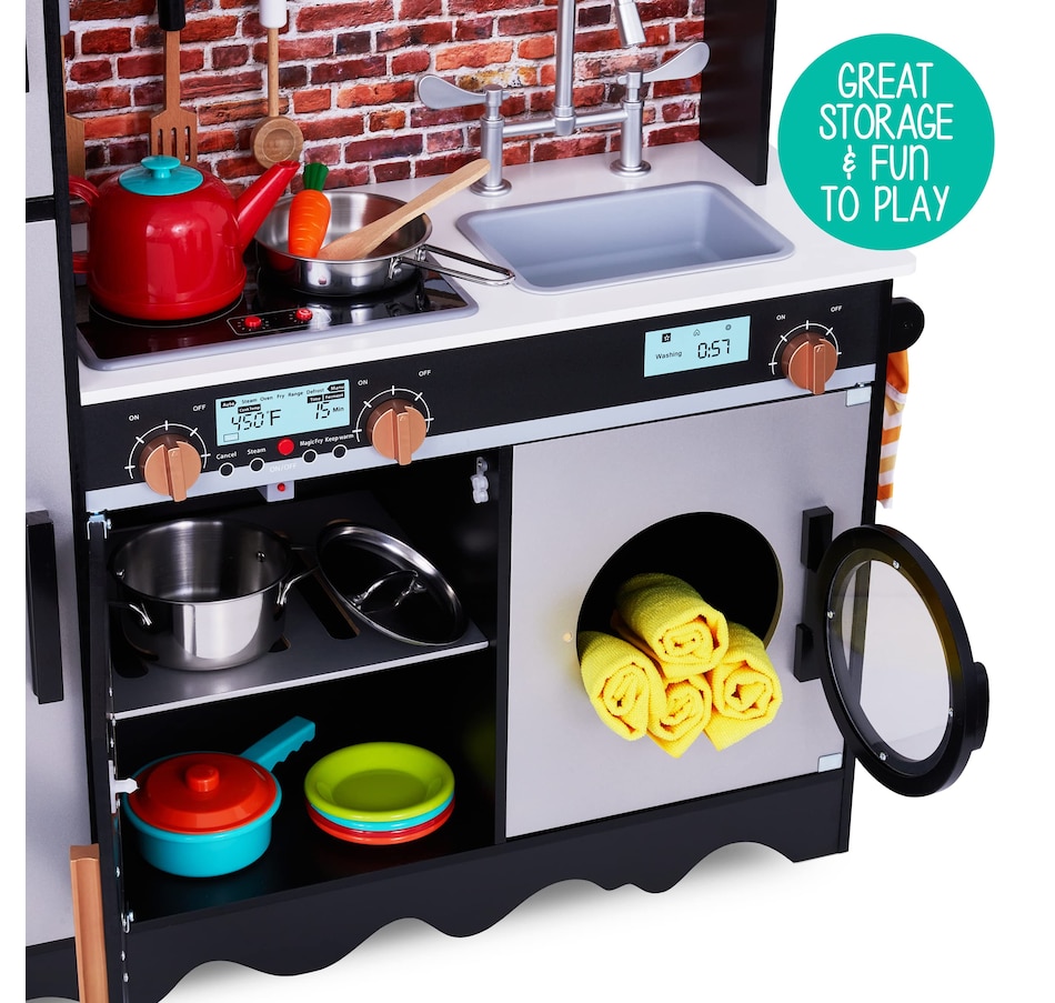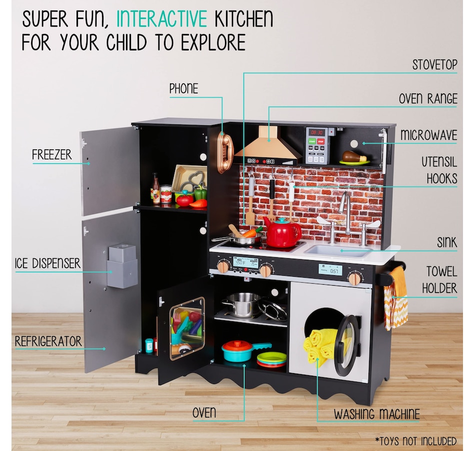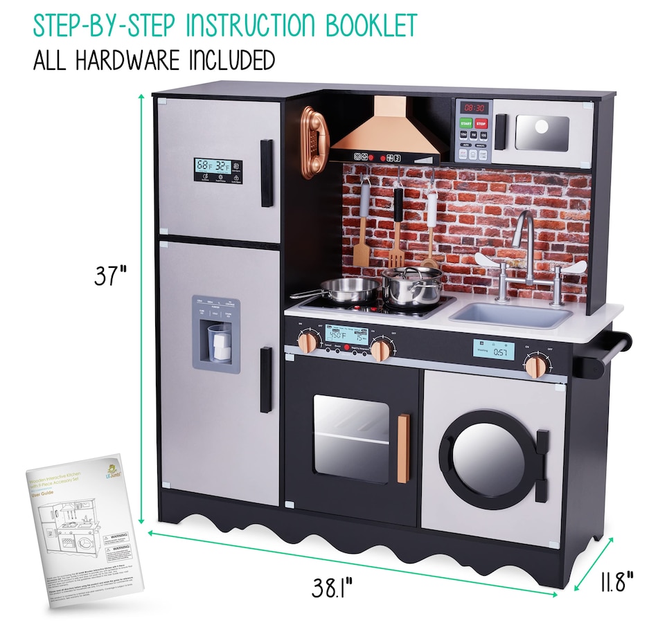A classic small wooden play kitchen gets a realistic upgrade in the kids kitchen playset from Jumbl. This educational kitchen set for kids features every essential appliance found in a real modern kitchen, so kids can pretend to cook, clean, and maintain a household, so take pretend play step further with this play kitchen for toddlers 1-3. This beautifully crafted wooden play kitchen is strongly made for long times of playing. This Kids kitchen set is easy to assemble, your kid kitchen will be open in no time. Watch your kids play kitchen with plenty of interactive elements & accessories. Add a Jumbl Wood Kitchen for Kids to your cart today.