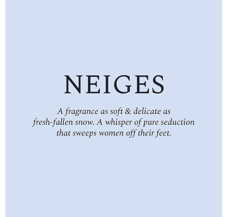 For over twenty years, Neiges has been the brand's flagship fragrance. Fresh and breezy, its unique bouquet comes from the exquisite redolence of pure white flowers. The scent of this fragrance lasts 4 to 8 hours and is phthalate-free.