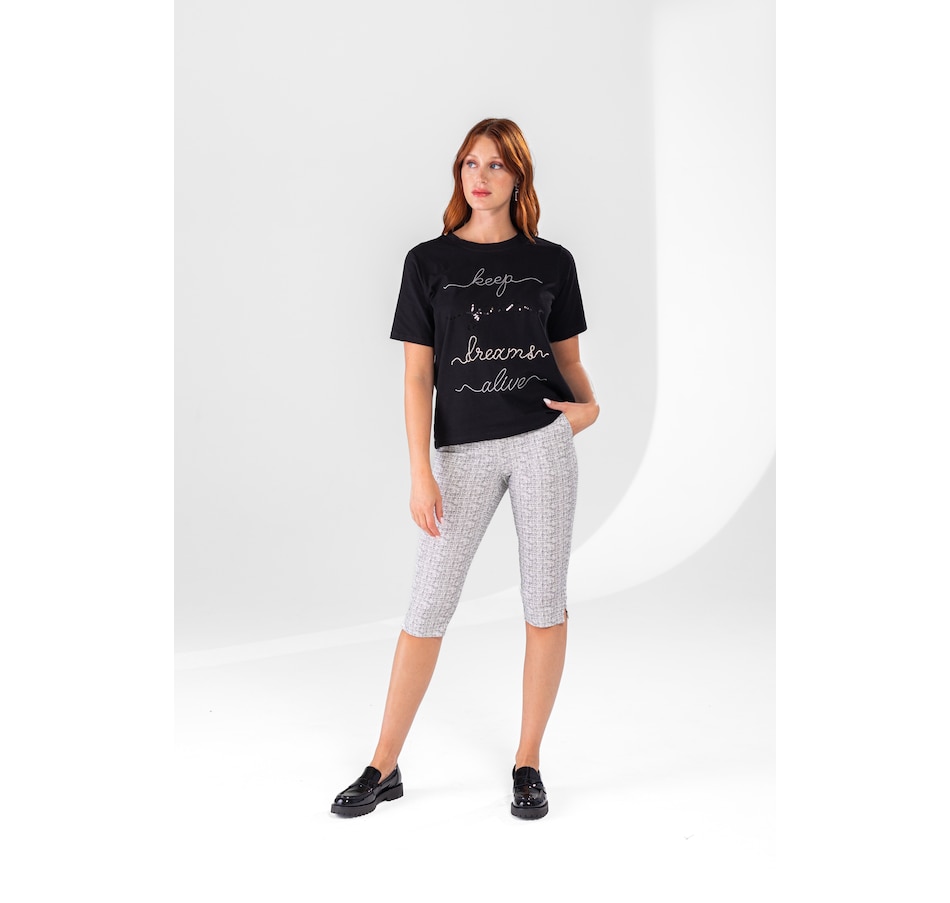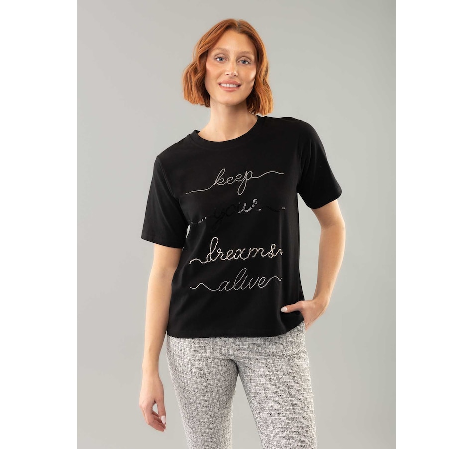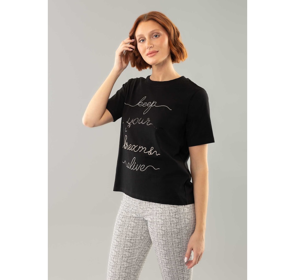 • Pull-on design, Amari t-shirt with sequin embroidery writing
