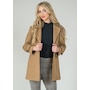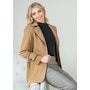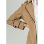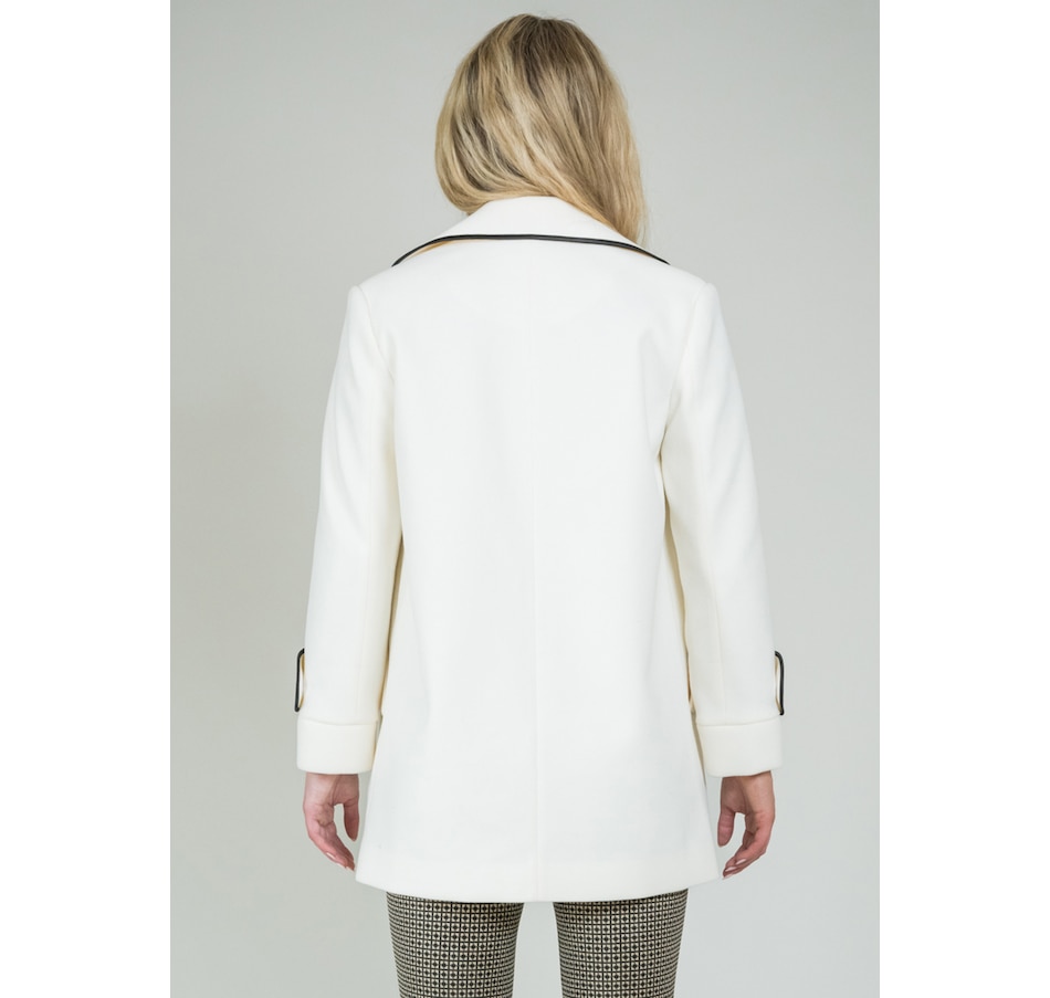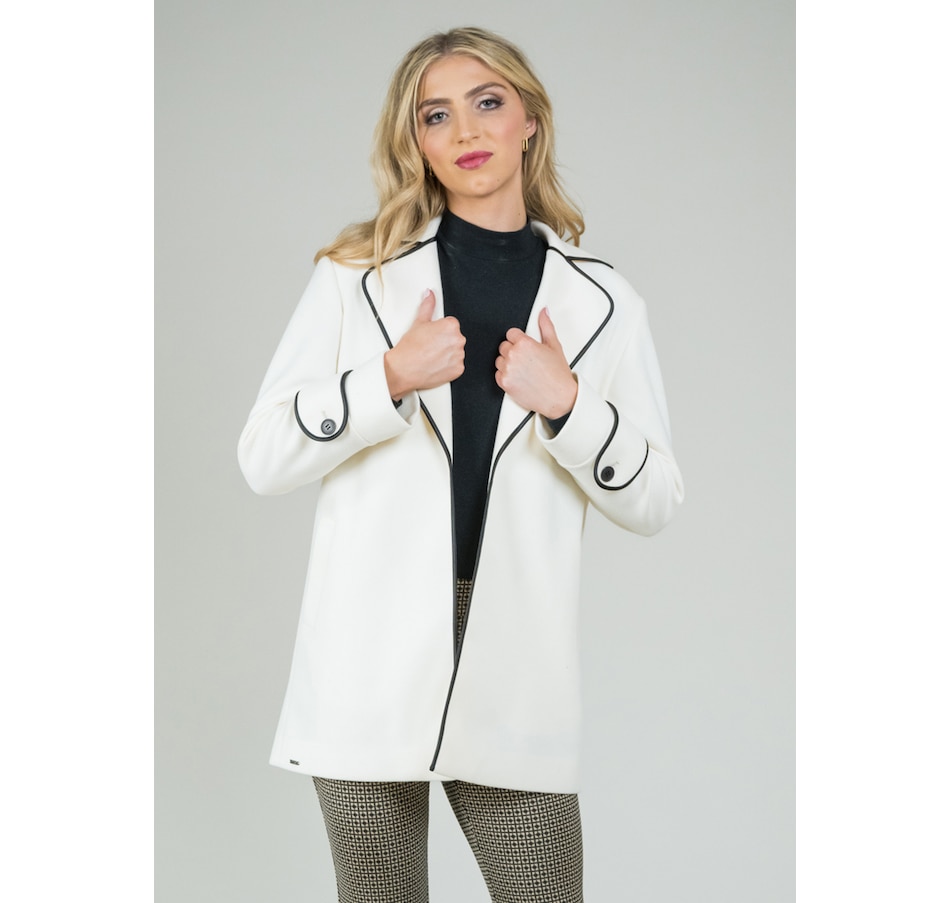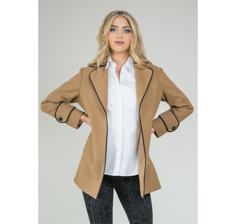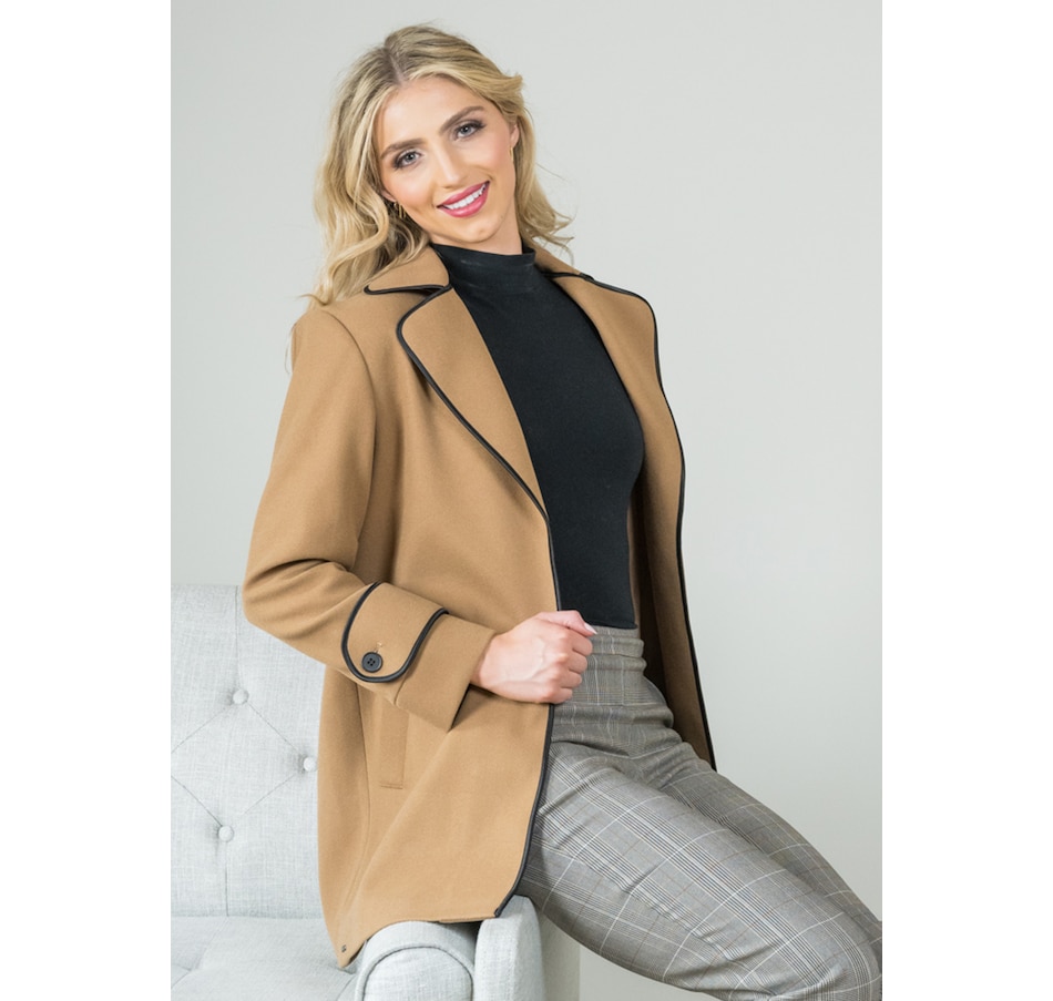Monica fabric, a low-pile knitted fleece, has been tailored into a long jacket featuring a modern notch collar. The addition of a subtle black piping enhances its elegance.