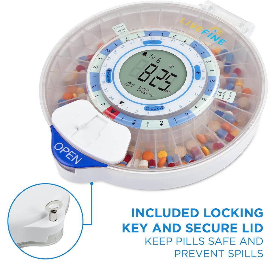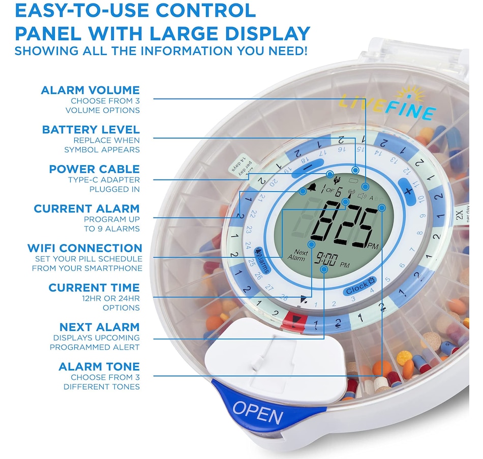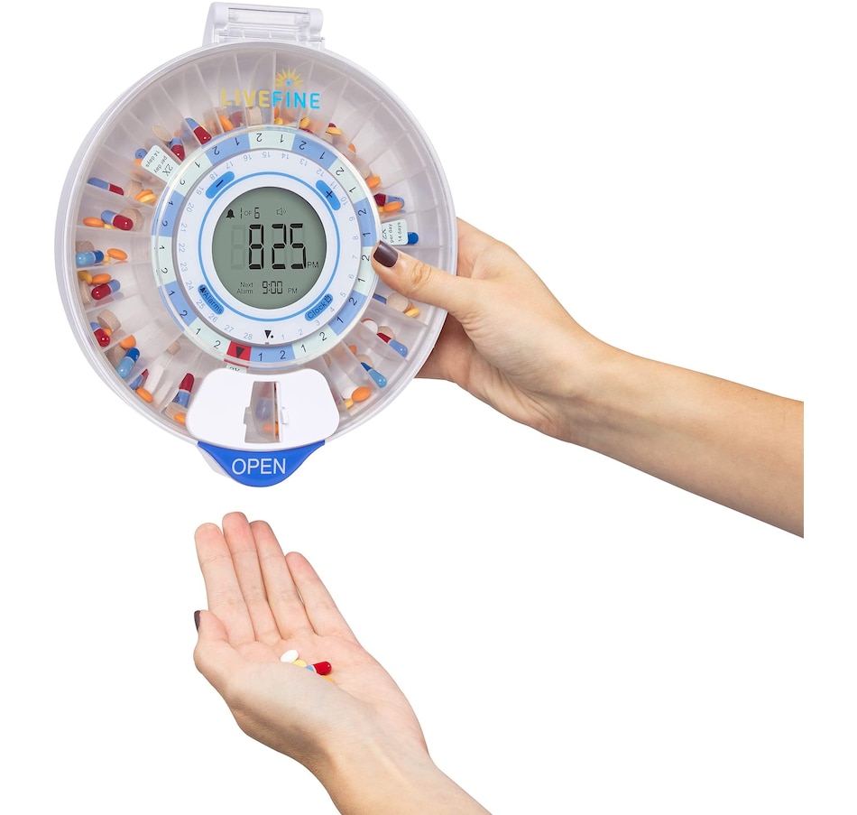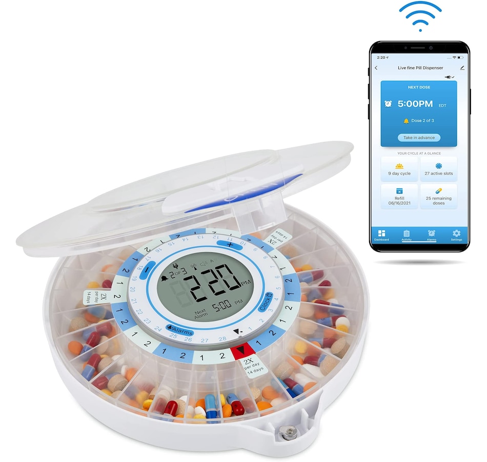 Whether you’re managing prescription medications, dietary supplements, daily vitamins, or other oral treatments, the LiveFine Smart Pill Dispenser takes the guesswork out of your routine with the ultimate efficiency and reliability system. This WiFi-enabled Smart Pill Organizer & Dispenser makes tracking, taking, and managing your meds easy—with an ultra-convenient remote monitoring option to help your family members and caregivers check on your progress straight from their phones. Plus, the travel pill organizer comes with 9 unique dosage templates, the easy-fill carousel allows you to organize, secure, track, and dispense pills for up to 28 straight days with a maximum of 9 reminders per day. A jumbo LCD screen on the electronic pill dispenser provides first-glance updates on the current time, upcoming alerts, battery life, and more. Discover peace of mind with the dispenser that does it all—add a LiveFine Smart Wifi Pill Box & Dispenser to your cart today!