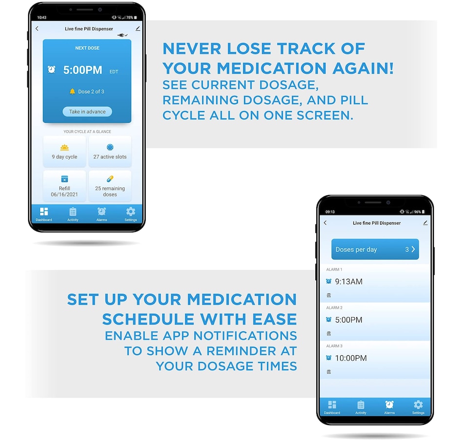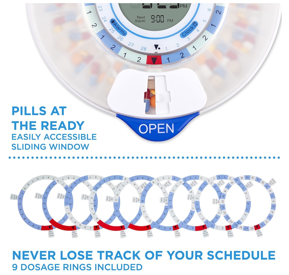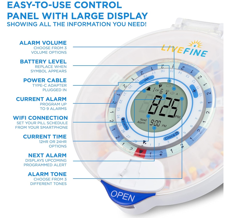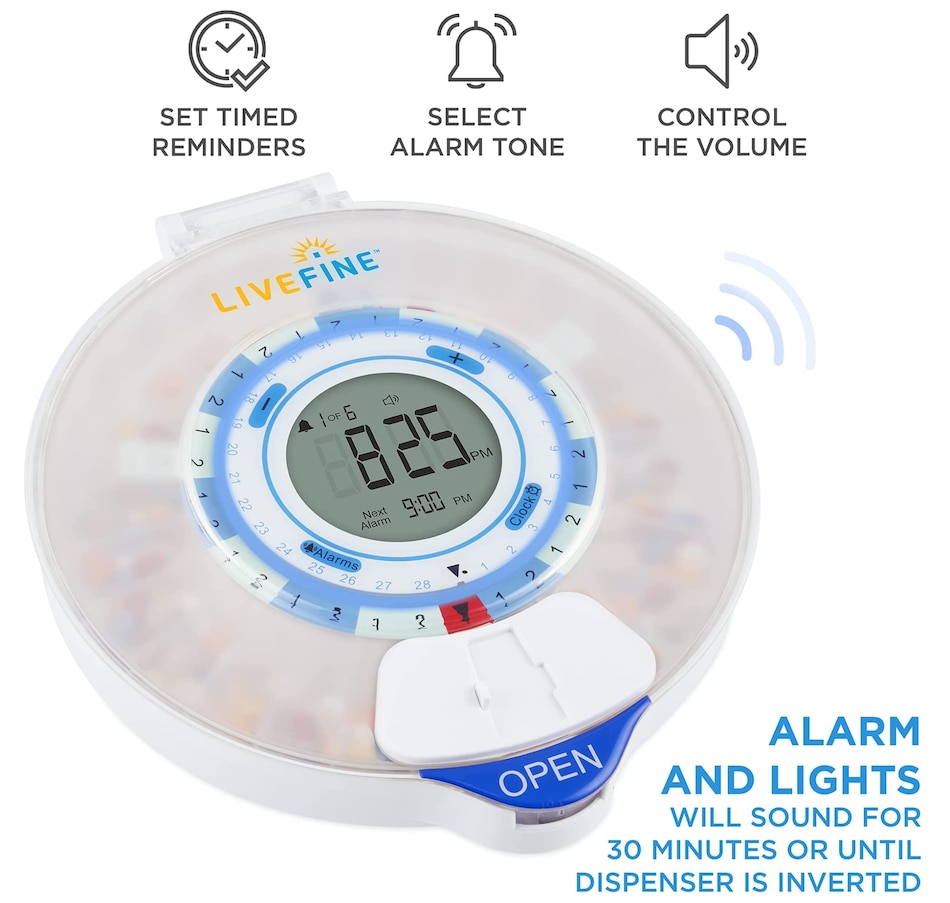 Whether you’re managing prescription medications, dietary supplements, daily vitamins, or other oral treatments, the LiveFine Smart Pill Dispenser takes the guesswork out of your routine with the ultimate efficiency and reliability system. This WiFi-enabled Smart Pill Organizer & Dispenser makes tracking, taking, and managing your meds easy—with an ultra-convenient remote monitoring option to help your family members and caregivers check on your progress straight from their phones. Plus, the travel pill organizer comes with 9 unique dosage templates, the easy-fill carousel allows you to organize, secure, track, and dispense pills for up to 28 straight days with a maximum of 9 reminders per day. A jumbo LCD screen on the electronic pill dispenser provides first-glance updates on the current time, upcoming alerts, battery life, and more. Discover peace of mind with the dispenser that does it all—add a LiveFine Smart Wifi Pill Box & Dispenser to your cart today!