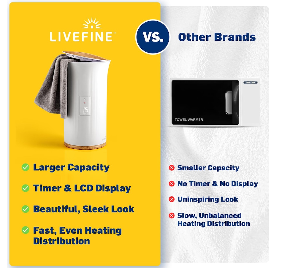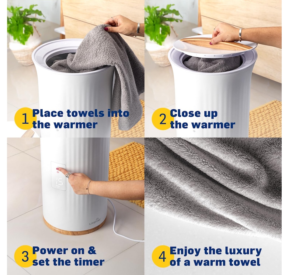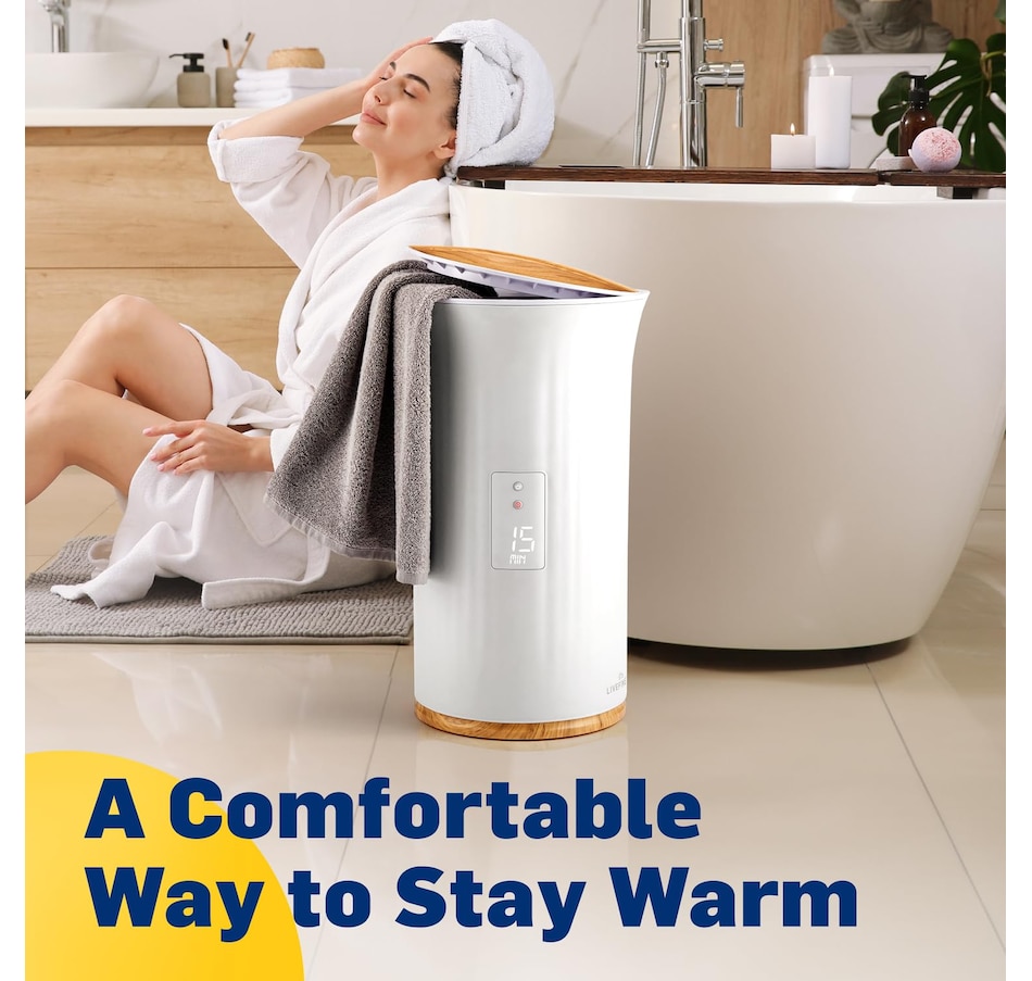 The bath towel warmer comes with a sleek LCD display that features helpful indicator lights and easy touch-button operation. Select your ideal timer in the small towel warmer, soak in the tub, then prepare for post-bath bliss. The towel heater keeps your towel pleasantly warm for up to 20 minutes after the cycle ends. Skip the goosebumps—try the Large Towel Warmers for Bathroom from LiveFine.