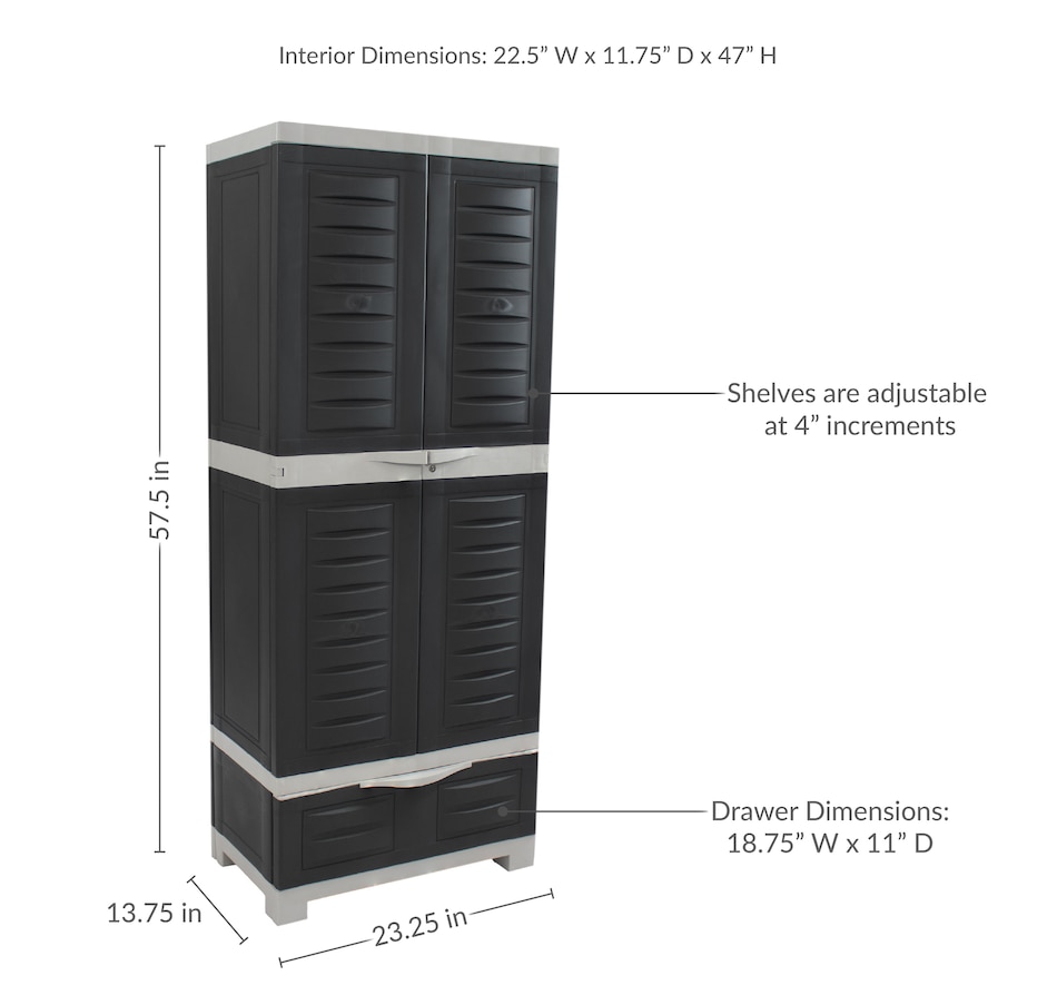Clean up the garage by organizing tools, extension cords, gardening supplies, and more or keep the office or storage room clean and tidy with this lockable storage cabinet with shelves. Made from heavy-duty polypropylene, this utility storage cabinet with doors resists rust or peeling and the elements. With 3 adjustable shelves and a drawer on the bottom, this cabinet for laundry room offers plenty of storage space for many household items. Arrange the shelves to accommodate items of all sizes, like cleaning solution bottles, planters, tools, paper towels, and more. The lockable doors secure the contents, keeping them out of sight and out of reach for peace of mind. The storage cabinet comes with 2 keys to lock and unlock the doors. Whether in the shed, garage, basement, mudroom, home office, or elsewhere, this cabinet keeps nearly anything neatly organized and ready for use.