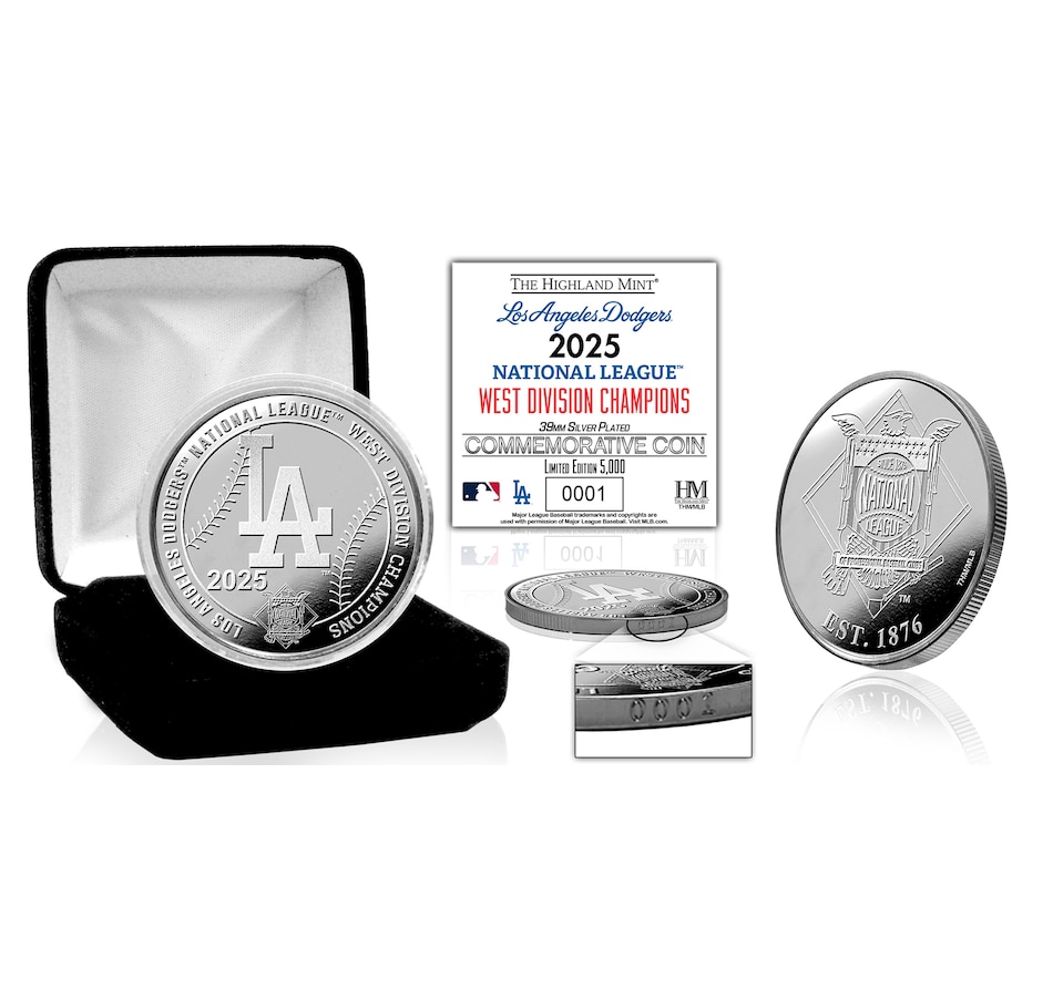 Celebrate the Los Angeles Dodgers’ 2025 National League West Division Championship with this limited-edition silver-plated coin. Measuring 39mm in diameter, the obverse displays the official Dodgers 2025 West Division Champions design, while the reverse features the National League logo in striking detail. Only 5,000 coins have been minted, each individually edge-numbered to mark its place in the collection. Every coin comes secured in a protective capsule, housed in an elegant black suede jewellery box, and accompanied by a matching numbered certificate. Officially licensed by Major League Baseball and proudly crafted in the USA by The Highland Mint, this collectible is a must-have for Dodgers fans and serious collectors.