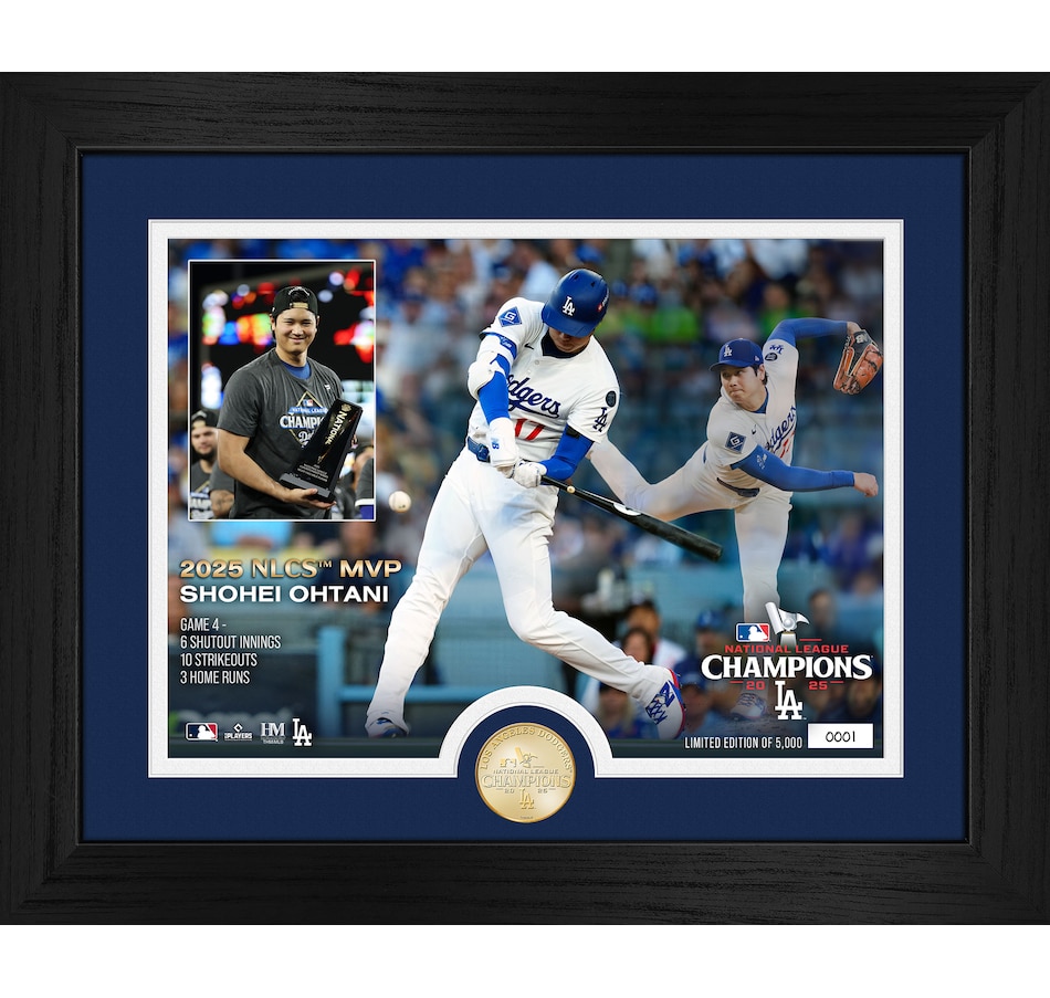 This limited edition collectible 13" x 16" wood frame commemorating the 2025 National League Championship Series (NLCS) MVP features, in double-matting under protective acrylic glass, a hand-numbered 8" x 11" print of the MVP combined with a 39mm minted 2025 NL Champions bullion bronze coin. Limited to only 5,000 and officially licensed by MLB and MLBPA, each photo mint is accompanied by a certificate and made in the USA by The Highland Mint.