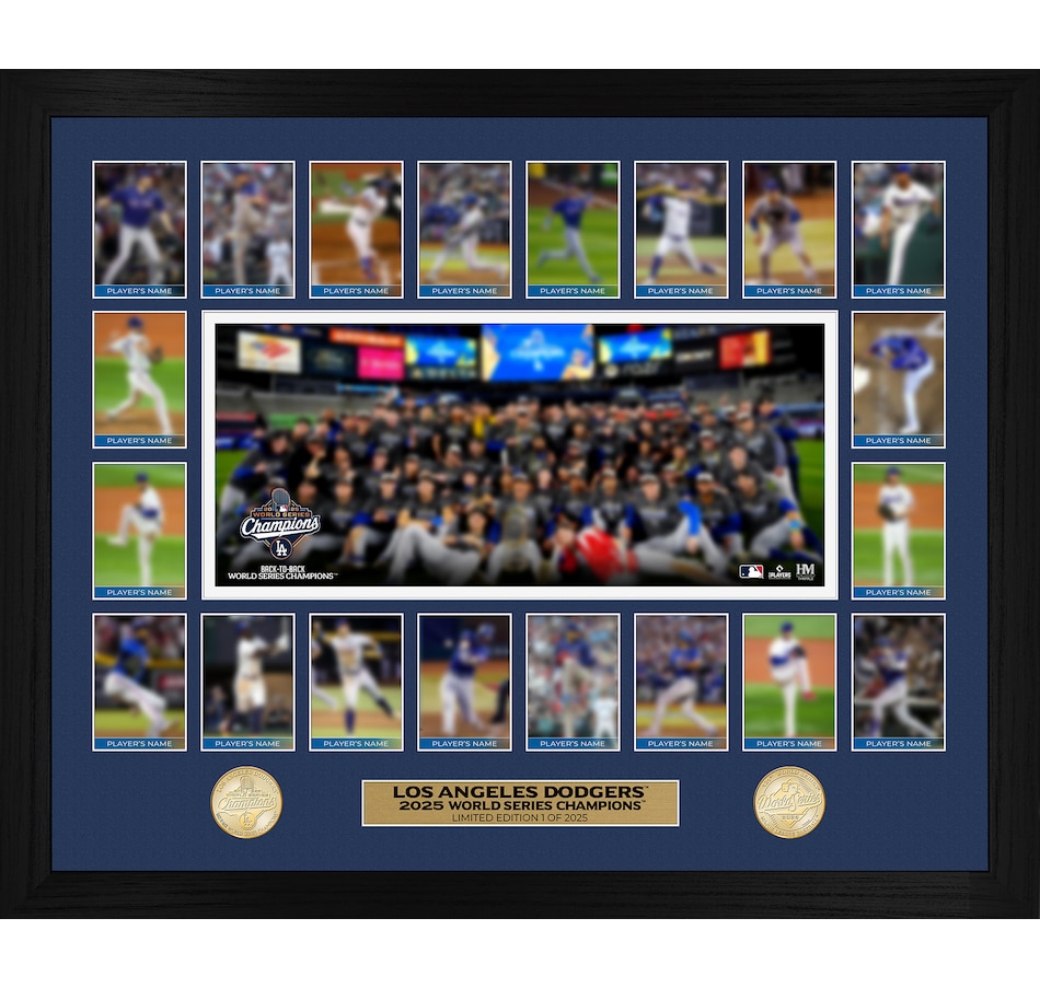 Celebrate the Los Angeles Dodgers' 2025 World Series victory with this striking 18" x 22" limited-edition collectible. This deluxe frame showcases a centrepiece image of the team celebrating on the field after clinching the title, surrounded by 20 action images capturing unforgettable moments from their championship run, all presented under acrylic glass with double matting. Beneath the prints are two 39-mm solid bronze coins: one minted with the 2025 World Series Champions logo and the other with the official World Series emblem. An engraved nameplate centred between the coins highlights the Dodgers' ninth World Series championship.