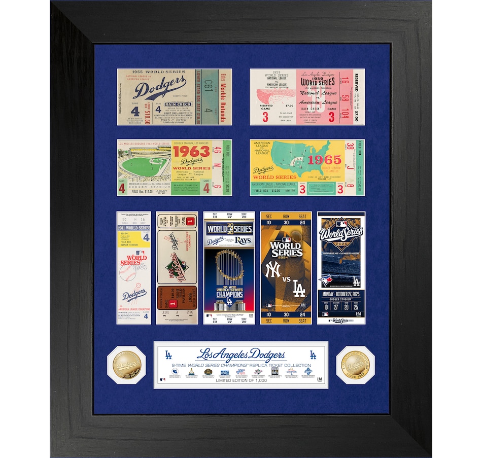 The Los Angeles Dodgers Nine-Time World Series Champions Deluxe Ticket Collection is a tribute to a historic franchise's legacy. This impressive 20" x 24" frame features 2.5" wide black wood molding and premium suede matting, and is protected under plexiglass. Inside, nine replica World Series tickets—one from each championship year—are artfully displayed to celebrate the Dodgers' legendary postseason runs. Also included are two 39-mm 24K gold-plated coins: one minted with the official Dodgers team logo, and the other with the 2025 World Series Champions mark. A custom nameplate with championship years is matted beneath the tickets, while a hand-numbered certificate of authenticity is adhered to the back of the frame. Limited to only 1,000, this officially licenced MLB collectible is a stunning showpiece for any Dodgers fan.