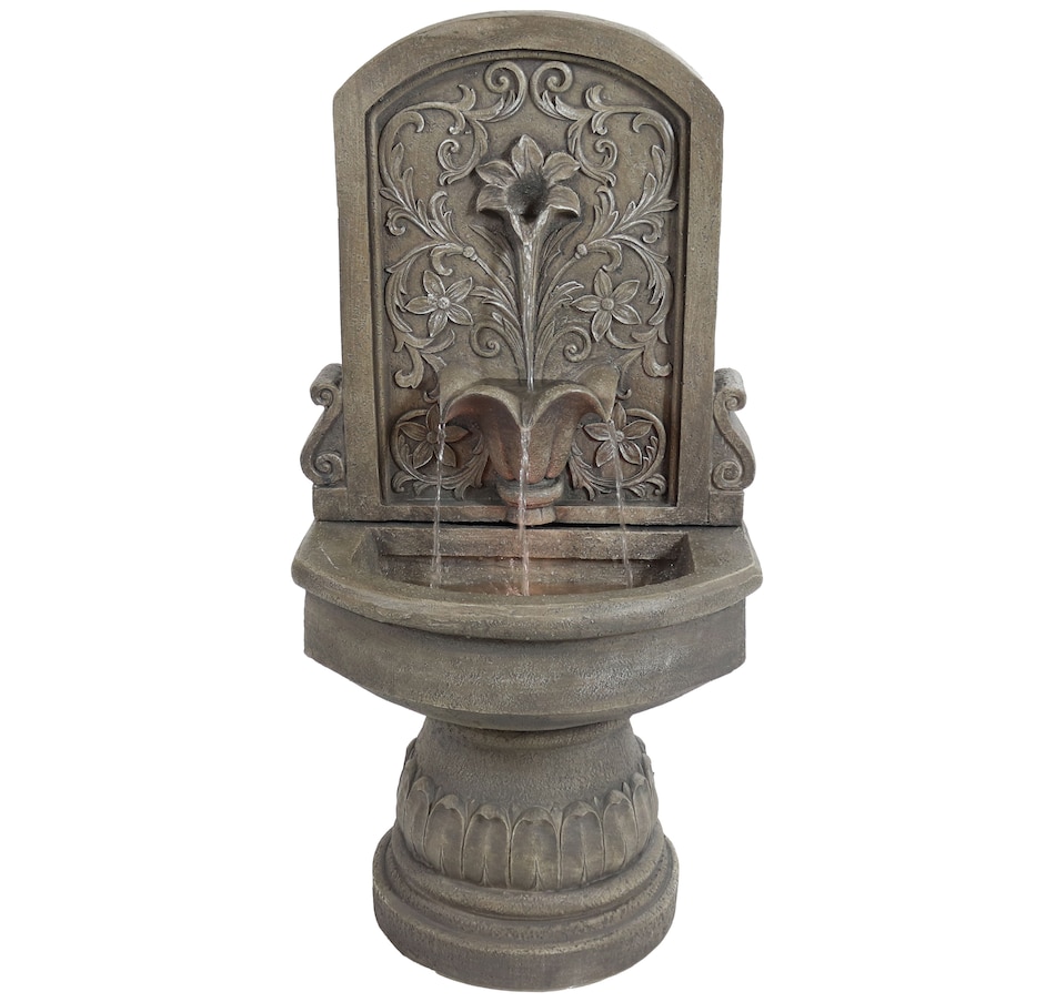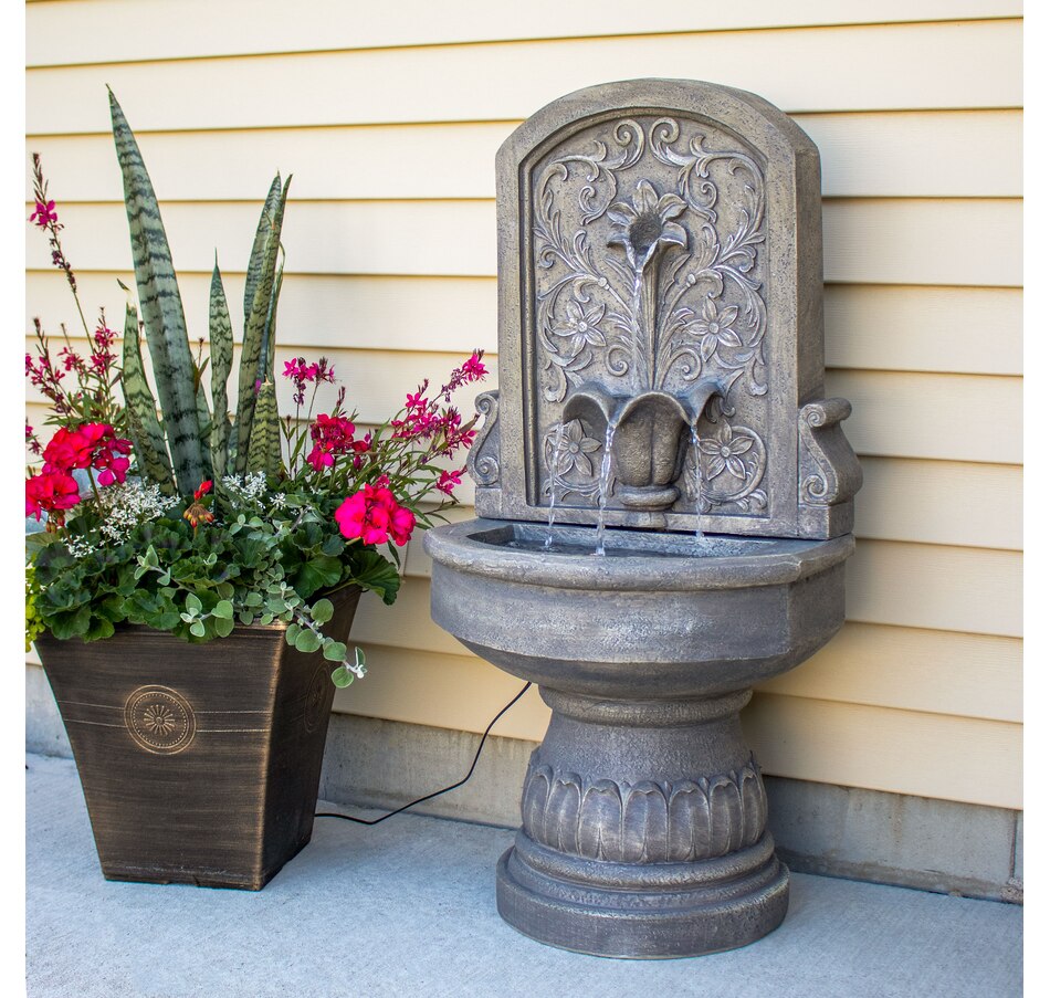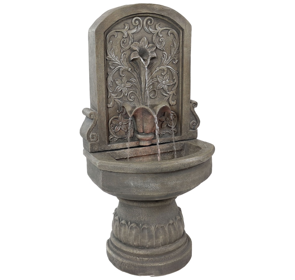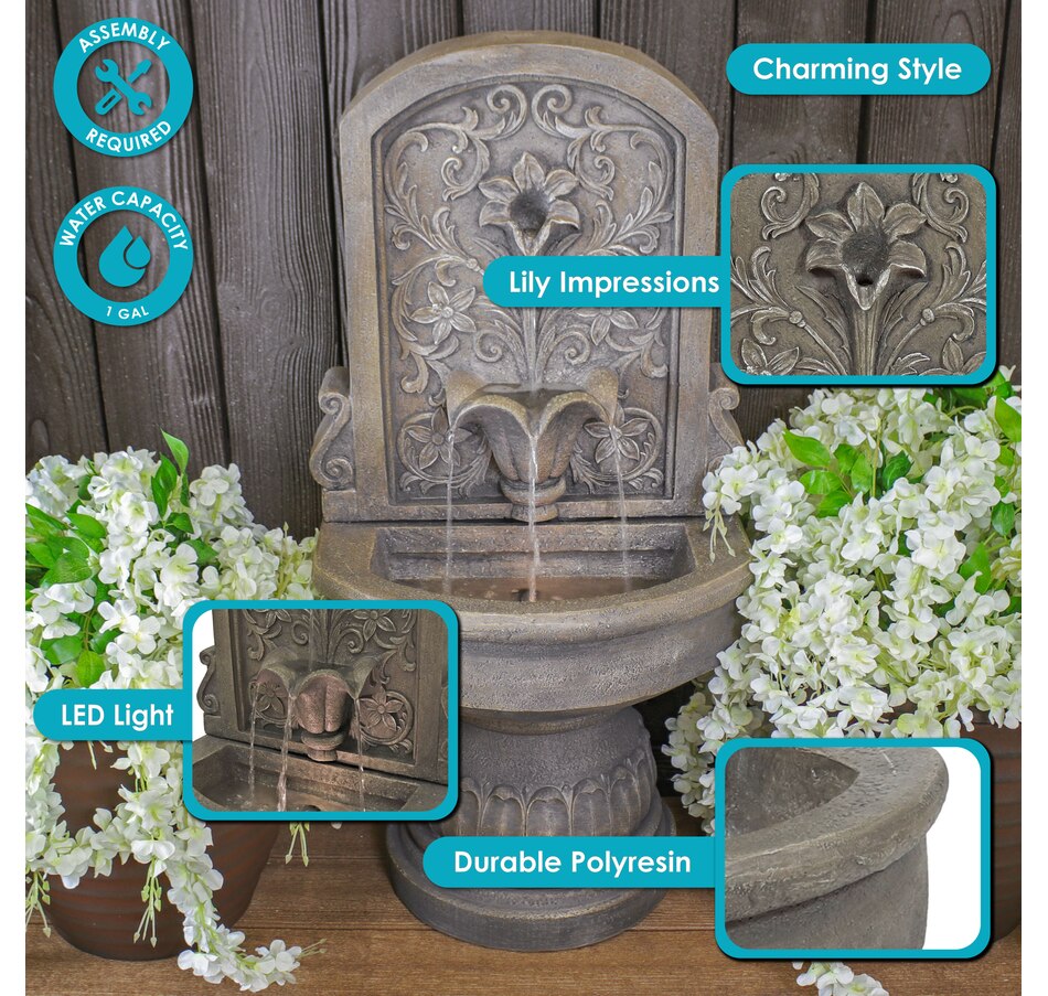 Enchant the courtyard with an air of romance with this lovely lily floor standing fountain. Crafted from durable polyresin, this freestanding water fountain offers both beauty and resilience. It's made to withstand the elements for years of enjoyment with minimal maintenance. The fountain's delicate floral accents provide a classic, fairytale look. The fountain features a flat back and pedestal base, making it effortlessly rest against any wall to optimize space while creating a captivating focal point. With a built-in LED light, this outdoor fountain illuminates the lily petal spiller, casting a soft glow over the cascading water for a mesmerizing visual display. Whether unwinding after a long day or entertaining guests, the soft, soothing sounds of this fountain combined with the gentle illumination create a tranquil ambiance for relaxation.