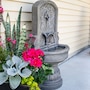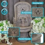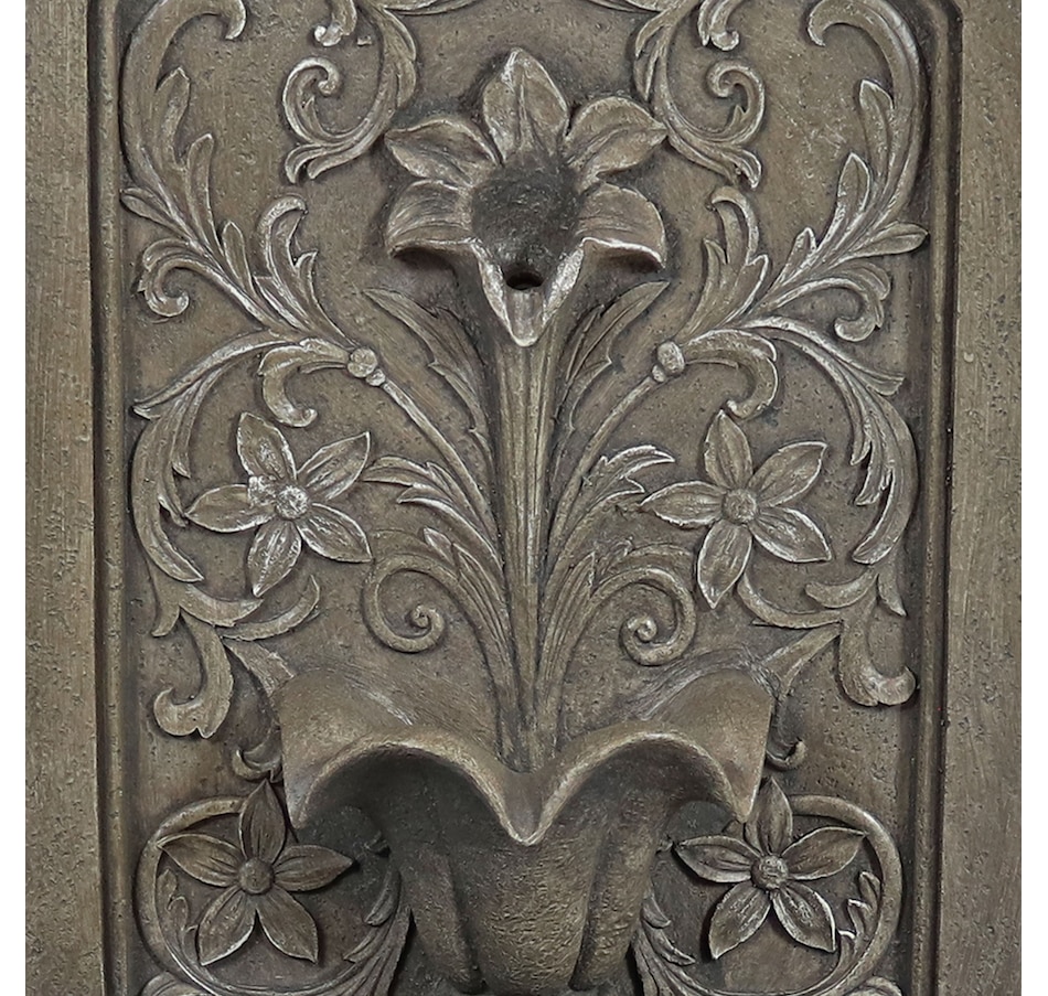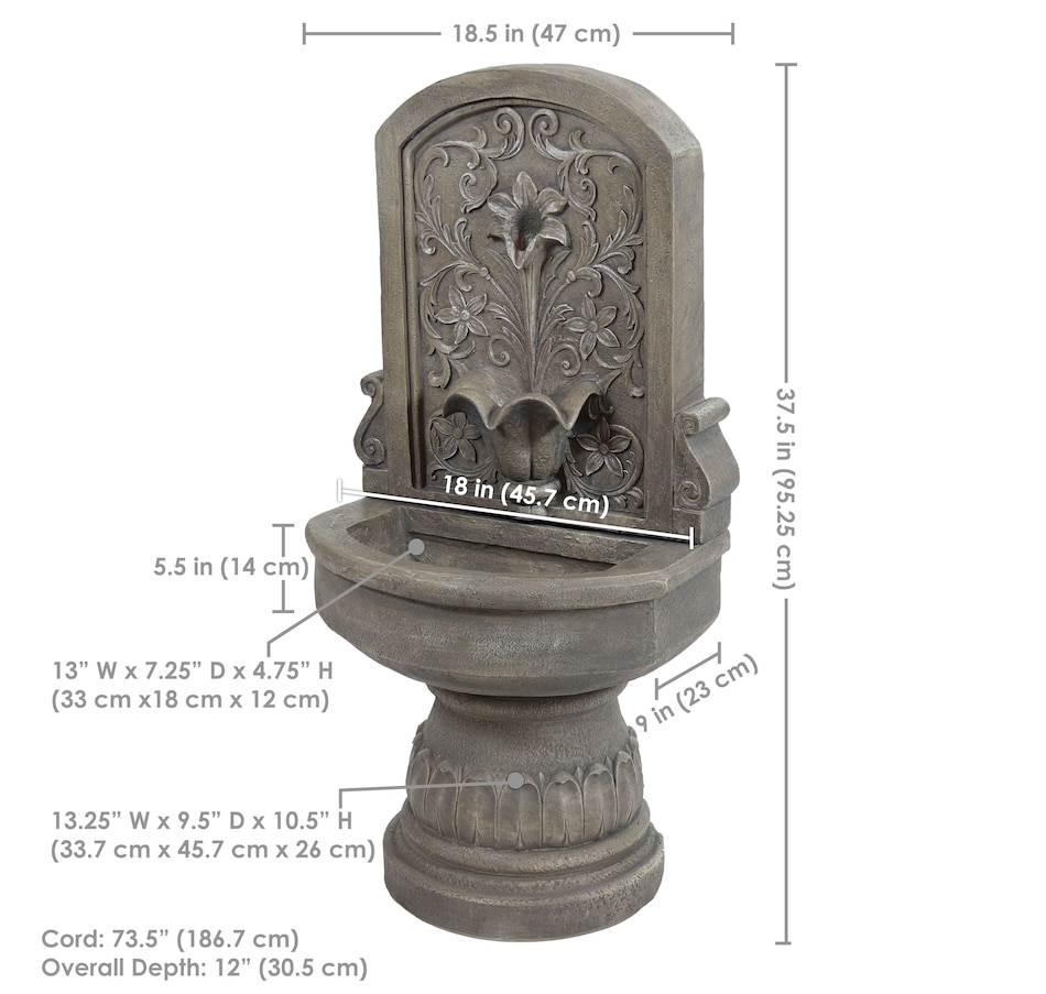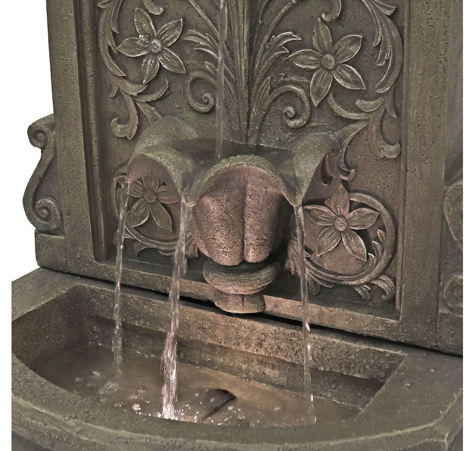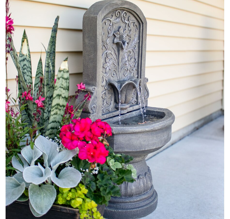 Enchant the courtyard with an air of romance with this lovely lily floor standing fountain. Crafted from durable polyresin, this freestanding water fountain offers both beauty and resilience. It's made to withstand the elements for years of enjoyment with minimal maintenance. The fountain's delicate floral accents provide a classic, fairytale look. The fountain features a flat back and pedestal base, making it effortlessly rest against any wall to optimize space while creating a captivating focal point. With a built-in LED light, this outdoor fountain illuminates the lily petal spiller, casting a soft glow over the cascading water for a mesmerizing visual display. Whether unwinding after a long day or entertaining guests, the soft, soothing sounds of this fountain combined with the gentle illumination create a tranquil ambiance for relaxation.