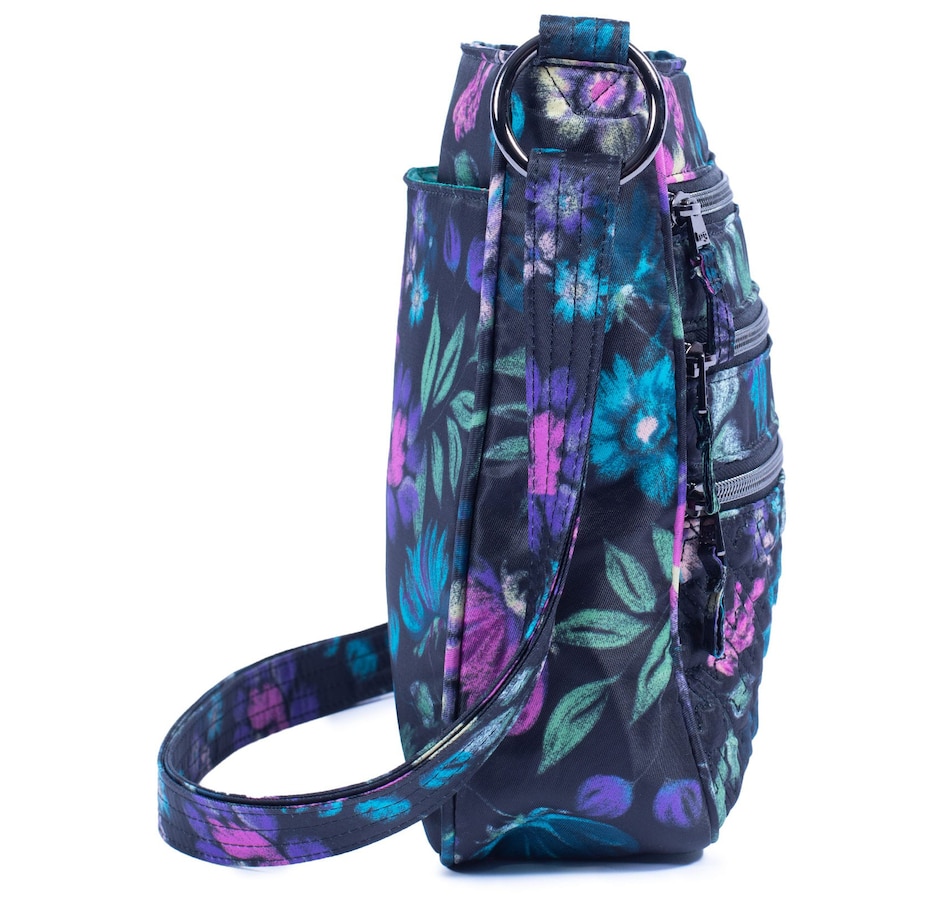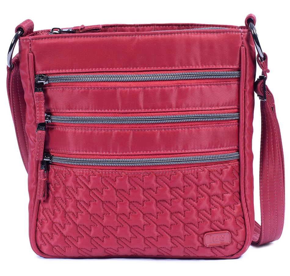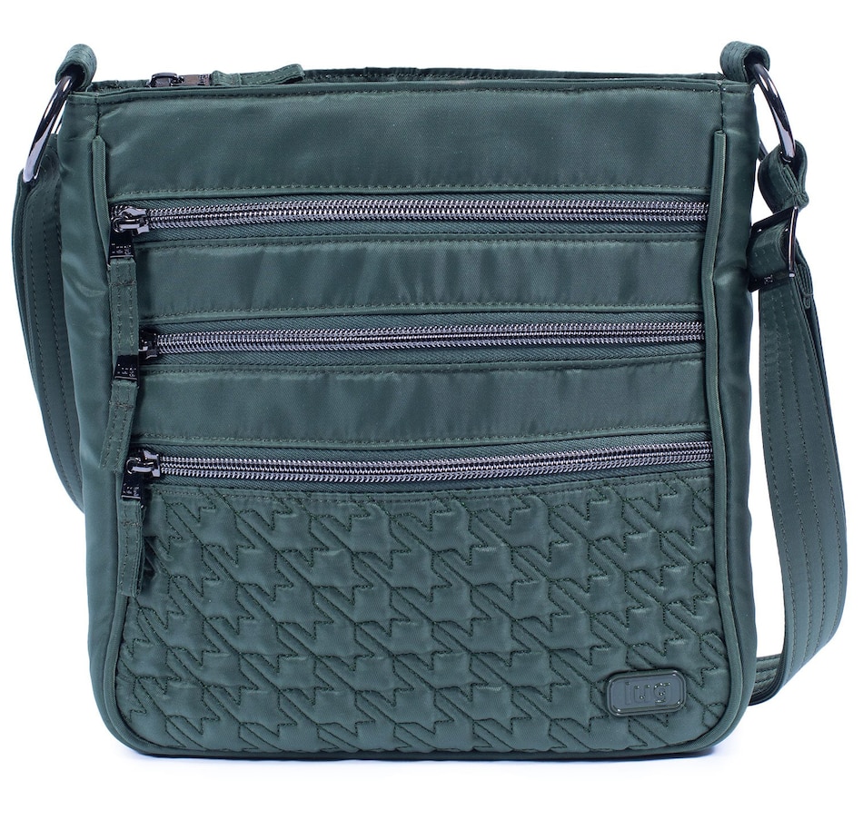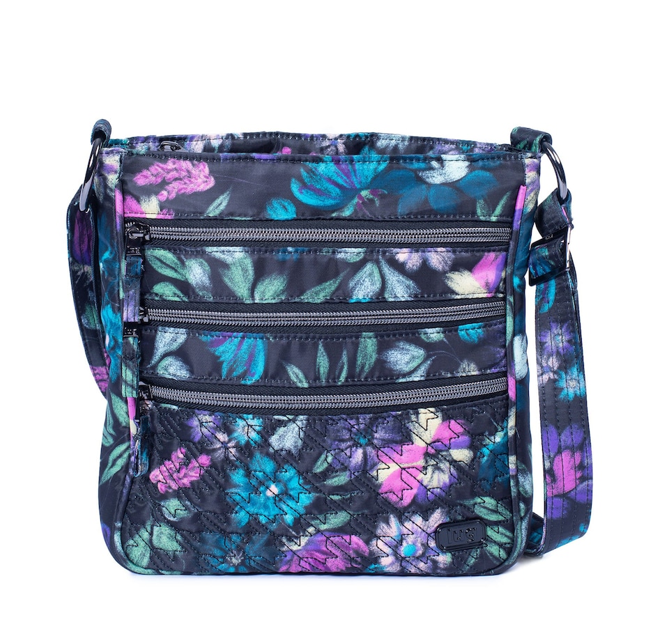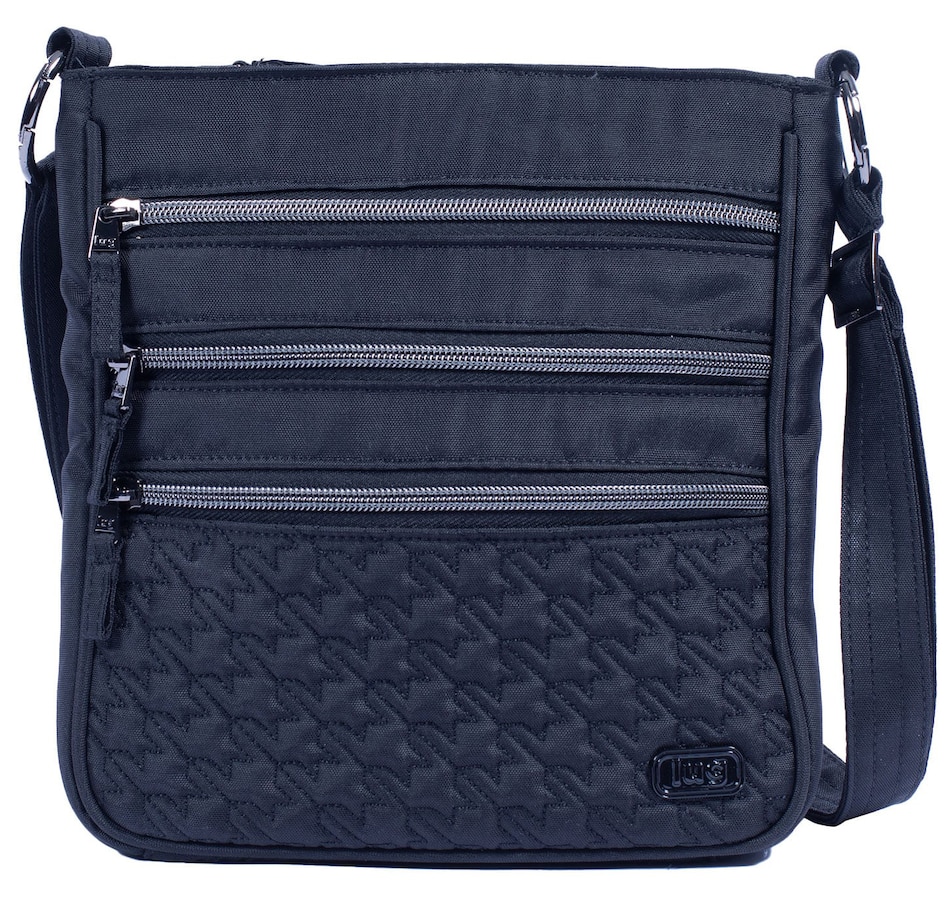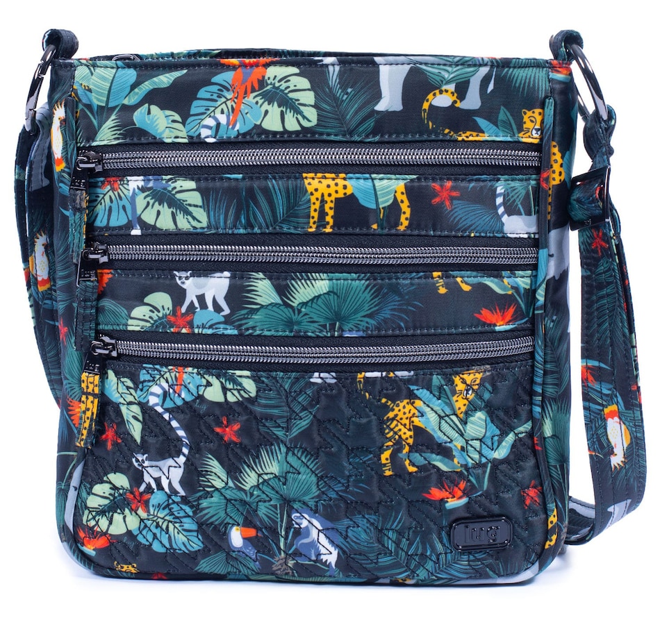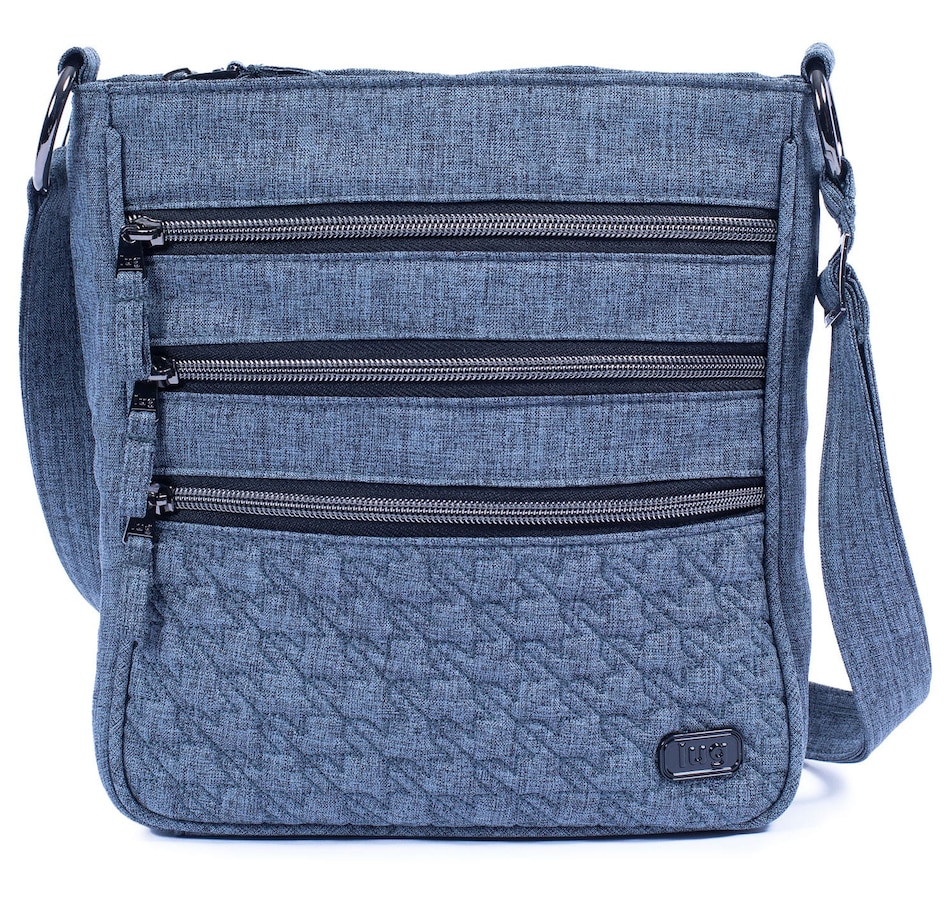 This crossbody from Lug features a main zipper compartment, three front zipper pockets, two back slip pockets with magnetic snap closures, and an adjustable crossbody strap.