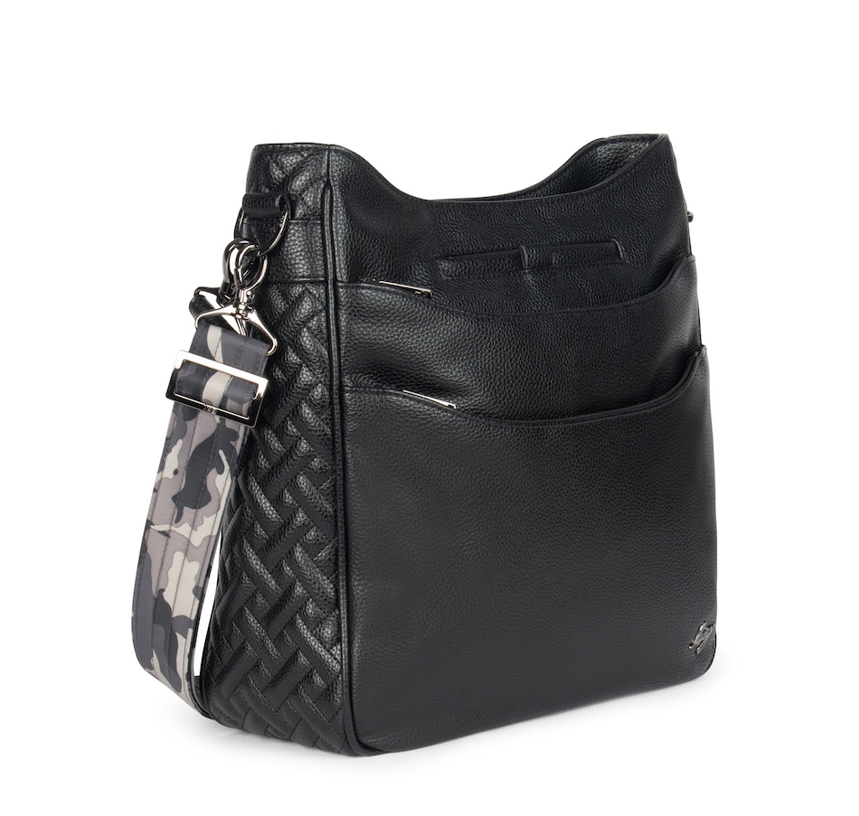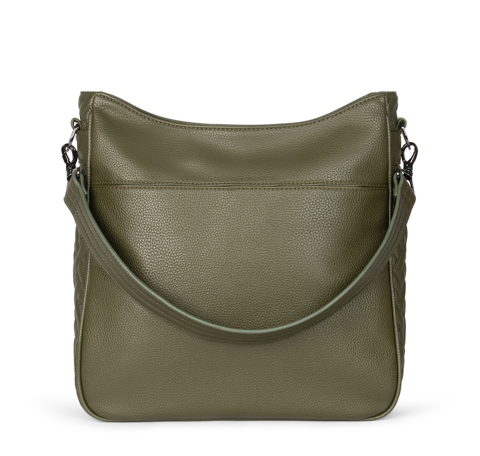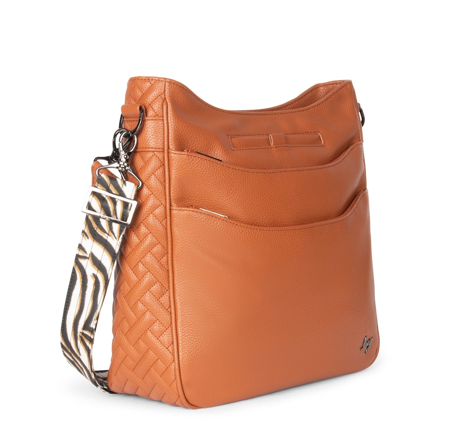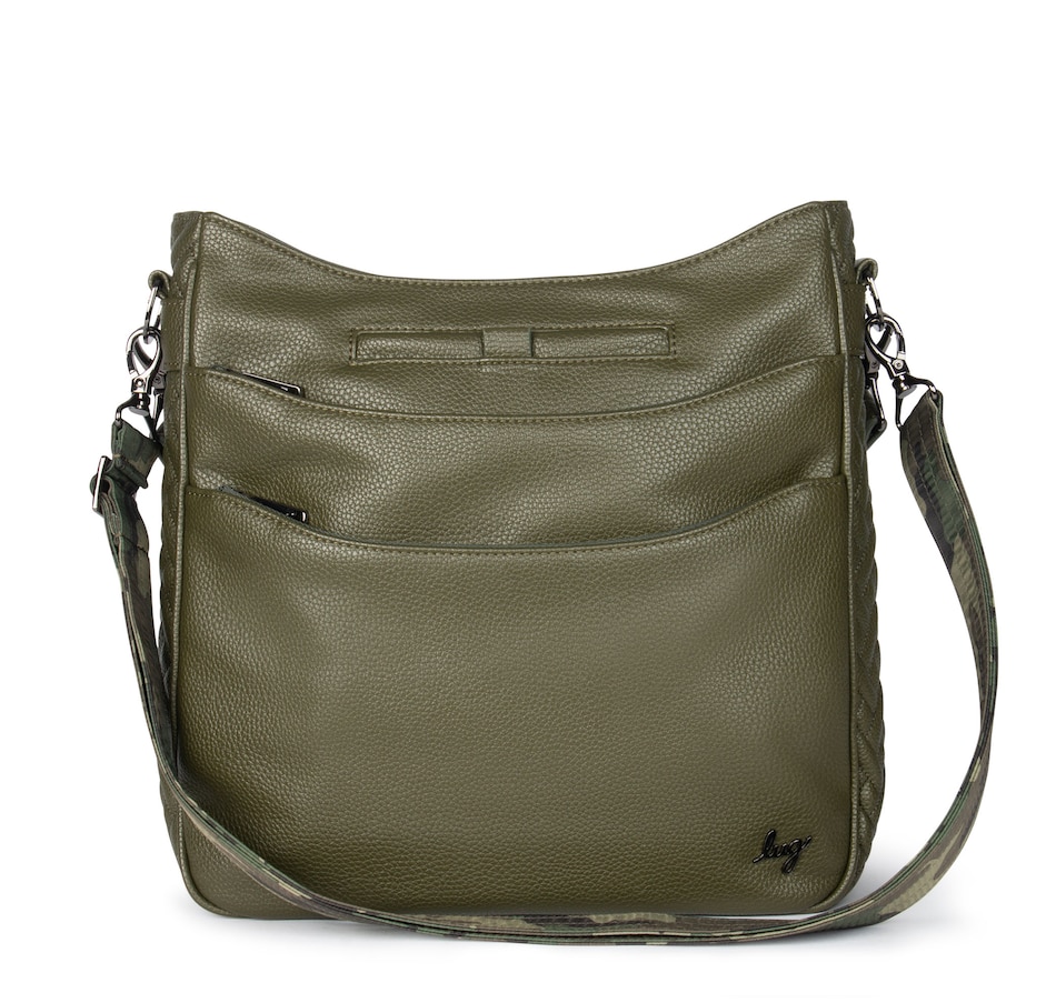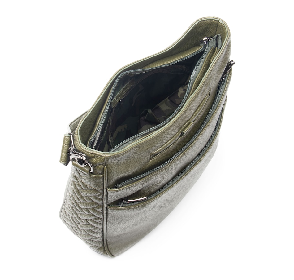 • Exterior features: One main zipper compartment, one front soft lined slip pocket with magnetic closure, two front zipper pockets, one back slip pocket with magnetic closure, removable vegan leather strap, adjustable and removable printed crossbody strap, includes dust bag with drawstring closure, PETA-approved vegan leather
