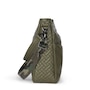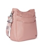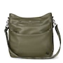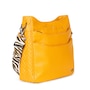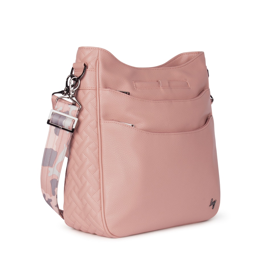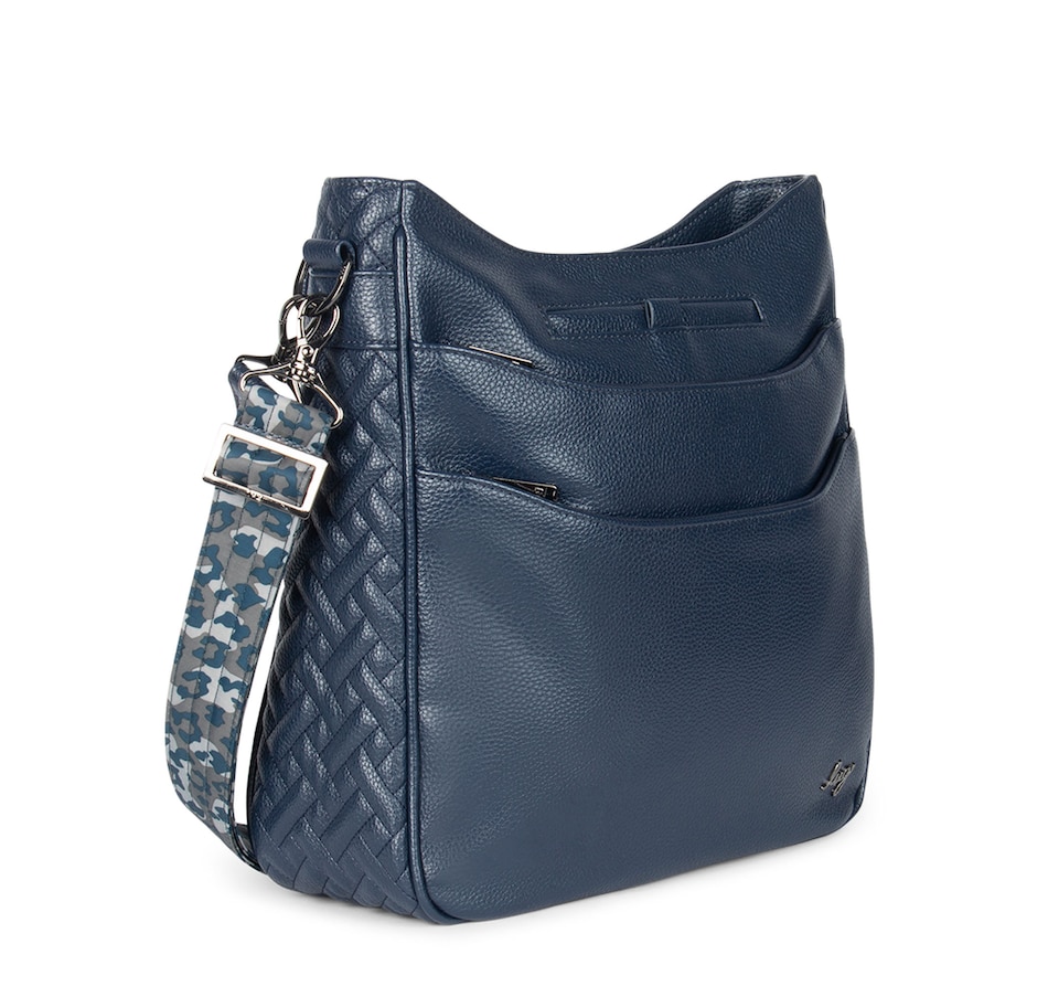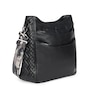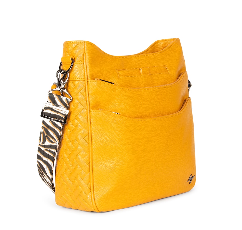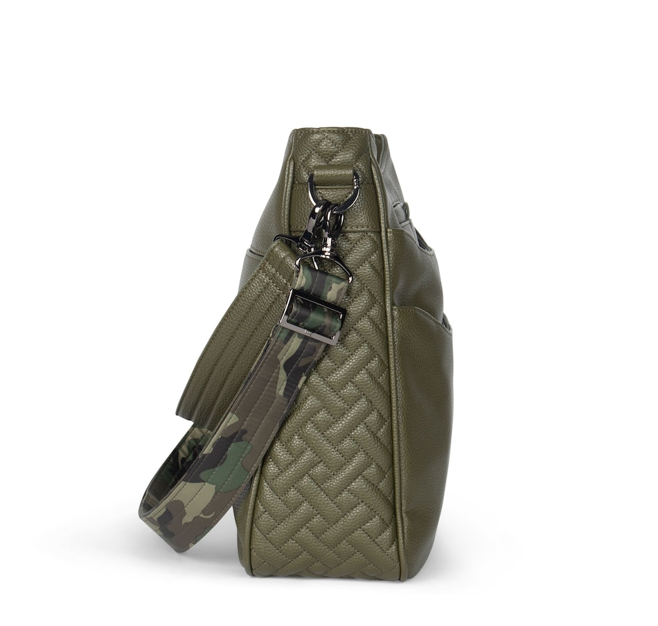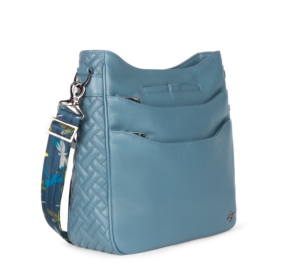 • Exterior features: One main zipper compartment, one front soft lined slip pocket with magnetic closure, two front zipper pockets, one back slip pocket with magnetic closure, removable vegan leather strap, adjustable and removable printed crossbody strap, includes dust bag with drawstring closure, PETA-approved vegan leather