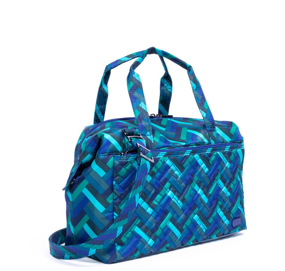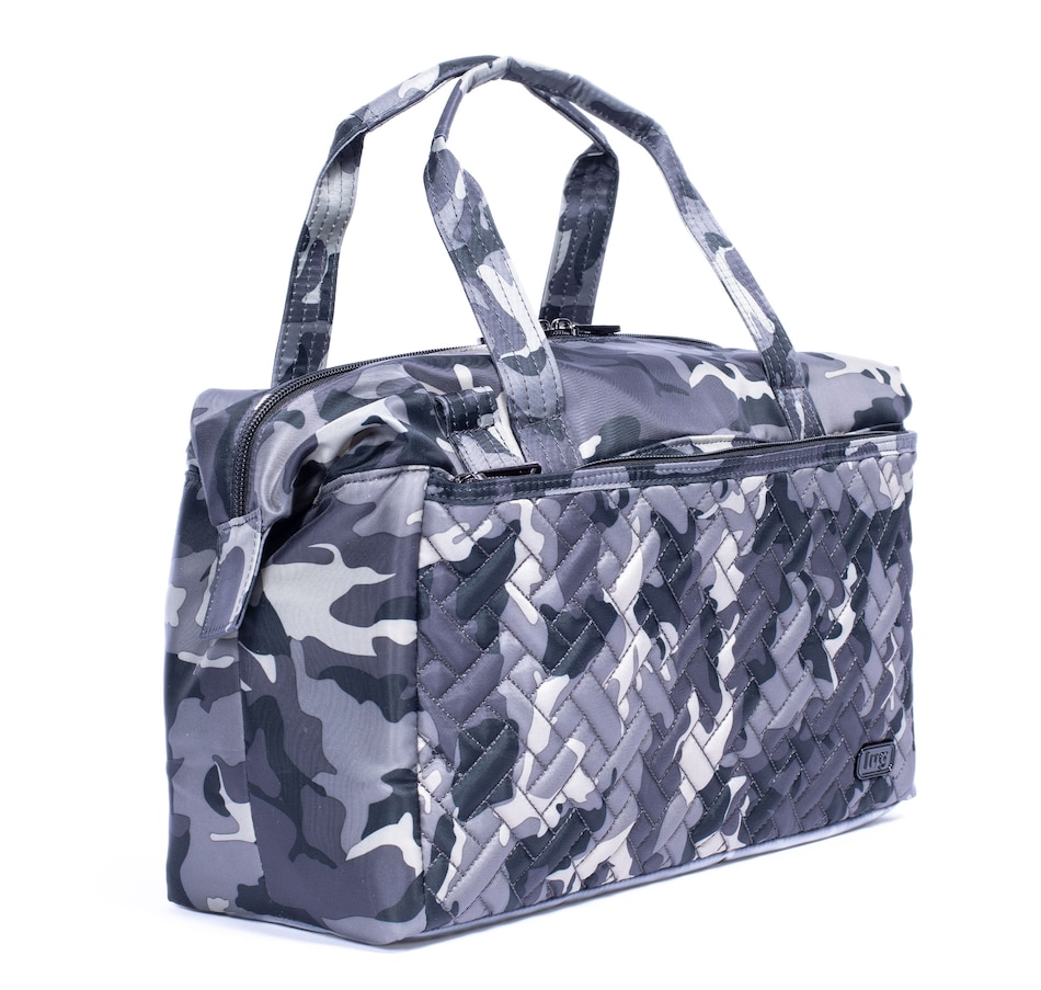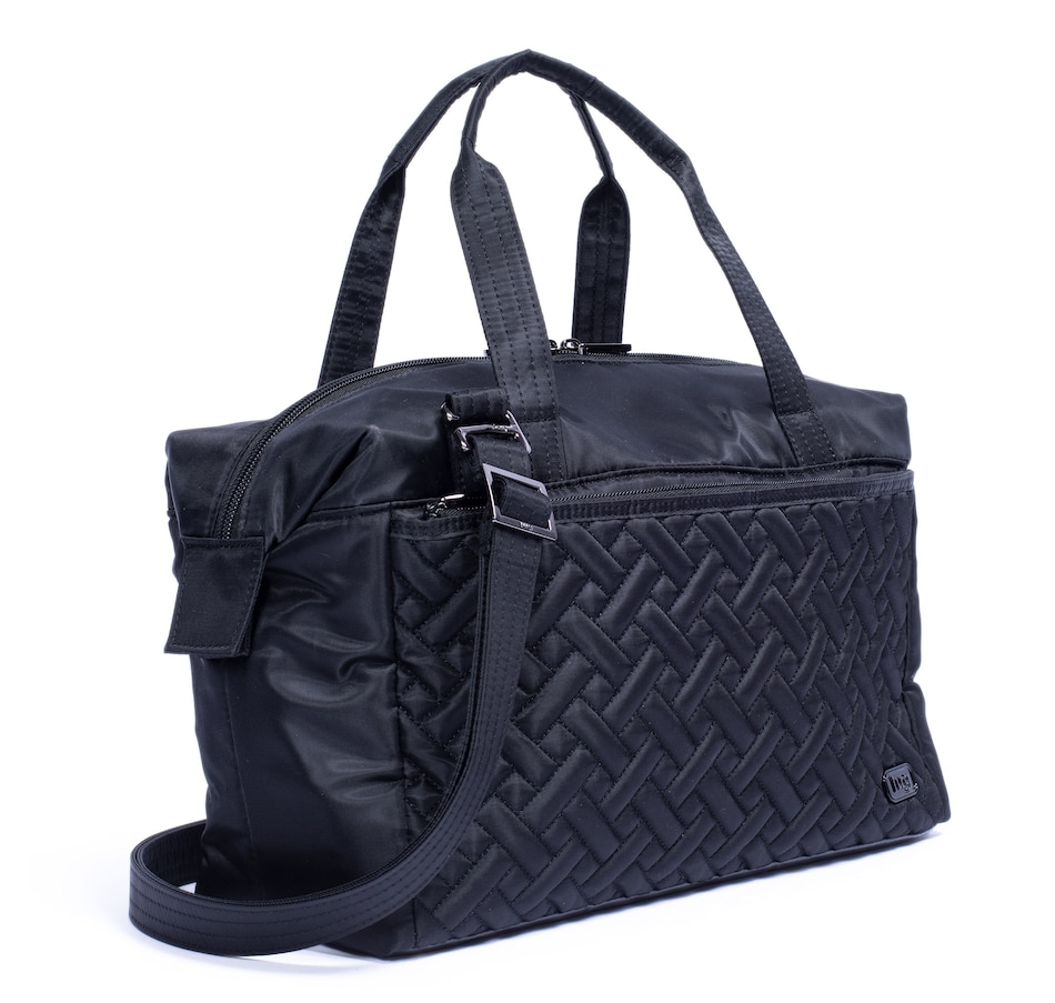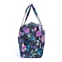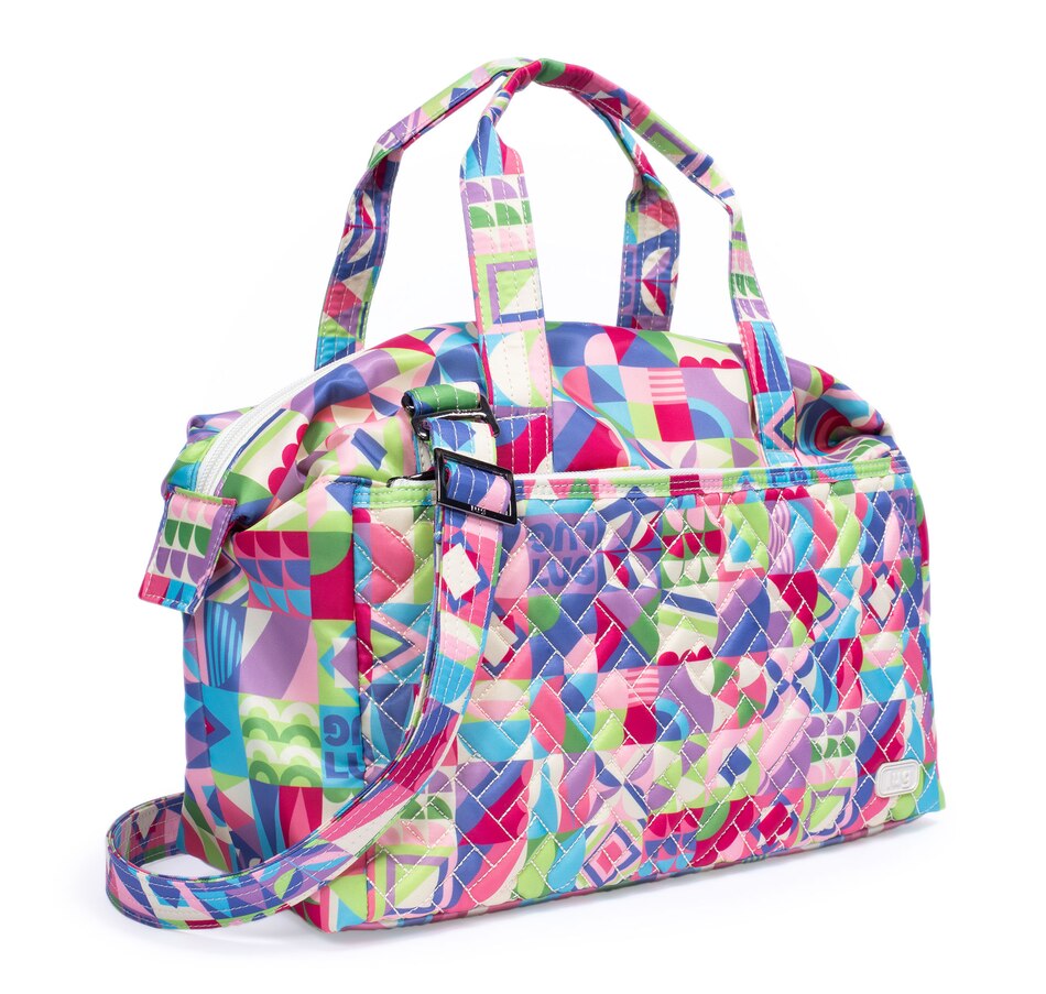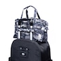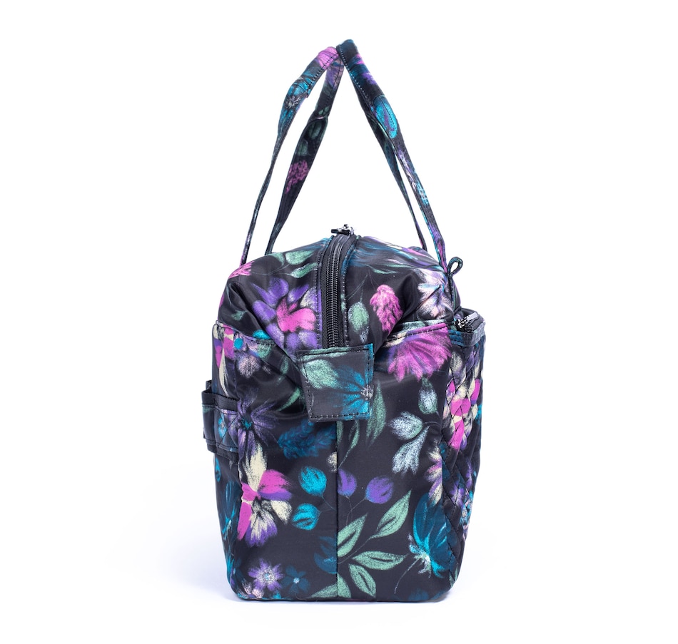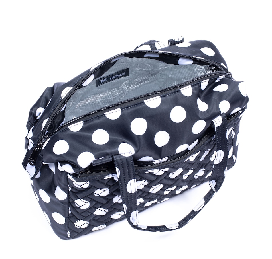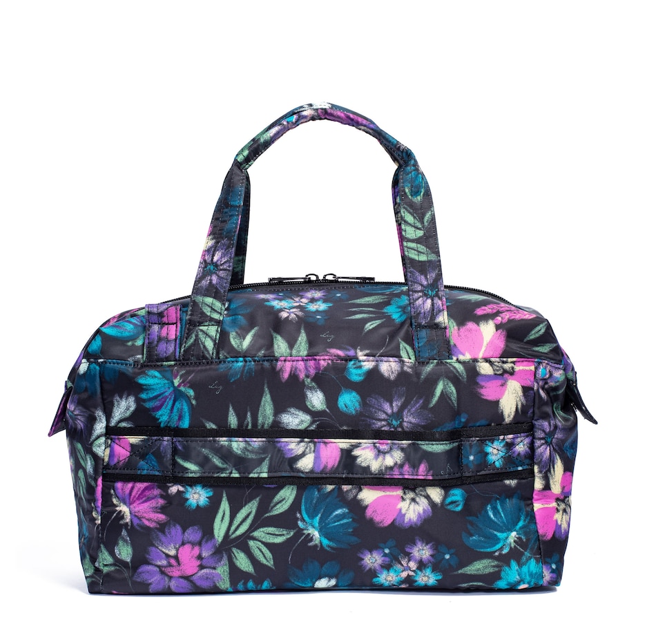 • Exterior Features: One main insulated compartment with top zipper closure, one front zipper pocket, trolley sleeve, two side snap buttons, tote handles, adjustable and removable crossbody strap, wipeable bottom