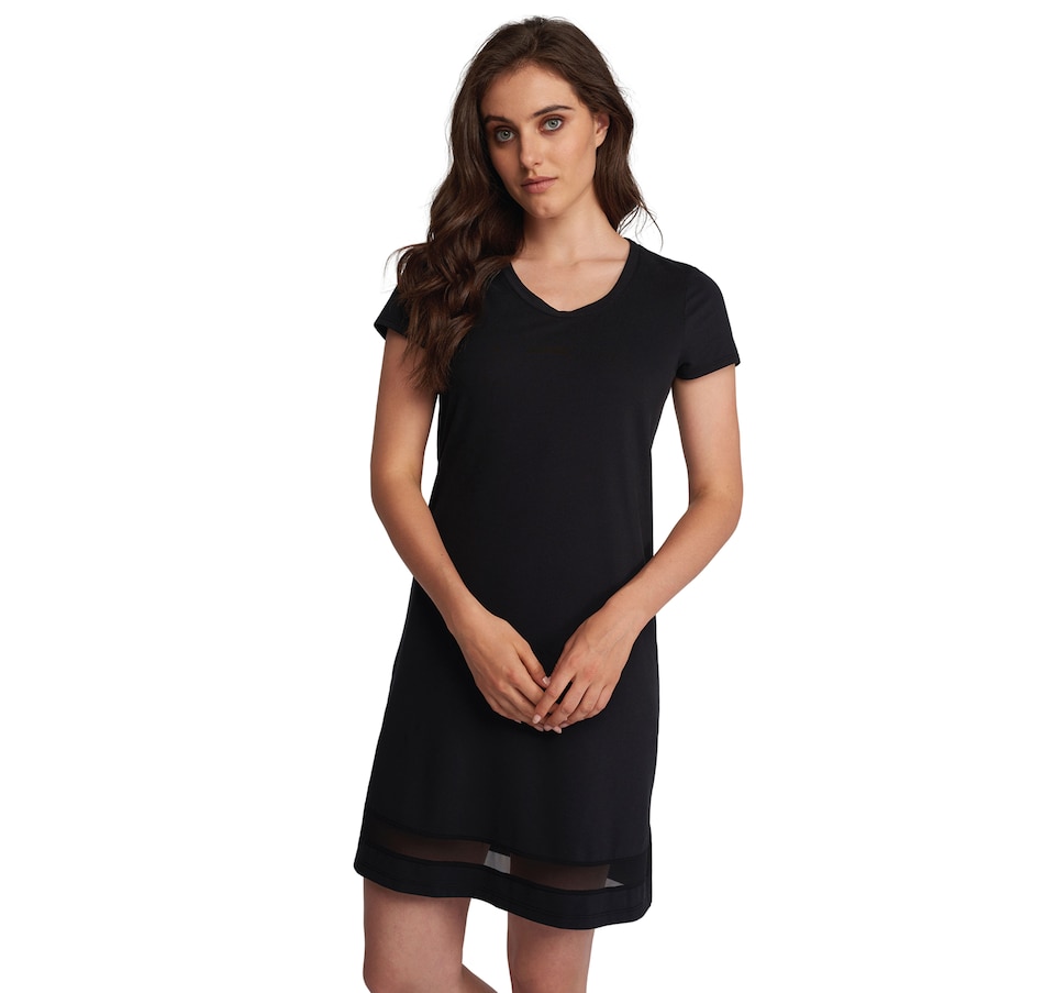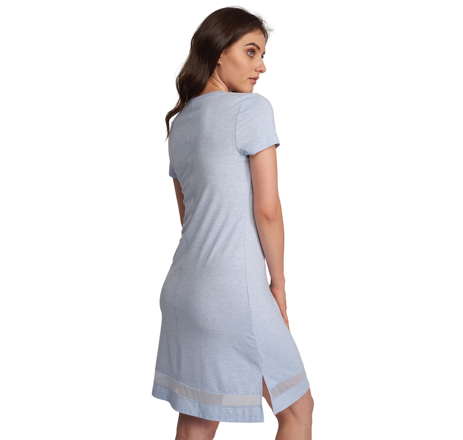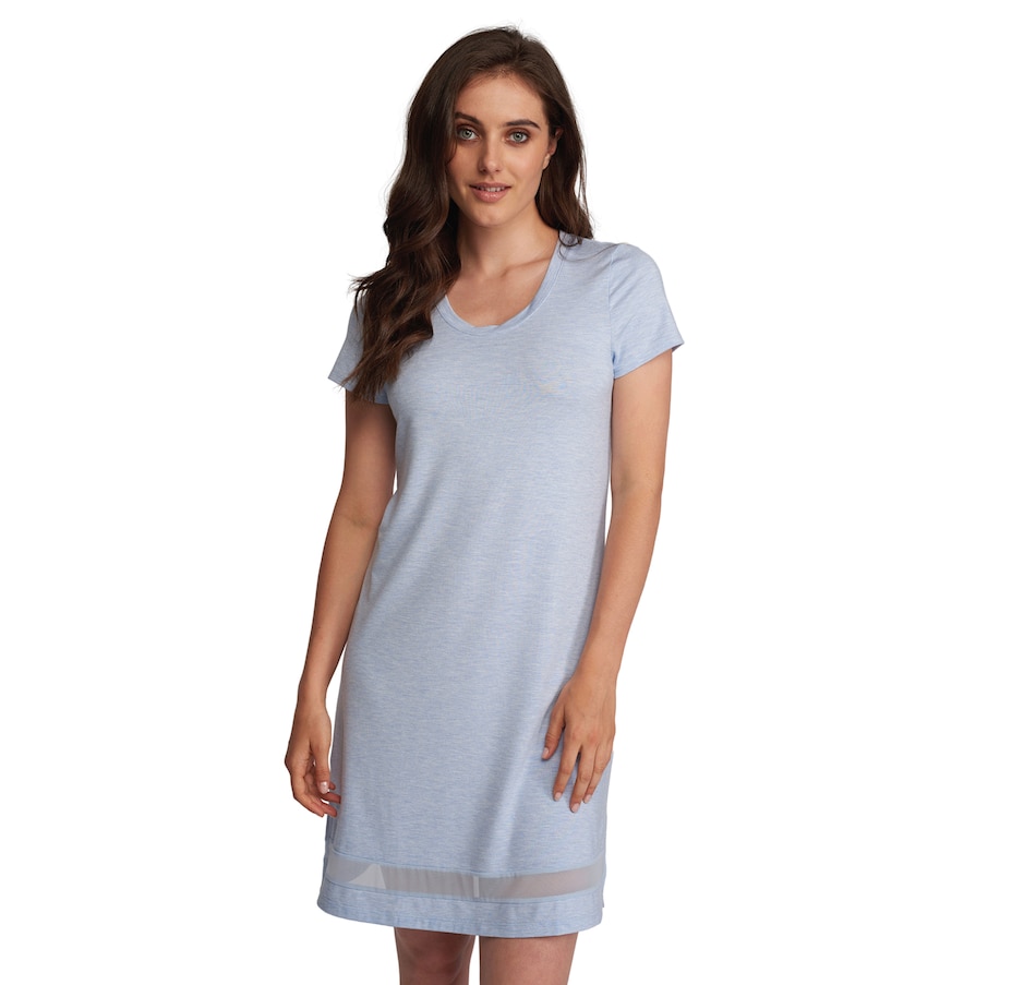 Kiss night sweats goodbye with this short sleeve nightie featuring a beautiful mesh trim along the hem. It offers a flattering short sleeve and slight shape at the waist for comfort and elegance.