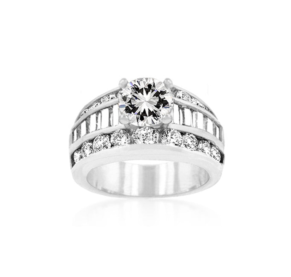 The Luxurious Engagement Ring features a brilliant round cut cubic zirconia in a prong setting displayed on the shoulde assortment of shimmering baguettes and round cut cubic zirconia in a channel setting. Genuine Plating is achieved using an electroplating process that coats the item with heavy layers of a close cousin to platinum which gives our jewelry a platinum luster.