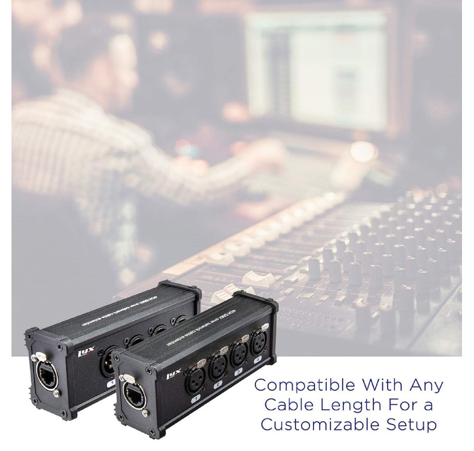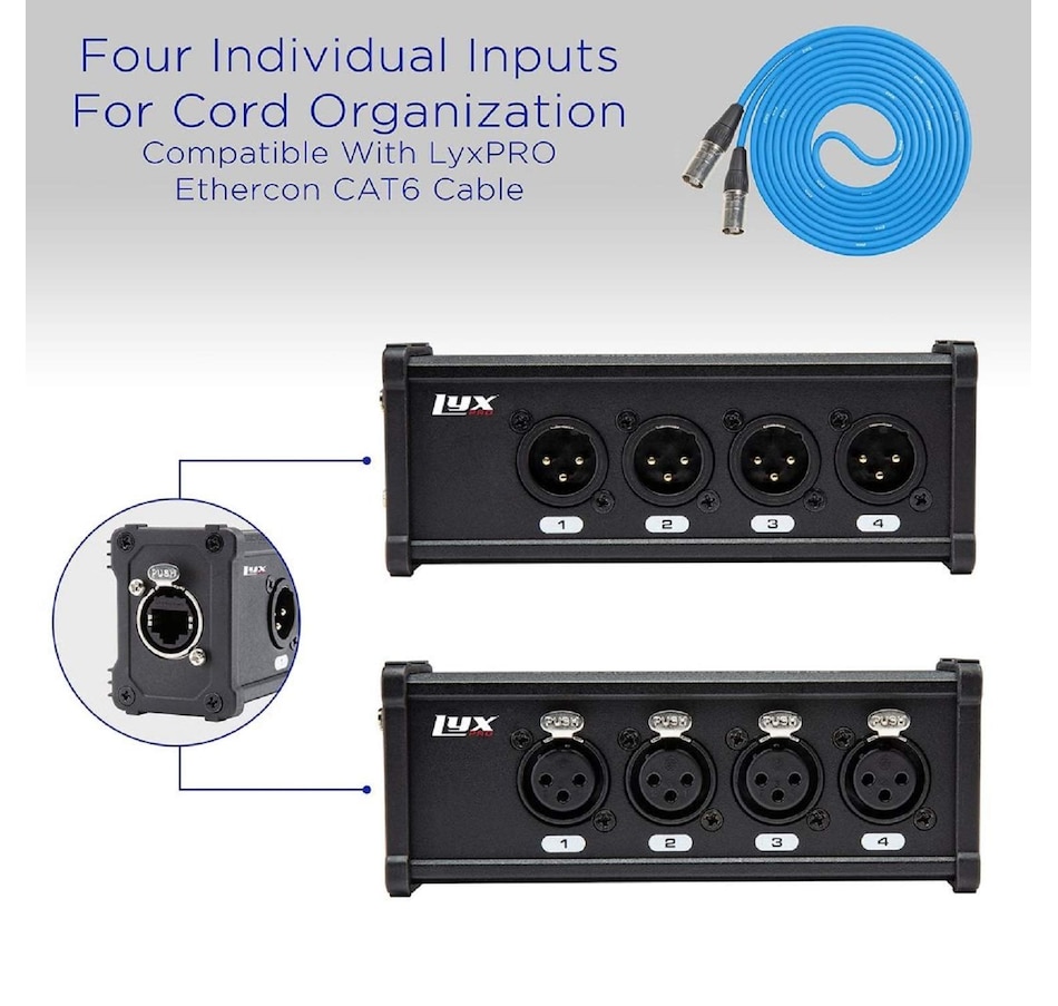 For professional stage & sound equipment, the LyxPro 4-Channel XLR Patchbay Extender Digital Snake 2 Pack makes the perfect connection. With this XLR Snake Pair you can enjoy effortless organization as you keep cables separated, neat, and out of sight, creating stress-free setup at all your gigs. Each audio snake rack extender comes with four individual 3-pin inputs to transmit four channels, and is compatible with XLR audio based systems, AES, and DMX. For even more efficiency and durability, you can also connect to a single etherCON Cat6 stage power snake network cable, with a maximum extension of up to 330 feet on stage or in the recording studio. Best of all, these 4 Channel XLR Cable delivers crystal clear, interference-free sound and balanced performance in any venue. This pro audio snake features quick and easy setup and fast, convenient breakdown, you’ll love the extra organization and safety for a variety of audio and video applications!