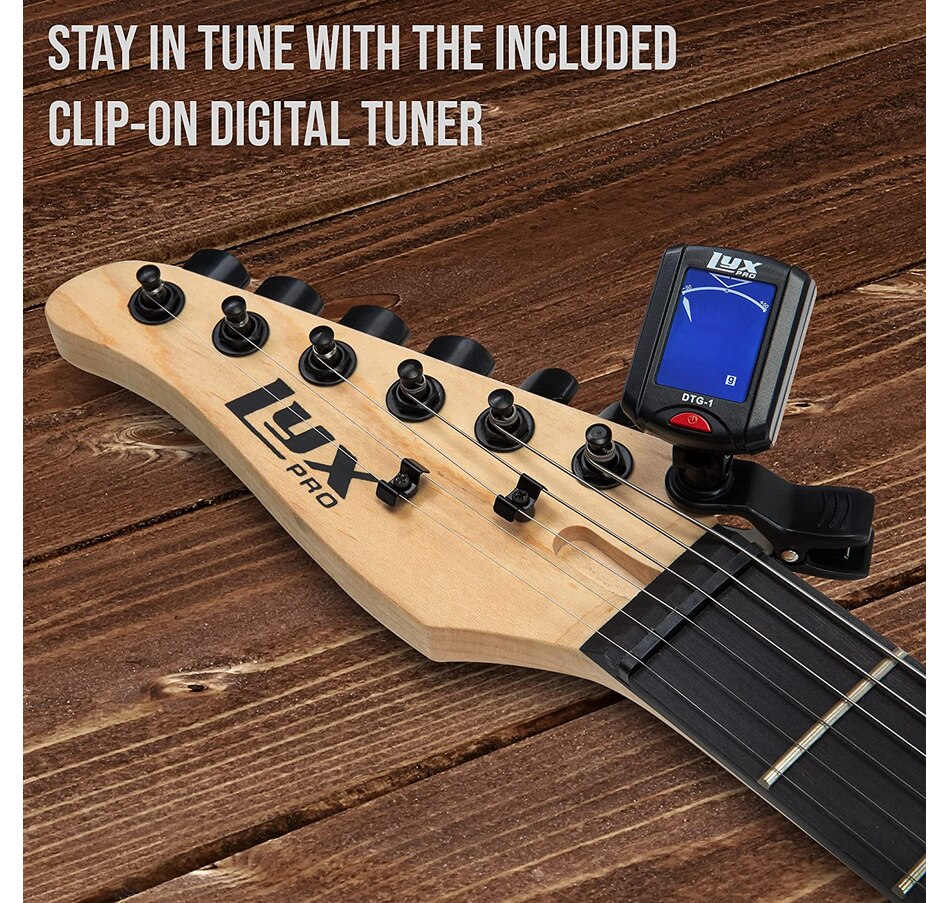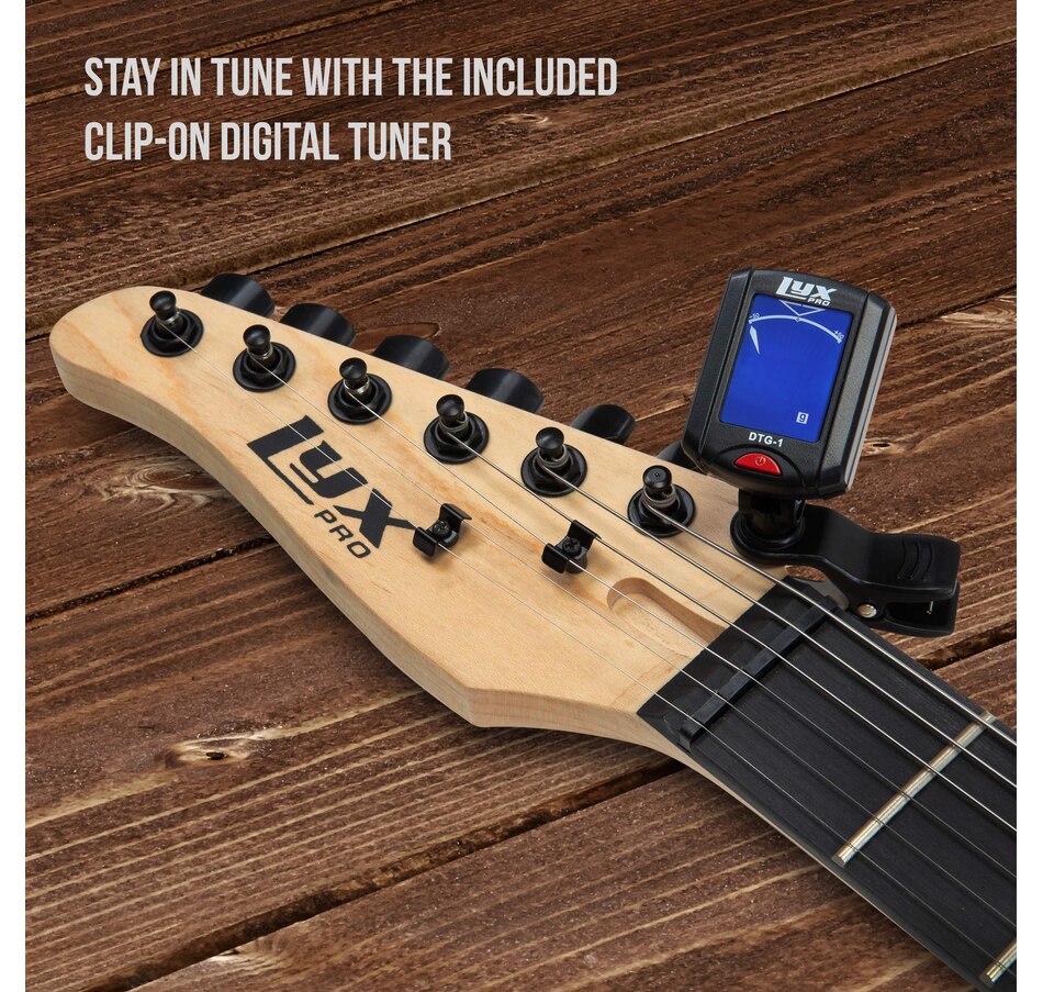 The complete left handed guitar starter kit for the novice guitarist. This all-in-one Left Handed Electric Guitar & Starter Kit comes with everything you need to become a rock god, all from the comfort of home. In addition to the full size, 39” Electric Guitar beginner kits in your choice of colors, you’ll get 6 strings, 2 picks, a tremolo bar, a guitar cable, a shoulder strap, and a handy carry bag. The electric guitar kit also includes a clip-on 440Hz Digital Tuner that ensures your instrument is perfectly tuned before you start playing.